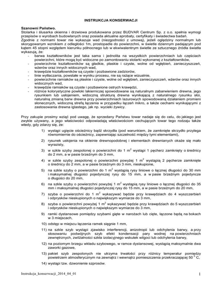INSTRUKCJA KONSERWACJI Szanowni Państwo. Stolarka i ślusarka okienna i drzwiowa produkowana przez BUDVAR Centrum Sp. z o.o. spełnia wymogi przepisów o wyrobach budowlanych oraz posiada aktualne aprobaty, certyfikaty i świadectwa badań. Zgodnie z normami towar nie wykazuje wad (niezgodności z umową), jeżeli oględziny normalnym lub skorygowanym wzrokiem z odległości 1m, prostopadle do powierzchni, w świetle dziennym padającym pod kątem 45 stopni względem kierunku północnego lub w ekwiwalentnym świetle ze sztucznego źródła światła wykazują, że: - barwa kształtowników jest taka sama i jednolita na wszystkich powierzchniach lub częściach powierzchni, które mogą być widoczne po zamontowaniu stolarki wykonanej z kształtowników, - powierzchnie kształtowników są gładkie, płaskie i czyste, wolne od wgłębień, zanieczyszczeń, wżerów oraz innych widocznych wad, - krawędzie kształtowników są czyste i pozbawione zadziorów, - linie wytłaczania, powstałe w wyniku procesu, nie są rażące wizualnie, - powierzchnie ramiaków są płaskie i czyste, wolne od wgłębień, zanieczyszczeń, wżerów oraz innych widocznych wad, - krawędzie ramiaków są czyste i pozbawione ostrych krawędzi, - różnice kolorystyczne powłoki lakierniczej spowodowane są naturalnym zabarwieniem drewna, jego rysunkiem lub usłojeniem, widoczną strukturą drewna wynikającą z naturalnego rysunku słoi, naturalną zmianą barw drewna przy powierzchniach lazurowych spowodowaną działaniem promieni słonecznych, widoczną strefą łączenia w przypadku łączeń mikro, a także cechami wynikającymi z zastosowania drewna iglastego, jak np. wycieki żywicy. Przy zakupie prosimy wziąć pod uwagę, że sprzedany Państwu towar nadaje się do celu, do jakiego jest zwykle używany, a jego właściwości odpowiadają właściwościom cechujących towar tego rodzaju także wtedy, gdy zdarzy się, że: 1) wystąpi ugięcie ościeżnicy bądź skrzydła (pod warunkiem, że zamknięte skrzydło przylega równomiernie do ościeżnicy, zapewniając szczelność między tymi elementami), 2) rysunek usłojenia na okleinie drewnopodobnej i elementach drewnianych okaże się mało wyrazisty, 2 3) w szkle szyby zespolonej o powierzchni do 1 m wystąpi 1 pęcherz zamknięty o średnicy do 2 mm, a w pasie brzeżnym do 3 mm, 2 4) w szkle szyby zespolonej o powierzchni powyżej 1 m wystąpią 2 pęcherze zamknięte o średnicy do 2 mm, a w pasie brzeżnym do 3 mm, nieskupione, 2 5) na szkle szyby o powierzchni do 1 m wystąpią rysy liniowe o łącznej długości do 30 mm i maksymalnej długości pojedynczej rysy do 15 mm, a w pasie brzeżnym pojedyncze o długości do 20 mm, 2 6) na szkle szyby o powierzchni powyżej 1 m wystąpią rysy liniowe o łącznej długości do 35 mm i maksymalnej długości pojedynczej rysy do 15 mm, a w pasie brzeżnym do 20 mm, 2 7) szyba o powierzchni do 1 m wykazywać będzie przy krawędziach do 4 wyszczerbień i odprysków nieskupionych o największym wymiarze do 3 mm, 2 8) szyba o powierzchni powyżej 1 m wykazywać będzie przy krawędziach do 5 wyszczerbień i odprysków nieskupionych o największym wymiarze do 3 mm, 9) ramki dystansowe pomiędzy szybami gięte w narożach lub cięte, łączone będą na bokach w 3 miejscach, 10) odstęp w miejscu łączenia ramek sięgnie 1 mm, 11) na szkle szyb wystąpi zjawisko interferencji, anizotropii lub odchylenia barwy, a przy stosowaniu podwójnych szyb efekt kondensacji pary wodnej na powierzchniach zewnętrznych, zwilżalności szkła izolacyjnego wskutek wilgoci lub odchylenia barwy, 12) na poziomym brzegu wkładu szybowego, w ramce dystansowej, wystąpią maksymalnie dwa zaworki gazowe, 13) pakiet szyb zespolonych nie utrzyma trwałości przy różnicy temperatur pomiędzy o powietrzem atmosferycznym na zewnątrz i wewnątrz pomieszczenia przekraczającej 50 C, 14) wystąpi tzw. dzwonienie szprosów. Instrukcja_konserwacji_2014_04_01 1 Aby zapewnić sobie pełne wykorzystanie wyprodukowanych przez nas wyrobów, powinni Państwo przy ich użytkowaniu zastosować się do kilku ważnych rad znajdujących się poniżej. Należy zwracać uwagę na zanieczyszczenia powstałe w czasie montażu okna lub drzwi np. zabrudzenia zaprawami. Może dojść tu do powstania wżerów, których nie da się usunąć. Świeże odpryski zaprawy należy usuwać czystą wodą. Nieodpowiedni sposób usuwania stwardniałych resztek zaprawy może doprowadzić do porysowania profili. Z tego względu należy resztki te usuwać przez delikatne ostukiwanie drewnianą lub plastikową szpachelką. Pozostające w okuciach i uszczelkach resztki zaprawy powodują zakłócenie funkcjonowania wyrobu, muszą być więc stamtąd usunięte. Szczególną uwagę należy poświęcić oczyszczeniu otworów odwadniających, znajdujących się w dolnej części ramy okna oraz zabezpieczeniu elementów aluminiowych (okapników) – wżerów po zaprawie nie usunie się. Powierzchnię elementów drewnianych należy dwa razy w roku gruntownie umyć czystą wodą, aby usunąć kurz, zanieczyszczenia insektami oraz podobne zabrudzenia. Zanieczyszczenia tego rodzaju mogą powodować rozwijanie się zielenic oraz grzybów. Po montażu, a potem dwa razy w roku (ok. co 6 miesięcy)- ale nie w okresie mrozów elementy drewniane pokryte powłoką malarską należy pielęgnować środkiem „GORI – zestaw pielęgnacji”. UWAGA Po zamontowaniu okien lub drzwi należy pamiętać o niezwłocznym usunięciu taśmy ochronnej z kształtowników i elementów drewnianych. Ponieważ profile okienne i drzwiowe mają gładką powierzchnię, są łatwe w czyszczeniu i pielęgnacji, najlepiej do czyszczenia używać lekkiego roztworu środka myjącego na bazie mydła. Przy jego pomocy można szybko usunąć zanieczyszczenia spowodowane przez kurz i deszcz. W wypadku silniejszych zabrudzeń spowodowanych pisakiem, gumą, kredką, rdzą, itp.; do czyszczenia zalecane są środki pior