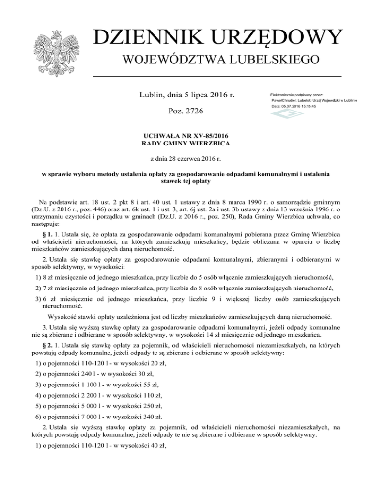 DZIENNIK URZĘDOWY WOJEWÓDZTWA LUBELSKIEGO Lublin, dnia 5 lipca 2016 r. Elektronicznie podpisany przez: Paweł Chruściel; Lubelski Urząd Wojewódzki w Lublinie Poz. 2726 Data: 05.07.2016 15:15:45 UCHWAŁA NR XV-85/2016 RADY GMINY WIERZBICA z dnia 28 czerwca 2016 r. w sprawie wyboru metody ustalenia opłaty za gospodarowanie odpadami komunalnymi i ustalenia stawek tej opłaty Na podstawie art. 18 ust. 2 pkt 8 i art. 40 ust. 1 ustawy z dnia 8 marca 1990 r. o samorządzie gminnym (Dz.U. z 2016 r., poz. 446) oraz art. 6k ust. 1 i ust. 3, art. 6j ust. 2a i ust. 3b ustawy z dnia 13 września 1996 r. o utrzymaniu czystości i porządku w gminach (Dz.U. z 2016 r., poz. 250), Rada Gminy Wierzbica uchwala, co następuje: § 1. 1. Ustala się, że opłata za gospodarowanie odpadami komunalnymi pobierana przez Gminę Wierzbica od właścicieli nieruchomości, na których zamieszkują mieszkańcy, będzie obliczana w oparciu o liczbę mieszkańców zamieszkujących daną nieruchomość. 2. Ustala się stawkę opłaty za gospodarowanie odpadami komunalnymi, zbieranymi i odbieranymi w sposób selektywny, w wysokości: 1) 8 zł miesięcznie od jednego mieszkańca, przy liczbie do 5 osób włącznie zamieszkujących nieruchomość, 2) 7 zł miesięcznie od jednego mieszkańca, przy liczbie do 8 osób włącznie zamieszkujących nieruchomość, 3) 6 zł miesięcznie od jednego mieszkańca, przy liczbie 9 i większej liczby osób zamieszkujących nieruchomość. Wysokość stawki opłaty uzależniona jest od liczby mieszkańców zamieszkujących daną nieruchomość. 3. Ustala się wyższą stawkę opłaty za gospodarowanie odpadami komunalnymi, jeżeli odpady komunalne nie są zbierane i odbierane w sposób selektywny, w wysokości 14 zł miesięcznie od jednego mieszkańca. § 2. 1. Ustala się stawkę opłaty za pojemnik, od właścicieli nieruchomości niezamieszkałych, na których powstają odpady komunalne, jeżeli odpady te są zbierane i odbierane w sposób selektywny: 1) o pojemności 110-120 l - w wysokości 20 zł, 2) o pojemności 240 l - w wysokości 30 zł, 3) o pojemności 1 100 l - w wysokości 55 zł, 4) o pojemności 2 200 l - w wysokości 110 zł, 5) o pojemności 5 000 l - w wysokości 250 zł, 6) o pojemności 7 000 l - w wysokości 340 zł. 2. Ustala się wyższą stawkę opłaty za pojemnik, od właścicieli nieruchomości niezamieszkałych, na których powstają odpady komunalne, jeżeli odpady te nie są zbierane i odbierane w sposób selektywny: 1) o pojemności 110-120 l - w wysokości 40 zł, Dziennik Urzędowy Województwa Lubelskiego –2– Poz. 2726 2) o pojemności 240 l - w wysokości 60 zł, 3) o pojemności 1 100 l - w wysokości 110 zł, 4) o pojemności 2 200 l - w wysokości 220 zł, 5) o pojemności 5 000 l - w wysokości 500 zł, 6) o pojemności 7 000 l - w wysokości 680 zł. § 3. 1. Ustala się roczną, ryczałtową stawkę opłaty za gospodarowanie odpadami komunalnymi od nieruchomości, na których znajdują się domki letniskowe, lub innych nieruchomości wykorzystywanych na cele rekreacyjno-wypoczynkowe, wykorzystywanych jedynie przez część roku, na których odpady zbierane są i odbierane w sposób selektywny, w wysokości 120 zł za rok od domku letniskowego lub od innej nieruchomości wykorzystywanej na cele rekreacyjno-wypoczynkowe. 2. Ustala się wyższą roczną, ryczałtową stawkę opłaty za gospodarowanie odpadami komunalnymi od nieruchomości, na których znajdują się domki letniskowe, lub innych nieruchomości wykorzystywanych na cele rekreacyjno-wypoczynkowe, wykorzystywanych jedynie przez część roku, na których odpady nie są zbierane i odbierane w sposób selektywny, w wysokości 240 zł za rok od domku letniskowego lub od innej nieruchomości wykorzystywanej na cele rekreacyjno-wypoczynkowe. § 4. Traci moc uchwała Nr XXV-111/2012 Rady Gminy Wierzbica z dnia 28 grudnia 2012 r. w sprawie wyboru metody ustalenia opłaty za gospodarowanie odpadami komunalnymi oraz ustalenia wysokości tej opłaty i ustalenia stawki opłaty za pojemnik (Dz. Urz. Woj. Lub. z 2013 r., poz. 796), zmieniona uchwałą Nr XXVII-133/2013 Rady Gminy Wierzbica z dnia 25 marca 2013 r. (Dz. Urz. Woj. Lub. z 2013 r., poz. 1914). § 5. Wykonanie uchwały powierza się Wójtowi Gminy. § 6. Uchwała podlega ogłoszeniu w Dzienniku Urzędowym Województwa Lubelskiego. § 7. Uchwała wchodzi w życie z dniem 1 sierpnia 2016 r. Przewodniczący Rady Gminy Wierzbica Krzysztof Wojewódzki