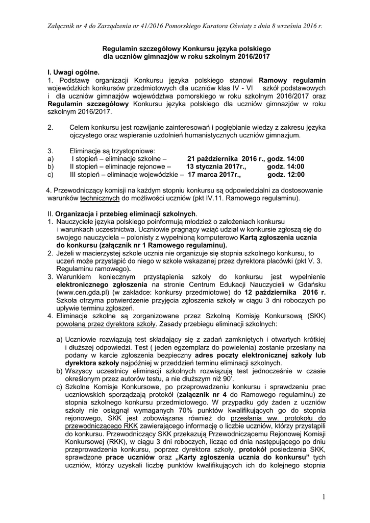 Załącznik nr 4 do Zarządzenia nr 41/2016 Pomorskiego Kuratora Oświaty z dnia 8 września 2016 r. Regulamin szczegółowy Konkursu języka polskiego dla uczniów gimnazjów w roku szkolnym 2016/2017 I. Uwagi ogólne. 1. Podstawę organizacji Konkursu języka polskiego stanowi Ramowy regulamin wojewódzkich konkursów przedmiotowych dla uczniów klas IV - VI szkół podstawowych i dla uczniów gimnazjów województwa pomorskiego w roku szkolnym 2016/2017 oraz Regulamin szczegółowy Konkursu języka polskiego dla uczniów gimnazjów w roku szkolnym 2016/2017. 2. Celem konkursu jest rozwijanie zainteresowań i pogłębianie wiedzy z zakresu języka ojczystego oraz wspieranie uzdolnień humanistycznych uczniów gimnazjum. 3. a) b) c) Eliminacje są trzystopniowe: I stopień – eliminacje szkolne – 21 października 2016 r., godz. 14:00 II stopień – eliminacje rejonowe – 13 stycznia 2017r., godz. 14:00 III stopień – eliminacje wojewódzkie – 17 marca 2017r., godz. 12:00 4. Przewodniczący komisji na każdym stopniu konkursu są odpowiedzialni za dostosowanie warunków technicznych do możliwości uczniów (pkt IV.11. Ramowego regulaminu). II. Organizacja i przebieg eliminacji szkolnych. 1. Nauczyciele języka polskiego poinformują młodzież o założeniach konkursu i warunkach uczestnictwa. Uczniowie pragnący wziąć udział w konkursie zgłoszą się do swojego nauczyciela – polonisty z wypełnioną komputerowo Kartą zgłoszenia ucznia do konkursu (załącznik nr 1 Ramowego regulaminu). 2. Jeżeli w macierzystej szkole ucznia nie organizuje się stopnia szkolnego konkursu, to uczeń może przystąpić do niego w szkole wskazanej przez dyrektora placówki (pkt V. 3. Regulaminu ramowego). 3. Warunkiem koniecznym przystąpienia szkoły do konkursu jest wypełnienie elektronicznego zgłoszenia na stronie Centrum Edukacji Nauczycieli w Gdańsku (www.cen.gda.pl) (w zakładce: konkursy przedmiotowe) do 12 października 2016 r. Szkoła otrzyma potwierdzenie przyjęcia zgłoszenia szkoły w ciągu 3 dni roboczych po upływie terminu zgłoszeń. 4. Eliminacje szkolne są zorganizowane przez Szkolną Komisję Konkursową (SKK) powołaną przez dyrektora szkoły. Zasady przebiegu eliminacji szkolnych: a) Uczniowie rozwiązują test składający się z zadań zamkniętych i otwartych krótkiej i dłuższej odpowiedzi. Test ( jeden egzemplarz do powielenia) zostanie przesłany na podany w karcie zgłoszenia bezpieczny adres poczty elektronicznej szkoły lub dyrektora szkoły najpóźniej w przeddzień terminu eliminacji szkolnych. b) Wszyscy uczestnicy eliminacji szkolnych rozwiązują test jednocześnie w czasie określonym przez autorów testu, a nie dłuższym niż 90’. c) Szkolne Komisje Konkursowe, po przeprowadzeniu konkursu i sprawdzeniu prac uczniowskich sporządzają protokół (załącznik nr 4 do Ramowego regulaminu) ze stopnia szkolnego konkursu przedmiotowego. W przypadku gdy żaden z uczniów szkoły nie osiągnął wymaganych 70% punktów kwalifikujących go do stopnia rejonowego, SKK jest zobowiązana również do przesłania ww. protokołu do przewodniczącego RKK zawierającego informację o liczbie uczniów, którzy przystąpili do konkursu. Przewodniczący SKK przekazują Przewodniczącemu Rejonowej Komisji Konkursowej (RKK), w ciągu 3 dni roboczych, licząc od dnia następującego po dniu przeprowadzenia konkursu, poprzez dyrektora szkoły, protokół posiedzenia SKK, sprawdzone prace uczniów oraz „Karty zgłoszenia ucznia do konkursu” tych uczniów, którzy uzyskali liczbę punktów kwalifikujących ich do kolejnego stopnia 1 Załącznik nr 4 do Zarządzenia nr 41/2016 Pomorskiego Kuratora Oświaty z dnia 8 września 2016 r. konkursu. Kopie protokołu przesłanego do RKK, SKK pozostawia w swojej dokumentacji. 5. Przewodniczący SKK przesyła protokół pocztą elektroniczną na adres przewodniczącej RKK), a testy uczniów zakwalifikowanych do stopnia rejonowego na adres Rejonowej Komisji Konkursowej niezwłocznie, najpóźniej do 26 października 2016 r. (adresy 10 komisji rejonowych wraz z nazwiskami przewodniczących RKK w załączeniu). 6. Rejonowa Komisja Konkursu języka polskiego po zweryfikowaniu prac uczniowskich kwalifikuje do II stopnia eliminacji uczniów (70% zdobytych punktów) na podstawie protokołu z odbytych eliminacji szkolnych oraz wyników dołączonych testów uczniów kwalifikowanych przez SKK. 7. Rejonowa Komisja Konkursowa (RKK) ustala listę uczestników II stopnia konkursu i umieszcza ją na stronie internetowej szkoły będącej siedzibą stopnia rejonowego Konkursu języka polskiego najpóźniej 7 listopada 2016 r. 8. Po upływie wyznaczonego terminu nie ulega zmianom lista uczestników stopnia rejonowego. 9. Wykaz komisji rejonowych Konkursu języka polskiego dla uczniów gimnazjum województwa pomorskiego: Lp. Rejon Nazwa i adres Imię i nazwisko Adres internetowy obejmuje szkoły przewodniczącej RKK strony szkolnej – siedziby RKK 1. Miasto Gdańsk Gimnazjum nr 27 Elżbieta Kowalik www.gim27gdansk. gimnazja Gdańsk – Morena 58-345-82-78 edu.pl nr: 2, 3, 4, 5, 6, ul. Gojawiczyńskiej [email protected] 7, 8, 9, 10, 11, 10 27, 28, 29, 30, Tel: 58-341-01-67 31, 32, 33, 38, 48, powiat kartuski Miasto Gdańsk (gimnazja nr: 1,12,13,14,15, 16,17,18,19, 20, 21, 23,24, 25, 26,30, 31, 33, 34; gimnazja niepubliczne Gdynia Sopot Gimnazjum nr 1 w Gdańsku Wrzeszczu ul. płk. Wilka Krzyżanowskiego Tel: 58=341-09-29 Dorota Kosek 58- 341-09-29 [email protected] www.gim1.internet dsl.pl Gimnazjum nr 24 (ZSO nr 1) w Gdyni, ul. Legionów 27 58- 622-18-33 Brygida Maciejewska 58- 622-18-33 brygida.maciejewska@gmail. com www.lo3.gdynia.pl 4. Powiat: wejherowski; Rumia, Reda Gimnazjum nr 1 w Wejherowie ul. Sobieskiego 300 58-672-25-49 Jolanta Eisner [email protected] www.gimnazjum1. com 5. Miasto Słupsk, powiaty: słupski ziemski, lęborski Gimnazjum nr 4 w Słupsku ul. Banacha 0-59-841-79-50 Beata Moćko 59-841-79-50 [email protected] www.