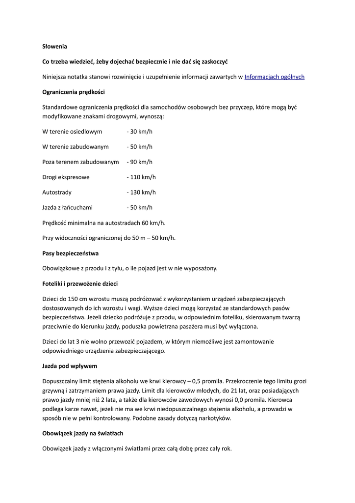 Słowenia Co trzeba wiedzieć, żeby dojechać bezpiecznie i nie dać się zaskoczyć Niniejsza notatka stanowi rozwinięcie i uzupełnienie informacji zawartych w Informacjach ogólnych Ograniczenia prędkości Standardowe ograniczenia prędkości dla samochodów osobowych bez przyczep, które mogą być modyfikowane znakami drogowymi, wynoszą: W terenie osiedlowym - 30 km/h W terenie zabudowanym - 50 km/h Poza terenem zabudowanym - 90 km/h Drogi ekspresowe - 110 km/h Autostrady - 130 km/h Jazda z łańcuchami - 50 km/h Prędkość minimalna na autostradach 60 km/h. Przy widoczności ograniczonej do 50 m – 50 km/h. Pasy bezpieczeństwa Obowiązkowe z przodu i z tyłu, o ile pojazd jest w nie wyposażony. Foteliki i przewożenie dzieci Dzieci do 150 cm wzrostu muszą podróżować z wykorzystaniem urządzeń zabezpieczających dostosowanych do ich wzrostu i wagi. Wyższe dzieci mogą korzystać ze standardowych pasów bezpieczeństwa. Jeżeli dziecko podróżuje z przodu, w odpowiednim foteliku, skierowanym twarzą przeciwnie do kierunku jazdy, poduszka powietrzna pasażera musi być wyłączona. Dzieci do lat 3 nie wolno przewozić pojazdem, w którym niemożliwe jest zamontowanie odpowiedniego urządzenia zabezpieczającego. Jazda pod wpływem Dopuszczalny limit stężenia alkoholu we krwi kierowcy – 0,5 promila. Przekroczenie tego limitu grozi grzywną i zatrzymaniem prawa jazdy. Limit dla kierowców młodych, do 21 lat, oraz posiadających prawo jazdy mniej niż 2 lata, a także dla kierowców zawodowych wynosi 0,0 promila. Kierowca podlega karze nawet, jeżeli nie ma we krwi niedopuszczalnego stężenia alkoholu, a prowadzi w sposób nie w pełni kontrolowany. Podobne zasady dotyczą narkotyków. Obowiązek jazdy na światłach Obowiązek jazdy z włączonymi światłami przez całą dobę przez cały rok. Mandaty i kary Płatne na miejscu w euro. Policja może zatrzymać paszport kierowcy do momentu otrzymania wpłaty. Zapłacenie mandatu na miejscu może oznaczać jego zmniejszenie o 50%. Przykładowe mandaty: przejazd przy czerwonym świetle: 300 euro; nierespektowanie światła pomarańczowego: 120 euro; brak pasów bezpieczeństwa: 120 euro; nieużywanie świateł do 160 euro; nieprawidłowe przewożenie dzieci: 200 euro. Brak winiety – 300 euro. Niewłaściwie zaparkowane samochody mogą zostać zablokowane lub odholowane. Motocykle i skutery Światła mijania obowiązkowo również w porze dziennej przez cały rok. Kask ochronny obowiązkowy dla kierowcy i pasażera. Dzieci do lat 12 nie mogą być przewożone jako pasażer. Ubezpieczenie Obowiązkowe ubezpieczenie OC. Paliwo, karty i opłaty Benzyna bezołowiowa (95 i 100 oktanów) - dostępna Olej napędowy - dostępny LPG – dostępny Benzyna ołowiowa – niedostępna; dostępny dodatek ołowiowy Nie ma zakazu transportu paliwa w kanistrach. Większość stacji paliwowych akceptuje karty płatnicze głównych systemów. Przed wyjazdem do Słowenii upewnij się u wydawcy karty, że będzie tam akceptowana. Opłaty za drogi reguluje system winiet – tygodniowych, miesięcznych i rocznych. Winiety można zakupić m.in. na stacjach benzynowych w Słowenii i sąsiednich krajach, a w Polsce w biurach turystyki PZM. Brak winietki będzie karany mandatem w wysokości od 300 euro. Obowiązkowe wyposażenie pojazdu - Kamizelka odblaskowa – obowiązkowa dla kierowcy bądź pasażera w przypadku wyjścia z pojazdu (np. awaria pojazdu). Nie dotyczy jednośladów. - Trójkąt ostrzegawczy – w przypadku ciągnięcia przyczepy – 2 szt. Nie dotyczy jednośladów. - Apteczka pierwszej pomocy - Zapasowe żarówki - Gaśnica - Wyposażenie zimowe – obowiązek dostosowania pojazdu do warunków zimowych spoczywa na kierowcy. To w szczególności obejmuje opony zimowe oznaczone M+S z bieżnikiem minimum 3mm. Łańcuchy śniegowe – obowiązkowe od 15 listopada do 15 marca lub dłużej, zależnie od warunków, w przypadku, kiedy pojazd nie ma kompletu opon zimowych M&S. Opony z kolcami – zakazane. Inne obowiązujące wymogi / przepisy Użycie trójkąta ostrzegawczego jest w razie wypadku obowiązkowe. Jeżeli wypadek ma miejsce w nocy, a światła awaryjne ulegną uszkodzeniu, należy dodatkowo użyć żółtego światła migającego lub świateł pozycyjnych pojazdu. Nie wolno mijać autobusu szkolnego, który zatrzymał się by wypuścić/wpuścić dzieci. Zakaz używania sygnałów dźwiękowych w terenie zabudowanym i w pobliżu szpitali, poza wypadkami bezpośredniego zagrożenia. Przy cofaniu należy włączyć światła awaryjne. Zastrzeżenie: Partnerstwo dla Bezpieczeństwa Drogowego dokłada wszelkich starań, żeby przedstawione informacje były aktualne i zgodne ze stanem faktycznym. Zalecamy jednak potwierdzenie aktualnego stanu na krajowych stronach odpowiednich instytucji dla odwiedzanych państw.