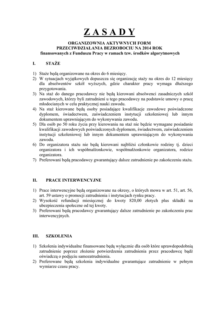 ZASADY ORGANIZOWNIA AKTYWNYCH FORM PRZECIWDZIAŁANIA BEZROBOCIU NA 2014 ROK finansowanych z Funduszu Pracy w ramach tzw. środków algorytmowych I. STAŻE 1) Staże będą organizowane na okres do 6 miesięcy. 2) W sytuacjach wyjątkowych dopuszcza się organizację staży na okres do 12 miesięcy dla absolwentów szkół wyższych, gdzie charakter pracy wymaga dłuższego przygotowania. 3) Na staż do danego pracodawcy nie będą kierowani absolwenci zasadniczych szkół zawodowych, którzy byli zatrudnieni u tego pracodawcy na podstawie umowy o pracę młodocianych w celu praktycznej nauki zawodu. 4) Na staż kierowane będą osoby posiadające kwalifikacje zawodowe poświadczone dyplomem, świadectwem, zaświadczeniem instytucji szkoleniowej lub innym dokumentem uprawniającym do wykonywania zawodu. 5) Dla osób po 50 roku życia przy kierowaniu na staż nie będzie wymagane posiadanie kwalifikacji zawodowych poświadczonych dyplomem, świadectwem, zaświadczeniem instytucji szkoleniowej lub innym dokumentem uprawniającym do wykonywania zawodu. 6) Do organizatora stażu nie będą kierowani najbliżsi członkowie rodziny tj. dzieci organizatora i ich współmałżonkowie, współmałżonkowie organizatora, rodzice organizatora. 7) Preferowani będą pracodawcy gwarantujący dalsze zatrudnienie po zakończeniu stażu. II. PRACE INTERWENCYJNE 1) Prace interwencyjne będą organizowane na okresy, o których mowa w art. 51, art. 56, art. 59 ustawy o promocji zatrudnienia i instytucjach rynku pracy. 2) Wysokość refundacji miesięcznej do kwoty 820,00 złotych plus składki na ubezpieczenia społeczne od tej kwoty. 3) Preferowani będą pracodawcy gwarantujący dalsze zatrudnienie po zakończeniu prac interwencyjnych. III. SZKOLENIA 1) Szkolenia indywidualne finansowane będą wyłącznie dla osób które uprawdopodobnią zatrudnienie poprzez złożenie potwierdzenia zatrudnienia przez pracodawcę bądź oświadczą o podjęciu samozatrudnienia. 2) Preferowane będą szkolenia indywidualne gwarantujące zatrudnienie w pełnym wymiarze czasu pracy. IV. ROBOTY PUBLICZNE 1) Organizowanie robót publicznych dla osób długotrwale bezrobotnych. 2) W sytuacjach szczególnych na wniosek ośrodka pomocy społecznej dopuszcza się organizację robót publicznych dla osób bezrobotnych z pozostałych grup, o których mowa w art. 57 ustawy o promocji zatrudnienia i instytucjach rynku pracy. 3) Wysokość refundacji do kwoty 1 680,00 złotych plus składki na ubezpieczenia społeczne od tej kwoty. 4) Preferowani będą pracodawcy gwarantujący dalsze zatrudnienie po zakończeniu robót publicznych. V. JEDNORAZOWE ŚRODKI NA PODJĘCIE DZIAŁALNOŚCI GOSPODARCZEJ Wysokość przyznanej dotacji do kwoty 21 000,00 złotych. VI. REFUNDACJA KOSZTÓW WYPOSAŻENIA LUB DOPOSAŻENIA STANOWISKA PRACY DLA SKIEROWANEGO BEZROBOTNEGO Wysokość refundacji do kwoty 21 000,00 złotych. VII. STYPENDIUM NA DALSZĄ NAUKĘ Stypendium na dalszą naukę mogą otrzymać osoby, podejmujące naukę w szkole wyższej na kierunku technicznym, gdzie można uzyskać tytuł zawodowy inżyniera, z wyjątkiem osób podejmujących naukę w szkole wyższej na kierunku, na którym jest realizowany program kierunków zamawianych – strategicznych dla gospodarczego rozwoju Polski. W 2014 roku z uwagi na ograniczone środki finansowe Funduszu Pracy nie będą organizowane takie formy jak: Refundacja kosztów dojazdu na staż. Uwaga: Powyższe zasady nie dotyczą programów i projektów współfinansowanych z Europejskiego Funduszu Społecznego, rezerwy Ministra i innych źródeł zewnętrznych.