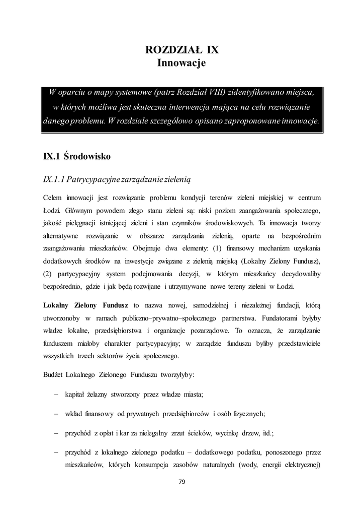 ROZDZIAŁ IX Innowacje W oparciu o mapy systemowe (patrz Rozdział VIII) zidentyfikowano miejsca, w których możliwa jest skuteczna interwencja mająca na celu rozwiązanie danego problemu. W rozdziale szczegółowo opisano zaproponowane innowacje. IX.1 Środowisko IX.1.1 Patrycypacyjne zarządzanie zielenią Celem innowacji jest rozwiązanie problemu kondycji terenów zieleni miejskiej w centrum Łodzi. Głównym powodem złego stanu zieleni są: niski poziom zaangażowania społecznego, jakość pielęgnacji istniejącej zieleni i stan czynników środowiskowych. Ta innowacja tworzy alternatywne rozwiązanie w obszarze zarządzania zielenią, oparte na bezpośrednim zaangażowaniu mieszkańców. Obejmuje dwa elementy: (1) finansowy mechanizm uzyskania dodatkowych środków na inwestycje związane z zielenią miejską (Lokalny Zielony Fundusz), (2) partycypacyjny system podejmowania decyzji, w którym mieszkańcy decydowaliby bezpośrednio, gdzie i jak będą rozwijane i utrzymywane nowe tereny zieleni w Łodzi. Lokalny Zielony Fundusz to nazwa nowej, samodzielnej i niezależnej fundacji, którą utworzonoby w ramach publiczno–prywatno–społecznego partnerstwa. Fundatorami byłyby władze lokalne, przedsiębiorstwa i organizacje pozarządowe. To oznacza, że zarządzanie funduszem miałoby charakter partycypacyjny; w zarządzie funduszu byliby przedstawiciele wszystkich trzech sektorów życia społecznego. Budżet Lokalnego Zielonego Funduszu tworzyłyby: kapitał żelazny stworzony przez władze miasta; wkład finansowy od prywatnych przedsiębiorców i osób fizycznych; przychód z opłat i kar za nielegalny zrzut ścieków, wycinkę drzew, itd.; przychód z lokalnego zielonego podatku – dodatkowego podatku, ponoszonego przez mieszkańców, których konsumpcja zasobów naturalnych (wody, energii elektrycznej) 79 lub emisja zanieczyszczeń przekroczy określony limit. Zielony podatek może być uiszczony w formie pieniężnej lub prac społecznych, związanych z zielenią miejską w Łodzi; zielona karta miejska – karta rabatowa, której posiadaczom miejscowe firmy (sklepy, restauracje, itd.) udzielałyby rabatu na oferowane produkty lub usługi (np. 10%). Karty emitowałby Lokalny Zieleny Fundusz, a wszystkie dochody z jej sprzedaży byłyby przeznaczone na powiększanie kapitału żelaznego Funduszu; jako fundacja, Fundusz mógłby uzyskać status organizacji pożytku publicznego i uzyskiwać środki z tzw. „1% podatku”; granty ze środków funduszy Unii Europejskiej, Banku Światowego, itd. Największa część uzyskanych środków byłaby utrzymywana jako kapitał żelazny i inwestowana tak, by wszystkie kluczowe działania Funduszu były finansowane głównie z zysków od odsetek z kapitału żelaznego. Główne obszary działalności Lokalnego Zielonego Funduszu: Edukacja mieszkańców w zakresie wartości usług ekosystemów – celem jest podniesienie świadomości mieszkańców, zmiana ich nawyków tak, by wykorzystywali lokalne ekosystemy w sposób zrównoważony i równocześnie przynoszący im korzyści finansowe np. korzyści z tytułu zredukowania wydatków na energię, paliwo, wodę, itd. Edukacja mieszkańców miałaby również na celu promowanie stosowania rozwiązań sprzyjających środowisku w życiu codziennym i w działalności zawodowej; Przyznawanie dotacji oddolnym inicjatywom społecznym dotyczącym rozwoju lub utrzymania obszarów zieleni miejskiej. Projekty mogą przedkładać wyłącznie grupy będące inicjatywami sąsiedzkimi. Grupa występująca o grant musi wnieść także wkład własny w postaci pracy wolontariackiej, co jest warunkiem otrzymania dotacji. Wszystkie zgłoszone projekty byłyby publikowane na stronie internetowej Funduszu. Mieszkańcy Łodzi poprzez głosowanie wskazywaliby, które projekty ich zdaniem są najlepsze i zasługują na uzyskanie dofinansowania; Udzielanie pomocy eksperckiej (np. architekta krajobrazu, ogrodnika, innowatorów społecznych, itd.) dla projektów, które uzyskały dofinansowanie; 80 Nagradzanie najlepszych „zielonych inicjatyw” realizowanych przez firmy i sąsiedzkie grupy inicjatywne; Częściowy zwrot kosztów inwestycji w prywatnych nieruchomościach związanych np. z podłączeniem nawierzchni, do miejskiej sieci kanalizacyjnej, zielonych dachów oraz innych budowy systemów przepuszczalnych odzyskiwania wody deszczowej, instalacji do pozyskiwania alternatywnych źródeł energii (np. paneli słonecznych), tworzenia kompostowników, itp. Zalety innowacji: Wzrost liczby terenów zieleni w mieście; Zmniejszenie emisji CO 2 i pozostałych zanieczyszczeń; Poprawa jakości powietrza i retencji wody, Poprawa warunków życia mieszkańców; Integracja społeczności lokalnej; Stworzenie możliwości oddziaływania na lokalną politykę środowiskową przez mieszkańców; Szansa na poprawę systemu zarządzania i uzyskanie dodatkowych środków na ochronę środowiska. IX.1.2 Polityka zielonego współzawodnictwa W procesie wsparcia ochrony środowiska w Łodzi ważne jest sformułowanie polityki zielonego współzawodnictwa, która obejmie dwóch głównych lokalnych interesariuszy: lokalne władze i dzielnice (społeczności dzielnicowe). Głównym celem tej strategii jest: 1. Stymulowanie i wzrost współzawodnictwa w obszarze środowiska między przedstawicielami tego samego sektora; 2. Wsparcie interakcji między dzielnicami a władzą lokalną. Poniższy diagram pokazuje, że współzawodnictwo i współpraca są istotne dla osiągnięcia zrównoważonego rozwoju. W tym przypadku, konkurencja jest zdefiniowana jako wyścig ku 81 zrównoważonemu rozwojowi między reprezentantami władz lokalnych z jednej strony, a dzielnicami (lokalnymi społecznościami) z drugiej strony. Po uruchomieniu interakcji wewnątrz jednego sektora (władze lokalne), może rozpocząć się drugi etap związany z interakcjami międzysektorowymi. Rysunek IX.1 Podstawy zrównoważonego rozwoju Współzawodnictwo Z