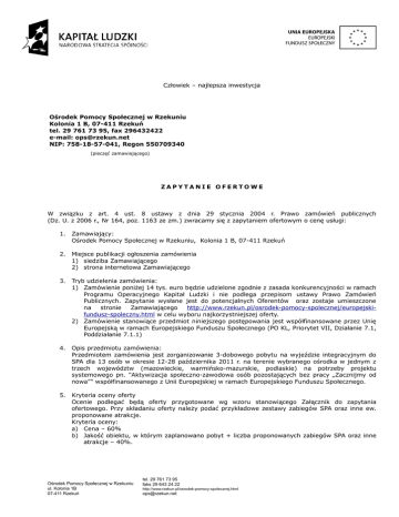 Człowiek – najlepsza inwestycja Ośrodek Pomocy Społecznej w Rzekuniu Kolonia 1 B, 07-411 Rzekuń tel. 29 761 73 95, fax 296432422 e-mail: [email protected] NIP: 758-18-57-041, Regon 550709340 (pieczęć zamawiającego) ZAPYTANIE OFERTOWE W związku z art. 4 ust. 8 ustawy z dnia 29 stycznia 2004 r. Prawo zamówień publicznych (Dz. U. z 2006 r., Nr 164, poz. 1163 ze zm.) zwracamy się z zapytaniem ofertowym o cenę usługi: 1. Zamawiający: Ośrodek Pomocy Społecznej w Rzekuniu, Kolonia 1 B, 07-411 Rzekuń 2. Miejsce publikacji ogłoszenia zamówienia 1) siedziba Zamawiającego 2) strona internetowa Zamawiającego 3. Tryb udzielenia zamówienia: 1) Zamówienie poniżej 14 tys. euro będzie udzielone zgodnie z zasada konkurencyjności w ramach Programu Operacyjnego Kapitał Ludzki i nie podlega przepisom ustawy Prawo Zamówień Publicznych. Zapytanie wysłane jest do potencjalnych Oferentów oraz zostaje umieszczone na stronie Zamawiającego http://www.rzekun.pl/osrodek-pomocy-spolecznej/europejskifundusz-spoleczny.html w celu wyboru najkorzystniejszej oferty. 2) Zamówienie stanowiące przedmiot niniejszego postępowania jest współfinansowane przez Unię Europejską w ramach Europejskiego Funduszu Społecznego (PO KL, Priorytet VII, Działanie 7.1, Poddziałanie 7.1.1) 4. Opis przedmiotu zamówienia: Przedmiotem zamówienia jest zorganizowanie 3-dobowego pobytu na wyjeździe integracyjnym do SPA dla 13 osób w okresie 12-28 października 2011 r. na terenie wybranego ośrodka w jednym z trzech województw (mazowieckie, warmińsko-mazurskie, podlaskie) na potrzeby projektu systemowego pn. "Aktywizacja społeczno-zawodowa osób pozostających bez pracy „Zacznijmy od nowa”" współfinansowanego z Unii Europejskiej w ramach Europejskiego Funduszu Społecznego. 5. Kryteria oceny oferty Ocenie podlegać będą oferty przygotowane wg wzoru stanowiącego Załącznik do zapytania ofertowego. Przy składaniu oferty należy podać przykładowe zestawy zabiegów SPA oraz inne ew. proponowane atrakcje. Kryteria oceny: a) Cena – 60% b) Jakość obiektu, w którym zaplanowano pobyt + liczba proponowanych zabiegów SPA oraz inne atrakcje – 40%. Ośrodek Pomocy Społecznej w Rzekuniu ul. Kolonia 1B 07-411 Rzekuń tel. 29 761 73 95 faks 29 643 24 22 http://www.rzekun.pl/osrodek-pomocy-spolecznej.html [email protected] 6. Kompleksowa usługa będzie obejmowała: 1) Zapewnienie środka transportu – zaleca się bus do przewozu co najmniej 15 osób - dowóz zorganizowanej grupy z siedziby Zamawiającego na miejsce wskazane w zleceniu i ich odwiezieniu (Oferent musi zagwarantować kierowcę z prawem jazdy właściwej kategorii i możliwości techniczne do przewozu osób. Zapewnić bezpieczne i higieniczne (klimatyzacja) warunki przejazdu pojazdem sprawnym technicznie i dopuszczonym do ruchu kołowego). 1) Pełną organizację i obsługę uczestników w czasie pobytu w wybranym ośrodku SPA w Polsce, w tym w szczególności: 1. zakwaterowanie na terenie ośrodka (koszty noclegów i wyżywienia przez trzy pełne dni), 2. zabiegi SPA. 7. Inne informacje Płatność za usługę nastąpi przelewem w ciągu 14 dni od daty zrealizowania usługi i otrzymania faktury. 8. Sposób przygotowania oferty: 1) Ofertę sporządzić należy na załączonym druku „OFERTA CENOWA”. 2) Ofertę sporządzić należy w języku polskim, w formie pisemnej, na maszynie, komputerze, nieścieralnym atramentem lub długopisem. Oferta winna być podpisana przez osobę upoważnioną. W przypadku składana oferty w siedzibie zamawiającego lub pocztą na kopercie należy umieścić napis „Zapytanie ofertowe na wynajem busa wraz z kierowcą na potrzeby projektu systemowego pn. „Aktywizacja społeczno-zawodowa osób pozostających bez pracy „Zacznijmy od nowa”” współfinansowanego z Unii Europejskiej w ramach Europejskiego Funduszu Społecznego. 3) Ofertę złożyć można osobiście u Zamawiającego pok. 4, pocztą, pocztą elektroniczną na adres: [email protected] [email protected], kurierem lub faksem pod nr 29643 24 22. 9. Miejsce i termin złożenia oferty: Ofertę złożyć należy do dnia 12 października 2011 r. godz. 10:00. 10. O wyborze najkorzystniejszej oferty Zamawiający zawiadomi oferentów za pośrednictwem strony internetowej http://www.rzekun.pl/osrodek-pomocy-spolecznej/europejski-fundusz-spoleczny.html i telefonicznie. 11. Osobami upoważnionymi ze strony Zamawiającego do kontaktu z Wykonawcą są w sprawach merytorycznych i formalnych: 1) Pani Anna Laska, tel. 297617395 wew. 106 2) Pani Izabela Siennicka, tel. 297617395 Danuta Orzołek Kierownik Ośrodka Pomocy Społecznej w Rzekuniu 05.10.2011 r. Anna Laska (data, podpis osoby prowadzącej sprawę) Projekt współfinansowany przez Unię Europejską w ramach Europejskiego Funduszu Społecznego Ośrodek Pomocy Społecznej w Rzekuniu ul. Kolonia 1B 07-411 Rzekuń tel. 29 761 73 95 faks 29 643 24 22 http://www.rzekun.pl/osrodek-pomocy-spolecznej.html [email protected]