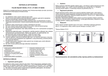 INSTRUKCJA UŻYTKOWANIA PALNIK RĘCZNY MODEL HT-911, HT-6000 i HT-6000S PRZECZYTAJ UWAŻNIE INSTRUKCJĘ I ZAPOZNAJ SIĘ Z PRODUKTEM PRZED UŻYCIEM. ZACHOWAJ INSTRUKCJĘ DO PRZYSZŁEGO WYKORZYSTANIA OSTRZEŻENIE: 1. 2. 3. 4. 5. 6. 7. 8. Do napełnienia należy używać wyłącznie gazu butan. Należy chronić dysze palnika przed zabrudzeniami i upadkami, gdyż jest to najczęstsza przyczyna późniejszego nieprawidłowego funkcjonowania. Palnika nie wolno przechowywać w pobliżu otwartego ognia, ani bezpośrednio na słońcu. Temperatura pomieszczenia, w którym przechowywany jest palnik nie powinna przekraczać o 40 C. Urządzenie należy przechowywać w miejscu niedostępnym dla dzieci Nie wolno dotykać wylotu palnika natychmiast po użyciu, kiedy jest jeszcze gorący. Nie wolno zanurzać żadnej części palnika w wodzie. Butan jest gazem łatwopalnym, więc należy obchodzić się z nim z zachowaniem szczególnej ostrożności. Zapalanie Należy przekręcić (OFF/ON) regulator dopływu gazu, o 2/3 obrotu w stronę przeciwną do ruchu wskazówek zegara. Gaz z sykiem zacznie wydostawać się z palnika (Rys. 2.). Następnie nacisnąć przycisk zapłonu, co spowoduje ukazanie się płomienia (Rys. 3.). Regulowanie płomienia Długość płomienia palnika ustawia się za pomocą regulatora dopływu gazu; obrót zgodny z ruchem wskazówek zegara spowoduje zmniejszenie się płomienia; obrót w stronę przeciwną spowoduje jego zwiększenie. Efektywna długość płomienia to 1,25 do 2,5 cm - większy płomień powoduje niepotrzebną stratę gazu. Szerokość i temperaturę płomienia należy ustawić za pomocą regulatora dopływu powietrza: odkręcenie w kierunku palnika zwiększy płomień i obniży jego temperaturę, skręcenie ku sobie zmniejszy płomień i zwiększy jego temperaturę. Wyłączanie Należy zakręcić pokrętło regulatora gazu aż do oporu i całkowitego zgaśnięcia płomienia (Rys.4.). Po wygaszeniu należy ustawić przycisk blokujący w pozycję „LOCK”. * *Dotyczy Modelu HT-911. Napełnianie pojemnika gazu i korzystanie z palnika powinno odbywać się w dobrze wentylowanych pomieszczeniach. Należy się upewnić, że wokół palnika, lub płomienia jest dość wolnej przestrzeni, z dala od innych osób. W czasie napełniania zbiornika palnika gazem nie wolno palić! 9. 10. Podczas zapalania i operowania palnikiem jego wylot nie może być skierowany w kierunku osób. Konieczne jest posługiwanie się urządzeniem z dużą ostrożnością, ponieważ płomień nie zawsze jest widoczny. 11. Po zakończeniu pracy z palnikiem należy upewnić się, że dopływ gazu został całkowicie odcięty, a płomień wygaszony. 12. Nie wolno chować palnika przed jego całkowitym ostudzeniem ZASTOSOWANIE: wykonywanie aplikacji piekarskich i cukierniczych karmelizacja cukru roztapianie sera na potrawach uzyskiwanie chrupkiej skórki potraw mięsnych zdejmowanie skórki z pomidorów lutowanie miedzianych rurek odmrażanie zamrożonych rur naprawa starych mebli usuwanie lakierów i farb rozpalanie kominków, grilli naprawa niewielkich przedmiotów i zabawek INSTRUKCJA OBSŁUGI Napełnianie palnika gazem Do napełniania należy używać wyłącznie gazu butan. Przed rozpoczęciem napełniania należy się upewnić, że regulator dopływu gazu znajduje się w pozycji „WYŁĄCZONY” (OFF). Następnie należy ustawić palnik w pionie, tak by zawór do napełniania gazem znajdował się na dole. (Rys. 1.). Nie należy uruchamiać zapłonu natychmiast po napełnieniu palika gazem, ale odczekać kilka minut aż gaz w pojemniku się ustabilizuje. Rozmontowywanie, lub samodzielne próby naprawy palnika są niedozwolone!