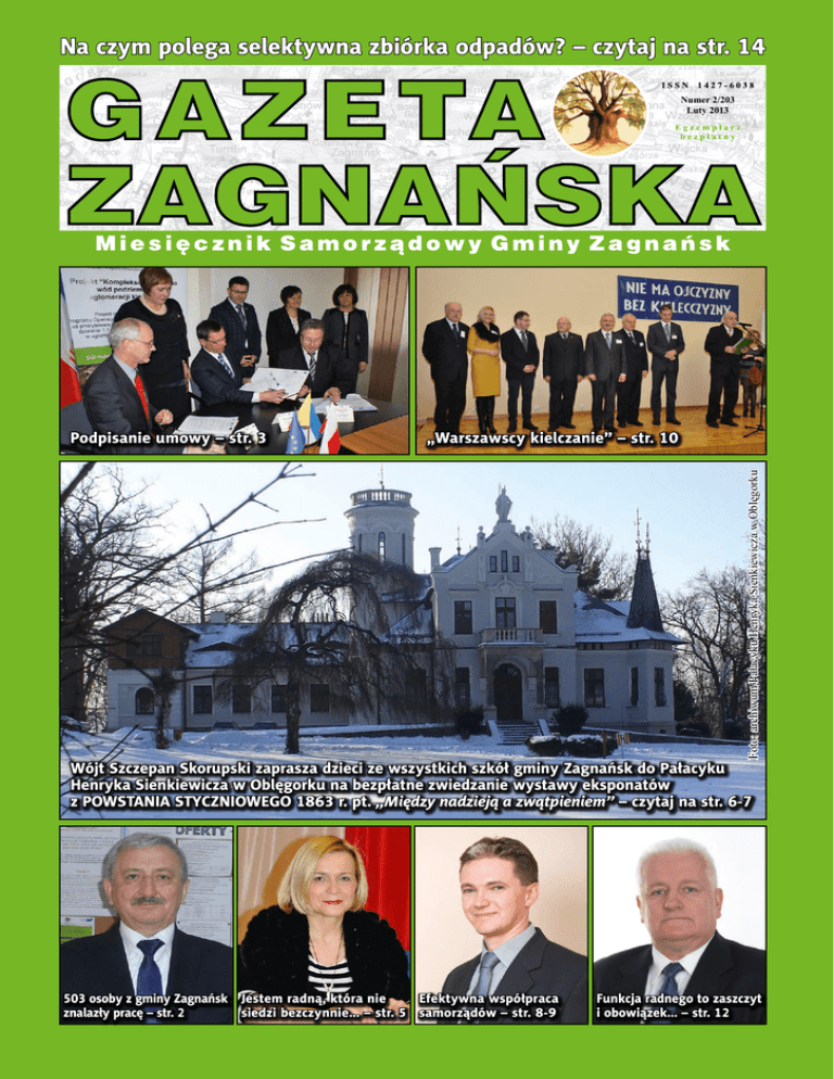 Na czym polega selektywna zbiórka odpadów? – czytaj na str. 14 Numer 2/203 Luty 2013 „Warszawscy kielczanie” – str. 10 Foto: archiwum Pałacyku Henryka Sienkiewicza w Oblęgorku Podpisanie umowy – str. 3 Wójt Szczepan Skorupski zaprasza dzieci ze wszystkich szkół gminy Zagnańsk do Pałacyku Henryka Sienkiewicza w Oblęgorku na bezpłatne zwiedzanie wystawy eksponatów z powstania styczniowego 1863 r. pt. „Między nadzieją a zwątpieniem” – czytaj na str. 6-7 503 osoby z gminy Zagnańsk Jestem radną, która nie Efektywna współpraca znalazły pracę – str. 2 siedzi bezczynnie… – str. 5 samorządów – str. 8-9 Funkcja radnego to zaszczyt i obowiązek… – str. 12 Gazeta Zagnańska W 2012 r. 503 osoby z naszej gminy znalazły pracę W Zagnańsku bliżej po pracę Mija rok działalności Lokalnego Punktu Informacyjno-Konsultacyjnego (LPIK), który utworzony został 1 lutego ub. r. w Zagnańsku obok kościała pw. św. Józefa Oblubieńca NMP przy ul. Turystycznej 64. Placówkę z tej okazji 29 stycznia br. odwiedzili: starosta kielecki Zdzisław Wrzałka, zastępca dyrektora Powiatowego Urzędu Pracy w Kielcach Artur Kudzia i wójt Szczepan Skorupski. Porozumienie w sprawie utworzenia i prowadzenia LPIK z samorządem gminy Zagnańsk, reprezentowanym przez wójta Szczepana Skorupskiego, zawarł dyrektor PUP w imieniu starosty kieleckiego Zdzisława Wrzałki. Zdaniem wicedyrektora Artura Kudzi, LPIK jest wyspecjalizowaną komórką organizacyjną Powiatowego Urzędu Pracy w Kielcach. Rok 2012 dla jego pracowników oraz kierownictwa PUP w Kielcach upłynął pod znakiem rozpoznania potrzeb lokalnego, zagnańskiego rynku pracy oraz na aktywizacji osób bezrobotnych. Ponadto LPIK realizuje zadania z zakresu funkcjonowania Wydziału Rejestracji i Informacji, Wydziału Koordynacji Świadczeń oraz Referatu Pośrednictwa Pracy w Centrum Aktywizacji Zawodowej w Powiatowym Urzędzie Pracy w Kielcach. Do podstawowych zadań Lokalnego Punktu Informacyjno-Konsultacyjnego należy w szczególności realizacja zadań w zakresie udzielania osobom zainteresowanym oraz pracodawcom informacji o możliwościach i zakresie udzielania pomocy określonej w ustawie o promocji zatrudnienia i instytucjach rynku pracy. Osoby bezrobotne i poszukujące pracy są także rejestrowane, prowadzona jest ich ewidencja i obsługa formalna oraz realizacja zadań z zakresu pośrednictwa pracy. A oto dane o stanie nt. bezrobocia z terenu gminy Zagnańsk (stan na dzień 31.12.2012 roku). Liczba osób bezrobotnych zarejestrowanych pochodzących z terenu gminy Zagnańsk wyniosła 923 osoby, w tym 426 kobiet, co stanowi 6,48 proc. ogółu zarejestrowanych w PUP, które na koniec ub. r. liczba ta wyniosła 14.240 osób. Po raz pierwszy lub kolejny z gminy na przestrzeni całego roku zarejestrowanych zostało 1275 osób (w tym 546 kobiet). Najwięcej zarejestrowanych nie posiadało wykształcenia średniego – 570 osób, Nasza sołtys w Brukseli Nagroda europoseł Róży Thun W dniach 24-28.11.2012 r. na zaproszenie europosłanki Róży Thun sołtys Zagnańska Grażyna Wawszczak uczestniczyła w wizycie studyjnej w Parlamencie Europejskim w Brukseli. Była to nagroda za uzyskanie tytułu „Sołtys Roku 2012”. Uczestnikami tej wycieczki było 20 osób z województw świętokrzyskiego i małopolskiego – najlepsi uczniowie wyróżnieni w różnych konkursach oraz liderzy stowarzyszeń aktywnie uczestniczący w życiu społecznym. Program pobytu obejmował wizytę w Parlamencie Europejskim, gdzie odbywała się prelekcja na temat funkcjonowania, działalno- 2 było długotrwale bezrobotnych – 409, bez kwalifikacji zawodowych – 365 i bez doświadczenia zawodowego – 348. Osoby do 25. roku życia stanowiły 24,94 proc. ogółu zarejestrowanych z terenu gminy, zaś osoby powyżej 50. roku życia – 18,51 proc. Zarejestrowało się 358 osób z prawem do zasiłku, w tym 154 kobiety. Na 15.926 osób wyrejestrowujących się w ub. r. z PUP było 1055 osób z terenu naszej gminy. – Z powodu podjęcia pracy zostały wyrejestrowane 503 osoby, w tym z powodu podjęcia pracy niesubsydiowanej – 441, podjęcia pracy subsydiowanej – 62 – informuje starosta Zdzisław Wrzałka. – Na poszczególne formy wsparcia oferowane przez PUP zostało skierowane: na prace interwencyjne – 8 osób, roboty publiczne – 5, szkolenia – 44, staże – 111 osób. Dla 500 osób (w tym 233 kobiet) przygotowano Indywidualny Plan Działania – dodaje starosta kielecki. Na 4519 ofert pracy, które wpłynęły do Powiatowego Urzędu Pracy, 142 pochodziły od pracodawców mających działalność zarejestrowaną na terenie gminy Zagnańsk. Z pomocy doradcy zawodowego w ramach poradnictwa zawodowego skorzystało: 100 osób – z rozmowy wstępnej, 58 – z porady indywidualnej, odbywając łącznie 313 spotkań, 10 – z porady grupowej, 1 – z informacji zawodowej, 89 wzięło udział w zajęciach aktywizacyjnych realizowanych w ramach pomocy w aktywnym poszukiwaniu pracy. – Problematyka zatrudnienia i rynku pracy jest stale obecna w naszym życiu. Wszystkie podmioty odpowiedzialne za prowadzenie skutecznych działań opracowują strategię działania, której celem nadrzędnym jest ograniczenie bezrobocia oraz negatywnych skutków tego zjawiska. Jest to również priorytetem działania samorządów lokalnych, które w swoich strategiach rozwoju wskazują, iż skuteczna aktywizacja osób bezrobotnych prowadzi do rozwoju społeczności lokalnych – twierdzi starosta kielecki. – Przyjęte założenia Strategii Rozwoju Powiatu Kieleckiego do roku 2020, które realizowane są przez Powiatowy Urząd Pracy w Kielcach, wskazują, że tylko aktywna polityka na rynku pracy może prowadzić do realizacji ustawowych celów, jakimi są: pełne i produktywne zatrudnienie, rozwój zasobów ludzkich, osiągnięcie wysokiej jakości pracy i wzmacnianie integracji oraz solidarności społecznej – podkreślił starosta Zdzisław W