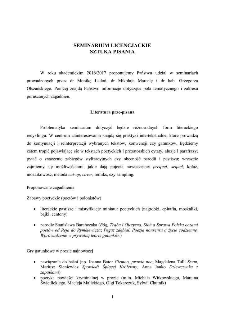 SEMINARIUM LICENCJACKIE SZTUKA PISANIA W roku akademickim 2016/2017 proponujemy Państwu udział w seminariach prowadzonych przez dr Monikę Ładoń, dr Mikołaja Marcelę i dr hab. Grzegorza Olszańskiego. Poniżej znajdą Państwo informacje dotyczące pola tematycznego i zakresu poruszanych zagadnień. Literatura prze-pisana Problematyka seminarium dotyczyć będzie różnorodnych form literackiego recyklingu. W centrum zainteresowania znajdą się praktyki intertekstualne, które prowadzą do kontynuacji i reinterpretacji wybranych tekstów, konwencji czy gatunków. Będziemy zatem tropić pojawiające się w tekstach poetyckich i prozatorskich cytaty, aluzje i parafrazy; pytać o znaczenie zabiegów stylizacyjnych czy obecność parodii i pastiszu; wreszcie zajmiemy się możliwościami, jakie dają pojęcia nowoczesne: prequel, sequel, kolaż, mozaikowość, metoda cut-up, cover, remiks, czy sampling. Proponowane zagadnienia Zabawy poetyckie (poetów i polonistów) literackie pastisze i mistyfikacje miniatur poetyckich (nagrobki, epitafia, moskaliki, bajki, centony) parodie Stanisława Barańczaka (Bóg, Trąba i Ojczyzna. Słoń a Sprawa Polska oczami poetów od Reja do Rymkiewicza; Pegaz zdębiał. Poezja nonsensu a życie codzienne. Wprowadzenie w prywatną teorię gatunków) Gry gatunkowe w prozie najnowszej nawiązania do baśni (np. Joanna Bator Ciemno, prawie noc, Magdalena Tulli Szum, Mariusz Sieniewicz Spowiedź Śpiącej Królewny, Anna Janko Dziewczynka z zapałkami) poetyka powieści kryminalnej w prozie (m.in. Michała Witkowskiego, Marcina Świetlickiego, Macieja Malickiego, Olgi Tokarczuk, Sylwii Chutnik) 1 modyfikacje opowieści/sag rodzinnych (np. Inga Iwasiów Bambino, Joanna Bator Piaskowa góra, Zośka Papużanka Szopka) Zapraszam wszystkich zainteresowanych poszukiwaniem odpowiedzi na pytanie, jak możliwe jest twórcze prze-pisywanie literatury i kultury. Monika Ładoń Literatura i kultura popularna: powtórzenie i różnica Seminarium poświęcone będzie analizie wybranych zagadnień kultury popularnej. Na podstawie zaproponowanych teorii i metodologii studenci będą próbowali samodzielnie analizować i interpretować wybrane teksty kultury popularnej. Celem seminarium jest trening umiejętności analitycznych oraz sposobów czytania tekstów kultury, ze szczególnym uwzględnieniem tekstów popkultury. W czasie zajęć szczególny nacisk położymy na śledzenie sposobów konstruowania znaczeń w obrębie kultury popularnej oraz wykorzystywanych przez nią rozmaitych schematów oraz odstęp od tychże schematów w wybranych tekstach. Będzie nas zatem interesować zarówno powtórzenie, jak i różnica w obrębie tekstów popkultury. W trakcie trwania seminarium studenci dogłębnie zapoznają się z modelami teoretycznymi (strukturalizm, i różnymi podejściami poststrukturalizm, ułatwiającymi feminizm, badanie postkolonializm, kultury badania popularnej kulturowe). Zastanowimy się także nad możliwościami ich wykorzystania w interpretacji zjawisk z zakresu popkultury. Analizowane będą rozmaite obszary kultury popularnej (literatura, film, seriale, muzyka, gry komputerowe) oraz ich przemiany na przestrzeni ostatnich dekad. Seminarium zorientowane będzie na stosowanie metod interdyscyplinarnych. Prace licencjackie pisane na seminarium dotyczyć będą wybranych przez studentów tekstów kultury popularnej. Główne obszary badawcze to: literatura popularna (ze szczególnym uwzględnieniem takich gatunków, jak young adult fiction, fantasy, science fiction, kryminał, horror czy romans), najnowsze trendy w filmie (kinowe uniwersa komiksowe, zjawisko remake'u, prequela, sequela, spin-offu), przemiany w obrębie seriali (ze szczególnym uwzględnieniem znaczenia seriali premium), kultura cyberprzestrzeni, gier komputerowych i narracyjnych (w tym narracyjny wymiar gier video). 2 Mikołaj Marcela Problematyka prowadzanego przeze mnie seminarium skoncentrowana zostanie na dwóch odrębnych zagadnieniach badawczych związanych z interdyscyplinarnością oraz socjologią literatury. Zważywszy na specyfikę kierunku chciałbym zaproponować uczestnikom seminarium przygotowanie prac dotyczących związków literatury z innymi dziedzinami sztuki (filmem, muzyką, czy fotografią), jak i podjęcie refleksji na temat wizerunków pisarzy i czytelników we współczesnym nam kulturowym imiaginarium. Przykładowe zagadnienia: ad. 1. „Piosenka musi posiadać tekst” (K. Nosowska) – strategie liryczne muzyków (Maria Peszek, Julia Marcell, M. Świetlicki, Pablopovo, Łona, etc) „Pisać światłem” – analiza wybranych utworów, których autorzy tematyzują relacje literatury i fotografii (W. Wirpsza, J. Dehnel, D. Foks, A. Stasiuk, etc) „Z książki na ekran, z ekranu do książki” – problemy adaptacji. ad. 2. Wizerunki pisarzy/czytelników i obrazy pisania/czytania w wybranych dziełach literackich czy filmowych (W. Kuczok: Senność, L. Majewski: Wojaczek, M. Forster: Przypadek Harolda Cricka, T. Kapinos: Californication, etc). „Poetyka i sformułowana i nie” – pisarze w roli teoretyków, znawców i nauczycieli literackiego fachu (analiza wywiadów, podręczników z zakresu creative writing, etc) „Pisarz w świecie popkultury” – obrazy twórców literatury obecnych w prasie i internecie. Zapraszam serdecznie! Grzegorz Olszański 3