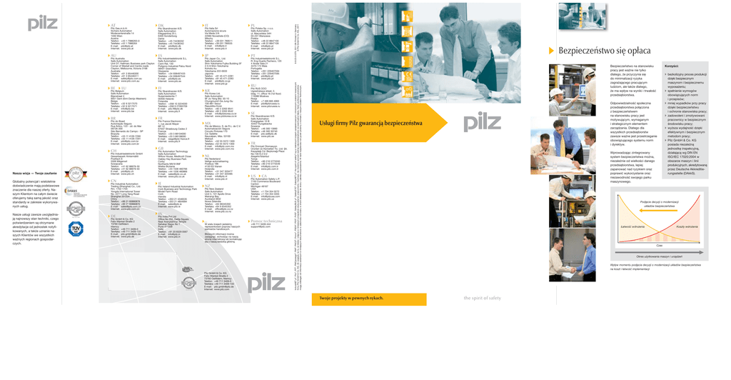 • IT • PL • AU • ES • JP • PT Pilz Australia Safe Automation Unit D7, Hallmarc Business park Clayton Corner of Westall and Centre roads Clayton, Melbourne, Victoria 3168 Australia Telefon: +61 3 95446300 Telefaks: +61 3 95446311 E-mail: [email protected] Internet: www.pilz.com.au • BE • LU Pilz Belgium Safe Automation Bijenstraat 4 9051 Gent (Sint-Denijs-Westrem) Belgia Telefon: +32 9 3217570 Telefaks: +32 9 3217571 E-mail: [email protected] Internet: www.pilz.be • BR Pilz do Brasil Automação Segura Rua Ártico, 123 - Jd. do Mar 09726-300 São Bernardo do Campo - SP Brazylia Telefon: +55 11 4126-7290 Telefaks: +55 11 4126-7291 E-mail: [email protected] Internet: www.pilz.com.br • CH Nasza wizja — Twoje zaufanie Pilz lndustrieelektronik GmbH Gewerbepark Hintermättli Postfach 6 5506 Mägenwil Szwajcaria Telefon: +41 62 88979-30 Telefaks: +41 62 88979-40 E-mail: [email protected] Internet: www.pilz.ch Globalny potencjał i wieloletnie doświadczenie mają podstawowe znaczenie dla naszej oferty. Naszym Klientom na całym świecie oferujemy taką samą jakość oraz standardy w zakresie wykonywanych usług. • CN Nasze usługi zawsze uwzględniają najnowszy stan techniki, czego potwierdzeniem są otrzymane akredytacje od jednostek notyfikowanych, a także uznanie naszych Klientów we wszystkich ważnych regionach gospodarczych. • DE Pilz Industrial Automation Trading (Shanghai) Co., Ltd. Rm. 1702-1704 Yongda International Tower No. 2277 Long Yang Road Shanghai 201204 Chiny Telefon: +86 21 60880878 Telefaks: +86 21 60880870 E-mail: [email protected] Internet: www.pilz.com.cn Pilz GmbH & Co. KG Felix-Wankel-Straße 2 73760 Ostfildern Niemcy Telefon: +49 711 3409-0 Telefaks: +49 711 3409-133 E-mail: [email protected] Internet: www.pilz.de Pilz Skandinavien K/S Safe Automation Ellegaardvej 25 L 6400 Sonderborg Dania Telefon: +45 74436332 Telefaks: +45 74436342 E-mail: [email protected] Internet: www.pilz.dk Pilz lndustrieelektronik S.L. Safe Automation Camí Ral, 130 Polígono Industrial Palou Nord 08401 Granollers Hiszpania Telefon: +34 938497433 Telefaks: +34 938497544 E-mail: [email protected] Internet: www.pilz.es • FI Pilz Skandinavien K/S Safe Automation Nuijamiestentie 7 00400 Helsinki Finlandia Telefon: +358 10 3224030 Telefaks: +358 9 27093709 E-mail: pilz.fi@pilz.dk Internet: www.pilz.fi • FR Pilz France Electronic 1, rue Jacob Mayer BP 12 67037 Strasbourg Cedex 2 Francja Telefon: +33 3 88104000 Telefaks: +33 3 88108000 E-mail: [email protected] Internet: www.pilz.fr • GB Pilz Automation Technology Safe Automation Willow House, Medlicott Close Oakley Hay Business Park Corby Northants NN18 9NF Wielka Brytania Telefon: +44 1536 460766 Telefaks: +44 1536 460866 E-mail: [email protected] Internet: www.pilz.co.uk • IE Pilz Ireland Industrial Automation Cork Business and Technology Park Model Farm Road Cork Irlandia Telefon: +353 21 4346535 Telefaks: +353 21 4804994 E-mail: [email protected] Internet: www.pilz.ie • IN Pilz India Pvt Ltd Office No 202, Delite Square Near Aranyeshwar Temple Sahakar Nagar No 1 Pune 411009 Indie Telefon: +91 20 6529 0567 E-mail: [email protected] Internet: www.pilz.in Pilz ltalia Srl Automazione sicura Via Meda 2/A 22060 Novedrate (CO) Włochy Telefon: +39 031 789511 Telefaks: +39 031 789555 E-mail: [email protected] Internet: www.pilz.it Pilz Japan Co., Ltd. Safe Automation Shin-Yokohama Fujika Building 5F 2-5-9 Shin-Yokohama Kohoku-ku Yokohama 222-0033 Japonia Telefon: +81 45 471-2281 Telefaks: +81 45 471-2283 E-mail: [email protected] Internet: www.pilz.jp • KR Pilz Korea Ltd. Safe Automation 9F Jo-Yang Bld. 50-10 Chungmuro2-Ga Jung-Gu 100-861 Seoul Republika Korei Telefon: +82 2 2263 9541 Telefaks: +82 2 2263 9542 E-mail: [email protected] Internet: www.pilzkorea.co.kr • MX Pilz de México, S. de R.L. de C.V. Automatización Segura Circuito Pintores 170 Cd. Satélite Naucalpan, Méx. 53100 Meksyk Telefon: +52 55 5572 1300 Telefaks: +52 55 5572 1300 E-mail: [email protected] Internet: www.pilz.com.mx • NL Pilz Nederland Veilige automatisering Postbus 186 4130 ED Vianen Holandia Telefon: +31 347 320477 Telefaks: +31 347 320485 E-mail: [email protected] Internet: www.pilz.nl • NZ Pilz New Zealand Safe Automation Unit C, 101 Apollo Drive Mairangi Bay Auckland 0632 Nowa Zelandia Telefon: +64 96345350 Telefaks: +64 9 6345352 E-mail: offi[email protected] Internet: www.pilz.co.nz •… W wielu krajach jesteśmy reprezentowani poprzez naszych partnerów handlowych. Bliższych informacji można zasięgnąć, wchodząc na naszą stronę internetową lub kontaktując się z naszą siedzibą główną. Pilz GmbH & Co. KG Felix-Wankel-Straße 2 73760 Ostfildern, Niemcy Telefon: +49 711 3409-0 Telefaks: +49 711 3409-133 E-mail: [email protected] Internet: www.pilz.com Pilz Polska Sp. z o.o. Safe Automation ul. Marywilska 34H 03-231 Warszawa Polska Telefon: +48 22 8847100 Telefaks: +48 22 8847109 E-mail: [email protected] Internet: www.pilz.pl Pilz Industrieelektronik S.L. R. Eng Duarte Pacheco, 120 4 Andar Sala 21 4470-174 Maia Portugalia Telefon: +351 229407594 Telefaks: +351 229407595 E-mail: [email protected] Internet: www.pilz.pt • RU Pilz RUS OOO Ugreshskaya street, 2, bldg. 11, office 16 (1st floor) 115088 Moskwa Rosja Telefon: +7 495 665 4993 E-mail: [email protected] Internet: www.pilzrussia.ru • SE Pilz Skandinavien K/S Safe Automation Energigatan 10 B 43437 Kungsbacka Szwecja Telefon: +46 300 13990 Telefaks: +46 300 30740 E-mail: [email protected] Internet: www.pilz.se • TR Pilz Emniyet Otomasyon Ürünleri ve Hizmetleri Tic. Ltd. Şti. Kayışdağı Cd. Beykonağı Plaza No:130 K:2 D:2 Ataşehir/İstanbul Turcja Telefon: +90 216 5775550 Telefaks: +90 216 5775549 E-mail: [email protected] Internet: www.pilz.com.tr • US • CA Pilz Automation Safety L.P. 7150 Commerce Boulevard Canton Michigan 48187 USA Telefon: +1 734 354 0272 Telefaks: +1 734 354 3355 E-mail: [email protected] Internet: www.pilz.us • Pomo