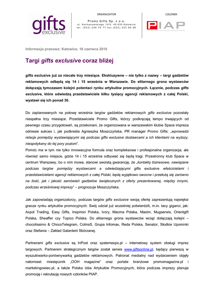 ORGANIZATOR CZŁONEK Promo G ifts Sp. z o.o. ul . Koc hanow sk i ego 10/5, 40-035 Katow ic e tel. (032) 206 76 77 fax (032) 253 99 96 Informacja prasowa: Katowice, 16 czerwca 2010 Targi gifts exclusive coraz bliżej gifts exclusive już za niecałe trzy miesiące. Ekskluzywne – nie tylko z nazwy – targi gadżetów reklamowych odbędą się 14 i 15 września w Warszawie. Do elitarnego grona wystawców dołączają tymczasem kolejni potentaci rynku artykułów promocyjnych. Łącznie, podczas gifts exclusive, które odwiedzą przedstawiciele kilku tysięcy agencji reklamowych z całej Polski, wystawi się ich ponad 30. Do zaplanowanych na połowę września targów gadżetów reklamowych gifts exclusive pozostały niespełna trzy miesiące. Przedstawiciele Promo Gifts, którzy podkręcają tempo trwających od pewnego czasu przygotowań, są przekonani, że organizowana w warszawskim klubie Space impreza odniesie sukces i, jak podkreśla Agnieszka Moszczyńska, PR manager Promo Gifts: „wprowadzi relacje pomiędzy wystawiającymi się podczas gifts exclusive dostawcami a ich klientami na wyższy, niespotykany do tej pory poziom”. Pomóc ma w tym nie tylko innowacyjna formuła oraz kompleksowa i profesjonalna organizacja, ale również samo miejsce, gdzie 14 i 15 września odbywać się będą tragi. Przestronny klub Space w centrum Warszawy, bo o nim mowa, stanowi swoistą gwarancję, że „kontakty biznesowe, nawiązane podczas targów pomiędzy wystawcami a odwiedzającymi gifts exclusive właścicielami i przedstawicielami agencji reklamowych z całej Polski, będą wyjątkowo owocne i przełożą się zarówno na ilość, jak i jakość zamówień gadżetów świątecznych z oferty prezentowanej, między innymi, podczas wrześniowej imprezy” – prognozuje Moszczyńska. Jak zapowiadają organizatorzy, podczas targów gifts exclusive swoją ofertę zaprezentują najwięksi gracze rynku artykułów promocyjnych. Swój udział już wcześniej potwierdzili, m.in. tacy giganci, jak: Axpol Trading, Easy Gifts, Inspirion Polska, Ivory, Macma Polska, Maxim, Mugserwis, Orientgift Polska, Sheaffer czy Topico Polska. Do elitarnego grona wystawców wciąż dołączają kolejni – chocolissimo & ChocoTelegram, ColinsS, Grupa Infomax, Reda Polska, Senator, Słodkie Upominki oraz Stefania – Zakład Galanterii Skórzanej. Partnerami gifts exclusive są InPost oraz systemexpo.pl – internetowy system obsługi imprez targowych. Partnerem strategicznym targów został serwis www.giftsonline.pl, będący pierwszą w wyszukiwarko-porównywarką gadżetów reklamowych. Patronat medialny nad wydarzeniem objęły natomiast: miesięcznik „OOH magazine” oraz portale branżowe promomagazine.pl i marketingowiec.pl, a także Polska Izba Artykułów Promocyjnych, która podczas imprezy planuje promocję i rekrutację nowych członków PIAP. ORGANIZATOR CZŁONEK Promo G ifts Sp. z o.o. ul . Koc hanow sk i ego 10/5, 40-035 Katow ic e tel. (032) 206 76 77 fax (032) 253 99 96 - „Podczas gifts exclusive działania promocyjne PIAP kierowane będą przede wszystkim do odwiedzających targi przedstawicieli agencji reklamowych” - wyjaśnia Magda Owczarska, wiceprezes PIAP. – „Taka impreza to znakomita szansa na nawiązanie relacji biznesowych oraz pozyskanie nowych członków. Zamierzamy tę szansę właściwie wykorzystać” - dodaje. Targi gifts exclusive poprzedzi intensywna kampania promocyjna, m.in. w mediach i portalach branżowych, takich jak: Brief, Press, OOH magazine, Marketingprzykawie.pl, oohmagazine.pl, Marketingowiec.pl czy promomagazine.pl. Istotnym elementem komunikacji będą również działania reklamowe w dedykowanych serwisach Wirtualnej Polski oraz szeroko zakrojona kampania outdoorowa w Warszawie, gdzie wykorzystane zostaną, m.in. billboardy mobilne. Organizator gifts exclusive zapowiada wysyłkę dziesiątek tysięcy zaproszeń do właścicieli i pracowników agencji reklamowych z całej Polski. …………………………………………………………………………………………………………………………………………………… O gifts exclusive Targi gifts exclusive, adresowane do przedstawicieli agencji reklamowych, odbędą się 14 i 15 wrzenia 2010 r. w klubie Space w Warszawie. Na 1800 m2 dostępnej powierzchni, swoją ofertą zaprezentuje ponad 30. dostawców, zarówno producentów, dystrybutorów, jak i importerów artykułów promocyjnych, z całej Polski. Zwiedzający będą mieli okazję zapoznać się m.in. z ofertą świąteczną gadżetów reklamowych, nawiązać nowe i pogłębić dotychczasowe kontakty biznesowe. …………………………………………………………………………………………………………………………………………………… Kontakt dla mediów Agnieszka Moszczyńska | PR Manager | [email protected] | tel. 530 431 756