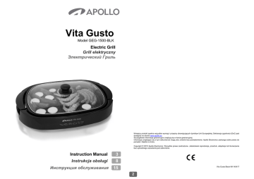 Vita Gusto Model GEG-1500-BLK Electric Grill Grill elektryczny Электрический Гриль Niniejszy produkt spełnia wszystkie wymogi i przepisy obowiązujących dyrektyw Unii Europejskiej. Deklaracja zgodności (DoC) jest dostępna na stronie www.apollo.eu Szczegółowe informacje gwarancyjne znajdują się w karcie gwarancyjnej. Informacje znajdujące się w tym dokumencie mogą ulec zmianie bez powiadomienia. Apollo Electronics zastrzega sobie prawo do pomyłek i błędów w druku. Copyright © 2010 Apollo Electronics. Wszystkie prawa zastrzeżone. Jakakolwiek reprodukcja, przedruk, adaptacja lub tłumaczenie bez uprzedniego zezwolenia jest zabronione. Instruction Manual 3 Instrukcja obsługi 8 Инструкция обслуживания 15 Vita Gusto Black-IM-140417 2 ENG ENG TABLE OF CONTENTS SPECIFIC SAFETY INSTRUCTIONS SPECIFIC SAFETY INSTRUCTIONS..............................................................................................4 GENERAL SAFETY INSTRUCTIONS .............................................................................................4 DESCRIPTION OF “VITA GUSTO” ELECTRIC GRILL DESIGN .....................................................5 TECHNICAL DATA .........................................................................................................................5 INITIAL COMMENTS ......................................................................................................................6 COOKING ADVICE .........................................................................................................................6 BEFORE FIRST USE ......................................................................................................................6 USING “VITA GUSTO” ELECTRIC GRILL.......................................................................................7 CLEANING ......................................................................................................................................7 This appliance can be used by children aged from 8 years and above and persons with reduced physical, sensory or mental capabilities or lack of experience and knowledge if they have been given supervision or instruction concerning use of the appliance in a safe way and understand the hazards involved. Children shall not play with the appliance. Cleaning and user maintenance shall not be made by children without supervision. Keep the appliance and its cord out of reach of children less than 8 years. GENERAL SAFETY INSTRUCTIONS • Instruction manual is an integral part of the product. • Carefully read and follow the below manual before use. • Get acquaintance with the technical data, available in the chapter Technical Data or on the rating plate, prior to connect the appliance to the electrical source of power. The appliance should be connected to a grounded socket. • Keep this Instruction Manual and the Warranty Card along with the proof of purchase for any claims. • The appliance should be disconnected from the source of electrical power when not in use and before exchange of accessories or cleaning the appliance. Always unplug the appliance by pulling the plug and not the power cord. • Exercise particular caution when children are around. Make sure that the place where the appliance is kept is appropriately secured from access of unauthorized persons. • Never leave the powered appliance unattended due to the risk of fire. • Before use check if the appliance is not damaged. Particular attention must be paid to the power cord. Should any component, including the power cord, be damaged the appliance must not be used. • Do not expose the appliance to direct sunlight, hot surfaces, moisture, sharp edges etc. • Never attempt any repairs of the appliance as the improper re-assembly may lead to injuries or even death. Any repairs must be performed by an Authorized Service Station or a Central Service (more information see the Warranty Card). • NEVER USE the appliance in a manner inconsistent with the intended use and this Manual. Use only original accessories. • The appliance is intended for indoor use only. • NEVER immerse the appliance in water or any other solution. • In order to clean the appliance follow the guidelines given in the Cleaning section. • Keep the appliance out of reach of children. • The external surface of the grill can become very hot during operation and will remain hot for some time after the power is turned off. Should use oven gloves to protect against exposure to high temperatures. • Before cleaning and/or putting away the appliance, wait until it cools. THANK YOU! Thank you for purchasing Apollo product. We hope that the quality and functionality of the appliance will meet your expectations. In order to provide answers to any questions which might arise when using the appliance we ask you to read the below Instruction Manual. For additional protection, the installation of a residual current device (RCD) having a rated residual operating current not exceeding 30 mA is advisable in the electrical circuit. Ask your installer for advice. According to provisions of the Law of 1 July 2005 on Waste Electrical and Electronic Equipment it is forbidden to dispose of waste equipment marked with crossed out wheeled bin together with other wastes. The user who intends to dispose of such an equipment is obliged to deliver the waste electrical or electronic equipment to the waste equipment collection points. Such points are established by i.a. retailers and wholesalers of the equipment and the commune organizational units operating in waste collection business. The above legal obligations have been introduced to reduce the amount of waste electrical and electronic equipment and to ensure appropriate standard for collection, recovery and recycling of waste equipment. Proper fulfillment of those obligations is of particular importance when the waste equipment cont