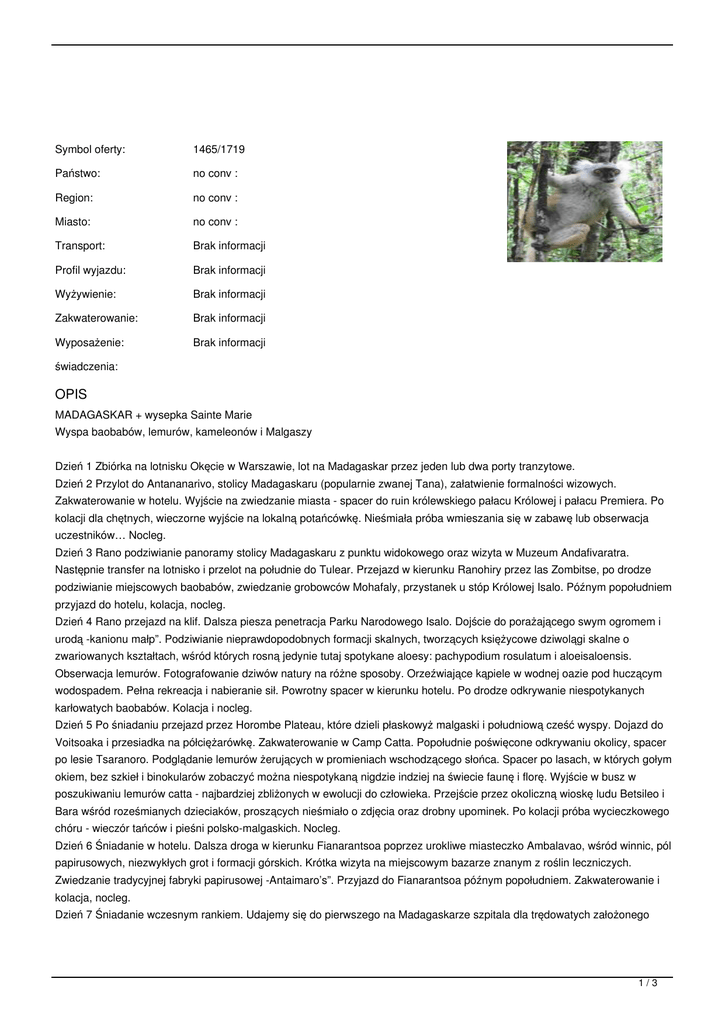 Symbol oferty: 1465/1719 Państwo: no conv : Region: no conv : Miasto: no conv : Transport: Brak informacji Profil wyjazdu: Brak informacji Wyżywienie: Brak informacji Zakwaterowanie: Brak informacji Wyposażenie: Brak informacji świadczenia: OPIS MADAGASKAR + wysepka Sainte Marie Wyspa baobabów, lemurów, kameleonów i Malgaszy Dzień 1 Zbiórka na lotnisku Okęcie w Warszawie, lot na Madagaskar przez jeden lub dwa porty tranzytowe. Dzień 2 Przylot do Antananarivo, stolicy Madagaskaru (popularnie zwanej Tana), załatwienie formalności wizowych. Zakwaterowanie w hotelu. Wyjście na zwiedzanie miasta - spacer do ruin królewskiego pałacu Królowej i pałacu Premiera. Po kolacji dla chętnych, wieczorne wyjście na lokalną potańcówkę. Nieśmiała próba wmieszania się w zabawę lub obserwacja uczestników… Nocleg. Dzień 3 Rano podziwianie panoramy stolicy Madagaskaru z punktu widokowego oraz wizyta w Muzeum Andafivaratra. Następnie transfer na lotnisko i przelot na południe do Tulear. Przejazd w kierunku Ranohiry przez las Zombitse, po drodze podziwianie miejscowych baobabów, zwiedzanie grobowców Mohafaly, przystanek u stóp Królowej Isalo. Późnym popołudniem przyjazd do hotelu, kolacja, nocleg. Dzień 4 Rano przejazd na klif. Dalsza piesza penetracja Parku Narodowego Isalo. Dojście do porażającego swym ogromem i urodą -kanionu małp”. Podziwianie nieprawdopodobnych formacji skalnych, tworzących księżycowe dziwolągi skalne o zwariowanych kształtach, wśród których rosną jedynie tutaj spotykane aloesy: pachypodium rosulatum i aloeisaloensis. Obserwacja lemurów. Fotografowanie dziwów natury na różne sposoby. Orzeźwiające kąpiele w wodnej oazie pod huczącym wodospadem. Pełna rekreacja i nabieranie sił. Powrotny spacer w kierunku hotelu. Po drodze odkrywanie niespotykanych karłowatych baobabów. Kolacja i nocleg. Dzień 5 Po śniadaniu przejazd przez Horombe Plateau, które dzieli płaskowyż malgaski i południową cześć wyspy. Dojazd do Voitsoaka i przesiadka na półciężarówkę. Zakwaterowanie w Camp Catta. Popołudnie poświęcone odkrywaniu okolicy, spacer po lesie Tsaranoro. Podglądanie lemurów żerujących w promieniach wschodzącego słońca. Spacer po lasach, w których gołym okiem, bez szkieł i binokularów zobaczyć można niespotykaną nigdzie indziej na świecie faunę i florę. Wyjście w busz w poszukiwaniu lemurów catta - najbardziej zbliżonych w ewolucji do człowieka. Przejście przez okoliczną wioskę ludu Betsileo i Bara wśród roześmianych dzieciaków, proszących nieśmiało o zdjęcia oraz drobny upominek. Po kolacji próba wycieczkowego chóru - wieczór tańców i pieśni polsko-malgaskich. Nocleg. Dzień 6 Śniadanie w hotelu. Dalsza droga w kierunku Fianarantsoa poprzez urokliwe miasteczko Ambalavao, wśród winnic, pól papirusowych, niezwykłych grot i formacji górskich. Krótka wizyta na miejscowym bazarze znanym z roślin leczniczych. Zwiedzanie tradycyjnej fabryki papirusowej -Antaimaro’s”. Przyjazd do Fianarantsoa późnym popołudniem. Zakwaterowanie i kolacja, nocleg. Dzień 7 Śniadanie wczesnym rankiem. Udajemy się do pierwszego na Madagaskarze szpitala dla trędowatych założonego 1/3 przez polskiego jezuitę ojca Jana Beyzyma. Zwiedzanie kościółka (gdzie znajdują się pamiątki po ojcu) oraz szpitala w towarzystwie strudzonych, ale uśmiechniętych misjonarzy. Następnie wyjazd na północ - przejazd wśród jedynych w swoim rodzaju wzniesień i zboczy górskich, gdzie kolor rdzawo-czerwony dominuje wśród zieleni pól ryżowych przyklejonych do łagodnych zboczy. Podziwianie piętrowych chat Malgaszów, zbudowanych z czerwonej cegły błotnej. Krótki postój w -Zamafiry arts shop” w Ambositra - pracowni oryginalnych rzeźb w drewnie, typowych dla tej części Madagaskaru. Po południu przejazd w kierunku dawnej stacji klimatycznej Antsirabe, niegdyś bardzo znanego, urokliwego kurortu francuskiego, gdzie czas zatrzymał się na kolonialnej przeszłości. Zakwaterowanie w hotelu. Kolacja i nocleg. Dzień 8 Po śniadaniu krótkie zwiedzanie Antsirabe. Przejażdżka rikszami po mieście, ciągnionymi przez muskularnych, dobrze zbudowanych Malgaszów. Odwiedziny w lokalnych wytwórniach rzemieślniczych produkujących słomiane kapelusze, wyroby z rogów i wyroby hafciarskie. Kolejnie przejazd przez malownicze krajobrazy płaskowyżu czerwonej wyspy w kierunku Antananarivo. Wizyta w tradycyjnej wytwórni aluminiowych naczyń w Ambatulambo. Dotarcie do Antananarivo w późnych godzinach popołudniowych. Kolacja, nocleg. Dzień 9 Od rana zwiedzanie Tany - Aleja Niepodległości, Jezioro Anosy, wizyta w Ogrodzie Botanicznym i Zoologicznym Tsimbazaza - zapoznanie się z najważniejszymi gatunkami flory i fauny -Czerwonej Wyspy”. Kolejnie wyjazd do Andasibe. Przejazd wzdłuż zielonych poletek ryżowych, ciekawych dolin i wschodniego lasu. Postój w Mandraka. Wizyta w ośrodku, zajmującym się ochroną niektórych gatunków zwierząt wschodnich lasów deszczowych, m.in. kameleonów, żab, jaszczurek. Kontynuacja przejazdu do Rezerwatu Perinet mijając charakterystyczny las roślin zwanych -uszami słonia”. Dla chętnych nocna penetracja dżungli w poszukiwaniu lemurów i innych nocnych żyjątek lub też okazja do spaceru trzymając za rękę naprędce poznanego towarzysza podróży… Kolacja i nocleg w Andasibe. Dzień 10 Wyjście na spotkanie olbrzymich Indri-Indri (największa odmiana lemurów), które przypominają niedźwiadki koala w kolorach czarno-białych. Perinet jest świetnym miejscem do oglądania ptaków, wśród endemicznej flory spotkamy też malgaskie orchidee. Powrót do hotelu, po czym przeprawa przez zbocza porośnięte palmami ravinala, będącymi symbolem Madagaskaru. Naszym celem będzie tym razem Kanał Pangalan. Majestatyczny rejs po wodach Kanału Pangalan oraz łańcuszku małych jeziorek połączonych ze sobą wodami Kanału. Kolacja i nocleg w hotelu. Dz