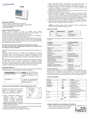 RT500 DEKLARACJA ZGODNOŚCI Produkt jest zgodny z następującymi dyrektyw EC: - Dyrektywą Kompatybilności elektromagnetycznej EMC2004 - Dyrektywą Niskonapięciową 2006/95/EEC - Dyrektywą 93/68/EEC 5. Płytkę montażową dobrze przymocowad do powierzchni ściany lub podtynkowej puszki instalacyjnej, korzystając z przewidzianych otworów. 6. Przewody przyłączyd do zacisków zgodnie ze schematem umieszczonym na urządzeniu, upewniając się, że przewody są mocno zaciśnięte pod kwadratowymi mosiężnymi podkładkami. 7. Urządzenie jest podwójnie izolowane i nie wolno uziemiad go inaczej niż przy pomocy przewidzianego zacisku uziemienia. 8. Standardowa płytka montażowa posiada 6 otworów, przy pomocy których należy zamontowad urządzenie na wybranej powierzchni. Należy zwrócid uwagę, by umocowad wtyki urządzenia w złączkach znajdujących się na płytce montażowej, konieczny jest nieznaczny nacisk ku dołowi; przykręcid za pomocą wkrętów na spodzie płytki montażowej, uważając aby ich nie przekręcid. 9. Włożyd dołączone do zestawu baterie i zaprogramowad urządzenie zgodnie z potrzebami, gdy wszystkie pozostałe elementy są zamontowane, przywrócid zasilanie sieciowe i sprawdzid poprawnośd działania. UWAGA: dla własnej wygody można zainstalowad baterie i zaprogramowad urządzenie przed zamontowaniem go na ścianę. SCHEMAT ZACISKÓW OGÓLNE ZASADY BEZPIECZEOSTWA Poniższe instrukcje odnoszą się tylko do produktu Salus Controls przedstawionego na pierwszej stronie prezentowanej instrukcji obsługi i nie należy stosowad ich przy użyciu jakichkolwiek innych modeli. Instrukcje te odnoszą się do użytkowania produktu na terenie Unii Europejskiej z zachowaniem wszelkich innych zobowiązao ustawowych. Instalacja może byd przeprowadzona tylko przez wykwalifikowanego instalatora oraz musi byd zgodna z wymogami przepisów IEE (BS: 7671) oraz odpowiednimi lokalnymi przepisami kraju użytkownika. Producent nie ponosi odpowiedzialności za postępowanie niezgodne z instrukcją. Instalacja może byd wykonana tylko gdy zasilanie energią jest odłączone. Nie należy stosowad baterii wielokrotnego ładowania oraz używad baterii pochodzących z różnych kompletów. Wykonujący instalację powinien wręczyd instrukcję użytkownikowi urządzenia do wglądu. Urządzenie RT500 jest łatwe w instalacji dzięki dołączonej do zestawu standardowej płytce montażowej, którą można przymocowad bezpośrednio do powierzchni ściany lub za pośrednictwem pojedynczej podtynkowej puszki instalacyjnej przy pomocy przewidzianych otworów; wlot kablowy znajduje się z tyłu. Aby zagwarantowad prawidłowe działanie, urządzenie RT500 należy zainstalowad na wewnętrznej ścianie w miejscu umożliwiającym swobodną cyrkulację powietrza. Unikaj miejsc położonych w pobliżu urządzeo wytwarzających ciepło (np. telewizor, grzejnik, lodówka) lub bezpośrednio nasłonecznionych. Nie instaluj urządzenia w pobliżu drzwi, gdzie termostat będzie narażony na wibracje. PRZEŁĄCZNIKI/ZWORKI W przypadku zmiany ustawieo fabrycznych, instalator powinien wybrad pożądane ustawienie zworki – zworki znajdują się na odwrocie urządzenia. Przełącznik/Zworka Rozpiętośd temperatur Typ programu Funkcja 1 zworka do wyboru +/- 0,5°C (ustawienia fabryczne) lub 1,0°C 1 zworka dla 5/2-dniowego (ustawienia fabryczne) lub 7dniowego programu. INSTALACJA PŁYTKI MONTAŻOWEJ I OKABLOWANIA MODELU RT500 Urządzenie nie wymaga uziemienia, zacisk uziemienia przewidziany jest wyłącznie z uwagi na bezpieczne podłączenie wszystkich przewodów uziemiających. 1. Wybrad odpowiednią lokalizację dla urządzenia, mając na względzie wskazówki umieszczone na stronie 2 niniejszej instrukcji; odpowiednia wysokośd dla montażu wynosi 1,5m powyżej wierzchniego poziomu podłogi. 2. Odłączyd zasilanie sieciowe, pamiętając, że musi to byd sied o napięciu 230V z bezpiecznikiem sieciowym 5A. 3. Optymalny przekrój kabla wynosi 1,5mm; kolory kabli różnią się w zależności od kraju i nie są określone w niniejszej instrukcji. 4. Wprowadzid kabel przez tylną częśd płytki montażowej. ZACISK 1 2 3 IDENTYFIKATOR L SL uziemienie FUNKCJA Faza Faza wyłączana uziemienie Poniższa tabela przedstawia ustawienia fabryczne termostatu (lub stan po restarcie): FUNKCJA Tryb pracy Temperatura pomieszczenia Wskaźnik °C Zegar AM/PM przed południem/po południu Dzieo tygodnia Program Wartośd zadana temperatury Oznaczenie numeru programu Oznaczenie SET Oznaczenie PROG Wskaźnik zabezpieczenia przed zamarzaniem Wskaźnik nagrzania/HEAT Wskaźnik niskiego stanu baterii STAN PO RESTARCIE Normalny 22°C – aktualizacja co 5 sekund Włączony 12:00 AM(rano) M-poniedziałek Ustawienia fabryczne Ustawienia fabryczne 1 Wyłączone Wyłączone Wyłączony Wyłączony Wyłączony – aktualizacja co 5 sekund Wyjście przekaźnika Wyłączone Po zresetowaniu lub włączeniu, termostat będzie pracował w trybie Normalnym. Wartośd zadana temperatury jest zresetowana do ustawieo fabrycznych. Temperatura w pomieszczeniu zaktualizuje się w ciągu 5 sekund, rozpoczynając proces regulacji. Numer programu zaktualizuje się, wskazując bieżący program. FUNKCJE PRZYCISKÓW: Przycisk Przycisk UP/GÓRA Przycisk DOWN/DÓŁ BL/FROST SELECT SET RESET Symbol Funkcja Zwiększa nastawę temperatury Zmniejsza nastawę temperatury Włącz lub wyłącz podświetlenie LCD – przytrzymad 5 sekund/ aktywacja tryb przeciwzamroż. Ustawienia zegara i programów Ustawienie zegara i programów Restart systemu PIERWSZE WŁĄCZENIE LUB URUCHOMIENIE PO RESTARCIE Podczas restartu systemu wszystkie segmenty LCD są nieaktywne przez 3 sekundy po których urządzenie zaczyna działad Po uruchomieniu widad poniższy ekran LCD. USTAWIANIE DNIA/GODZINY Zegar i dni tygodnia są wyświetlane na ekranie LCD, wszystkie pozostałe oznaczenia nie są wyświetlane. Wciśnij i przytrzymaj jednocześnie przyciski SET i SELECT w normalnym