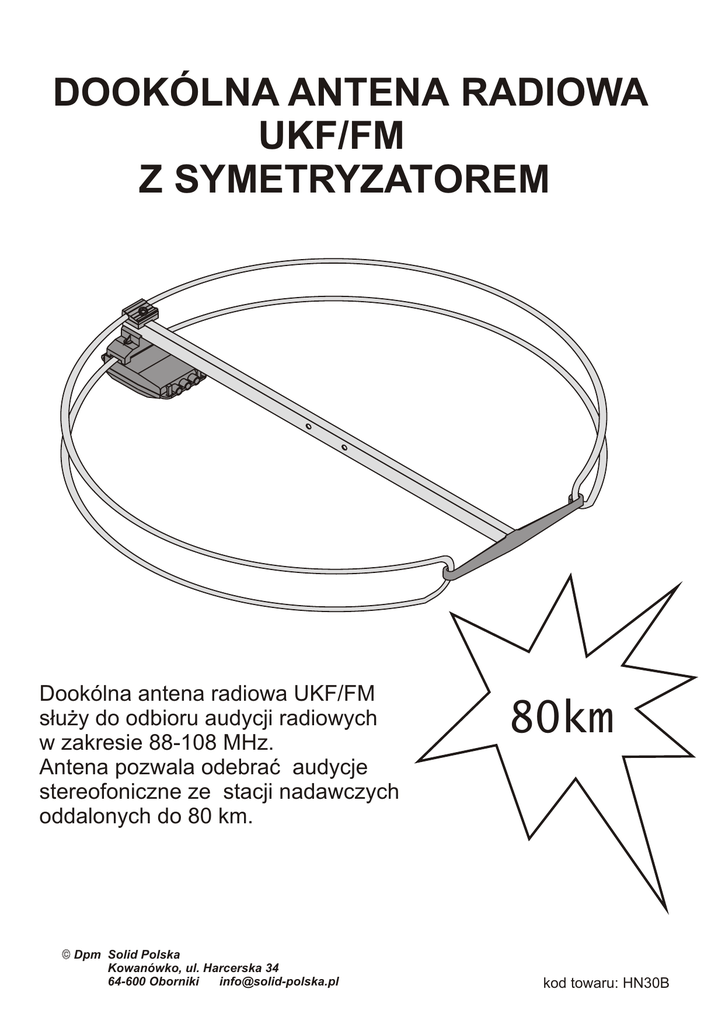 DOOKÓLNA ANTENA RADIOWA UKF/FM Z SYMETRYZATOREM Dookólna antena radiowa UKF/FM s³u¿y do odbioru audycji radiowych w zakresie 88-108 MHz. Antena pozwala odebraæ audycje stereofoniczne ze stacji nadawczych oddalonych do 80 km. Dpm Solid Polska Kowanówko, ul. Harcerska 34 64-600 Oborniki [email protected] 80km kod towaru: HN30B Instrukcja monta¿u . Schemat po³¹czenia anteny z odbiornikiem radiowym (wersja z symetryzatorem). 1. Przygotowaæ odpowiedni¹ d³ugoœæ przewodu antenowego - koncentrycznego 75 ohm 2. Koñcówkê kabla po stronie anteny przygotowaæ zgodnie z Rys.2, nakrêciæ wtyk Fi pod³¹czyæ do gniazda F w puszce antenowej Rys.3. 3. Zamocowaæ antenê na maszcie zgodnie z Rys.4 i skierowaæ j¹ na nadajnik radiowy UKF FM 4. Koñcówkê kabla po stronie odbiornika przygotowaæ zgodnie z rysunkiem Rys.1 i za³o¿yæ wtyk antenowy (wtyk nie jest do³¹czony do zestawu) Koñcówka do wtyku antenowego Koñcówka do puszki antenowej - wtyk F Rys. 1 Rys. 2 Symetryzator w puszce antenowej wtyk F Wtyczka antenowa Rys. 3 Kabel koncentryczny 75 ohm Rys.4 Najlepszy kierunek odbioru Dpm Solid Polska Kowanówko, ul. Harcerska 34 64-600 Oborniki [email protected]