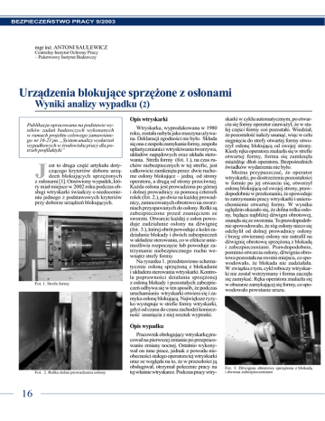 BEZPIECZEÑSTWO PRACY 9/2003 mgr in¿. ANTONI SAULEWICZ Centralny Instytut Ochrony Pracy Pañstwowy Instytut Badawczy Urz¹dzenia blokuj¹ce sprzê¿one z os³onami Wyniki analizy wypadku (2) Publikacja opracowana na podstawie wyników zadañ badawczych wykonanych w ramach projektu celowego zamawianego nr 16-21 pn. System analizy wydarzeñ wypadkowych w rodowisku pracy dla potrzeb profilaktyki est to druga czêæ artyku³u dotycz¹cego kryteriów doboru urz¹dzeñ blokuj¹cych sprzê¿onych z os³onami [1]. Omówiony wypadek, który mia³ miejsce w 2002 roku podczas obs³ugi wtryskarki wiadczy o niedocenieniu jednego z podstawowych kryteriów przy doborze urz¹dzeñ blokuj¹cych. Fot. 1. Strefa formy Opis wtryskarki Wtryskarka, wyprodukowana w 1980 roku, zosta³a nabyta jako maszyna u¿ywana. Deklaracji zgodnoci nie by³o. Sk³ada siê ona z zespo³u zamykania formy, zespo³u uplastyczniania i wtryskiwania tworzywa, uk³adów napêdowych oraz uk³adu sterowania. Strefa formy (fot. 1.), na czas ruchów niebezpiecznych w tej strefie, jest ca³kowicie zamkniêta przez dwie ruchome os³ony blokuj¹ce jedn¹ od strony operatora, a drug¹ od strony przeciwnej. Ka¿da os³ona jest prowadzona po górnej i dolnej prowadnicy za pomoc¹ czterech rolek (fot. 2.), po dwie na ka¿dej prowadnicy, zamocowanych obrotowo na sworzniach przyspawanych do os³ony. Rolki s¹ zabezpieczone przed zsuniêciem ze sworzni. Otwarcie ka¿dej z os³on powoduje zadzia³anie os³ony na dwigniê (fot. 3.), której obrót powoduje z kolei zadzia³anie blokady i dwóch zabezpieczeñ w uk³adzie sterowania, co w efekcie uniemo¿liwia rozpoczêcie lub powoduje zatrzymanie niebezpiecznego ruchu wewn¹trz strefy formy. Na rysunku 1. przedstawiono schematycznie os³onê sprzê¿on¹ z blokadami i uk³adem sterowania wtryskarki. Kontrola poprawnoci dzia³ania sprzê¿onej z os³on¹ blokady i pozosta³ych zabezpieczeñ odbywa siê w ten sposób, ¿e podczas uruchamiania wtryskarki otwiera siê i zamyka os³onê blokuj¹c¹. Najwiêksze ryzyko wystêpuje w strefie formy wtryskarki, gdy¿ od czasu do czasu zachodzi koniecznoæ usuniêcia z niej resztek wypraski. skarki w cyklu automatycznym, po otwarciu siê formy operator zauwa¿y³, ¿e w sta³ej czêci formy co pozosta³o. Wiedzia³, ¿e pozosta³oæ nale¿y usun¹æ, wiêc w celu siêgniêcia do strefy otwartej formy otworzy³ os³onê blokuj¹c¹ od swojej strony. Kiedy rêka operatora znalaz³a siê w strefie otwartej formy, forma siê zamknê³a mia¿d¿¹c d³oñ operatora. Bezporednich wiadków wydarzenia nie by³o. Mo¿na przypuszczaæ, ¿e operator wtryskarki, po dostrze¿eniu pozosta³oci w formie po jej otwarciu siê, otworzy³ os³onê blokuj¹c¹ od swojej strony, prawdopodobnie w przekonaniu, ¿e spowoduje to zatrzymanie pracy wtryskarki i unieruchomienie otwartej formy. W wyniku oglêdzin okaza³o siê, ¿e dolna rolka os³ony, bêd¹ca najbli¿ej dwigni obrotowej, zsunê³a siê ze sworznia. To prawdopodobnie spowodowa³o, ¿e róg os³ony nieco siê odchyli³ od dolnej prowadnicy os³ony i brzeg otwieranej os³ony nie natrafi³ na dwigniê obrotow¹ sprzê¿on¹ z blokad¹ i zabezpieczeniami. Prawdopodobnie, pomimo otwarcia os³ony, dwignia obrotowa pozosta³a na swoim miejscu, co spowodowa³o, ¿e blokada nie zadzia³a³a. W zwi¹zku z tym, cykl roboczy wtryskarki nie zosta³ wstrzymany i forma zaczê³a siê zamykaæ. Rêka operatora znalaz³a siê w obszarze zamykaj¹cej siê formy, co spowodowa³o powstanie urazu. Opis wypadku Fot. 2. Rolka dolna prowadzenia os³ony 16 Pracownik obs³uguj¹cy wtryskarkê pracowa³ na pierwszej zmianie po przepracowaniu zmiany nocnej. Ostatnio wykonywa³ on inne prace, jednak z powodu nieobecnoci sta³ego operatora tej wtryskarki oraz ze wzglêdu na to, ¿e w przesz³oci j¹ obs³ugiwa³, otrzyma³ polecenie pracy na tej w³anie wtryskarce. Podczas pracy wtry- Fot. 3. Dwignia obrotowa sprzê¿ona z blokad¹ i dwoma zabezpieczeniami BEZPIECZEÑSTWO PRACY 9/2003 WYPADEK Przyczyny wypadku Bezporedni¹ przyczyn¹ wypadku by³o zamkniêcie siê formy wtryskarki w czasie, gdy znajdowa³a siê w niej rêka operatora. Przyczyny porednie wypadku to: uszkodzenie mechanizmu prowadzenia os³ony, a w szczególnoci zsuniêcie siê rolki prowadz¹cej ze sworznia przyspawanego do os³ony; spowodowa³o to zmianê po³o¿enia os³ony, niezadzia³anie jej na dwigniê uchyln¹, a w konsekwencji niezadzia³anie blokady; nast¹pi³o wiêc przerwanie sprzê¿enia os³ony z blokad¹ i uk³adem sterowania wtryskarki oraz natychmiastowa utrata bezwarunkowej funkcji bezpieczeñstwa realizowanej przez blokadê budowa uk³adu sterowania nieodpowiednia do du¿ego ryzyka wystêpuj¹cego w strefie formy, w szczególnoci za: zastosowanie niew³aciwego, ze wzglêdu na wymagania dotycz¹ce bezpieczeñstwa, rozwi¹zania sprzê¿enia os³ony z blokad¹, bowiem istnia³o w tym sprzê¿eniu prawdopodobieñstwo wyst¹pienia defektu z natychmiastow¹ utrat¹ bezwarunkowej funkcji bezpieczeñstwa nie zastosowano np. rozwi¹zania wykluczaj¹cego defekt w tym sprzê¿eniu, np. redundancji zale¿noæ dzia³ania blokady i dwóch innych zabezpieczeñ tylko od jednego sprzê¿onego z nimi wspólnego elementu dwigni na wa³ku obrotowym; w efekcie defekt w sprzê¿eniu dwigni z os³on¹ 5 1 3 4 2 1 - obwód 2 - obwód 3 - os³ona 4 - os³ona 5 - g³ówne mocy sterowania ruchoma zamkniêta ruchoma otwarta urz¹dzenie wy³¹czaj¹ce Rys. 1. Schemat os³ony sprzê¿onej z blokad¹ i uk³adem sterowania wtryskarki ZAGRO¯ENIE - energia zamykaj¹cego ruchu formy RÊKA W STREFIE ZAGRO¯ENIA (w strefie formy) NIEWYSTARCZAJ¥CA BARIERA zmêczenie operatora niew³aœciwy stan techniczny os³ony niewystarczaj¹ce doœwiadczenie zawodowe operatora budowa uk³adu sterowania nieodpowiednia do du¿ego ryzyka w strefie formy uszkodzenie prowadzenia os³ony blokuj¹cej sprzê¿onej z uk³adem sterowania wtryskarki brak systemu przegl¹dów profilaktycznych maszyn Rys. 2. Model wypadku podcz