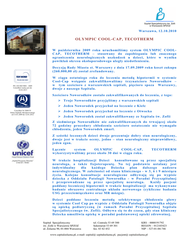 Szpital Specjalistyczny św. Zofii w Warszawie SPZOZ Warszawa, 12.10.2010 OLYMPIC COOL-CAP, TECOTHERM W październiku 2009 roku uruchomiliśmy system OLYMPIC COOLCAP, TECOTHERM – stosowany do zapobiegania lub znacznego ograniczenia neurologicznych uszkodzeń u dzieci, które w wyniku powikłań okresu okołoporodowego uległy niedotlenieniu. Decyzją Rady Miasta st. Warszawy z dnia 17.09.2009 roku koszt zakupu (260.000,00 zł) został zrefundowany. PN- EN ISO 9001 : 2009 Certyfikat waŜny jest do 18.02.2013 W ciągu ostatniego roku do leczenia metodą hipotermii w systemie Cool-Cap wstępnie zakwalifikowaliśmy trzynaścioro Noworodków – w tym sześcioro z warszawskich szpitali, pięcioro spoza Warszawy, dwoje z naszego Szpitala. Sześcioro Noworodków zostało zakwalifikowanych do leczenia, z tego: Troje Noworodków przyjęliśmy z warszawskich szpitali Jeden Noworodek przyjechał na leczenie z Kielc Certyfikat Nr 2008/35 Status Szpitala Akredytowanego od 13.01.2009 do 12.01.2012 Jeden Noworodek przyjechał na leczenie z Otwocka Jeden Noworodek został zakwalifikowany ze Szpitala św. Zofii Z siedmiorga Noworodków nie zakwalifikowanych do trwającej około 72 godziny procedury chłodzenia sześcioro ostatecznie nie wymagało chłodzenia, jeden Noworodek zmarł. Z szóstki leczonych dzieci dwoje prezentuje dobry stan neurologiczny, dwoje jest w trakcie oceny, jedno – stan neurologiczny nieprawidłowy, jeden zgon. Łącznie system OLYMPIC COOL-CAP, wykorzystywaliśmy przez około 30 dni w ciągu roku. „Szpital Przyjazny Dziecku” UNICEF i WHO TECOTHERM W trakcie hospitalizacji Dzieci konsultowane są przez specjalistę neurologa, a takŜe fizjoterapeutę. Na tej podstawie ustalany jest indywidualny dla kaŜdego Dziecka plan dalszego nadzoru neurologicznego. W zaleŜności od stanu klinicznego - w 3, 6 i 9 miesiącu Ŝycia. Kolejne konsultacje neurologiczne odbywają się po wypisie dziecka z Oddziału Patologii Noworodka - w Poradni Przyszpitalnej i przeprowadzane są przez specjalistę neurologa. KaŜdy pacjent poddany leczniczej hipotermii w trakcie hospitalizacji ma wykonywane badanie obrazowe centralnego układu nerwowego (cykliczne badania USG przezciemiączkowe oraz MR mózgu). Dzieci poddane leczeniu metodą selektywnego chłodzenia głowy w systemie Cool Cap po wypisie z Oddziału Patologii Noworodka objęte są opieką pediatryczną (w ramach Poradni Przyszpitalnej Szpitala Specjalistycznego św. Zofii). Odbywa się to do czasu, gdy stan kliniczny Dziecka umoŜliwia opiekę w poradni podstawowej opieki zdrowotnej. Szpital Specjalistyczny św. Zofii w Warszawie SPZOZ ul. śelazna 90, 01-004 Warszawa tel. Centrala 53 69 300 Sekretariat 53 69 301 fax. 83 82 452 KRS – 0000191792 REGON – 012103423 NIP – 527-01-04-746 www.szpitalzelazna.pl, e-mail: szpital@ szpitalzelazna.pl, pacjent@ szpitalzelazna.pl