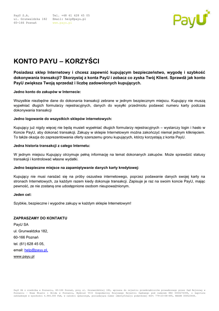 PayU S.A. ul. Grunwaldzka 182 60-166 Poznań Tel. +48 61 628 45 05 Email: [email protected] www.payu.pl KONTO PAYU – KORZYŚCI Posiadasz sklep Internetowy i chcesz zapewnić kupującym bezpieczeństwo, wygodę i szybkość dokonywania transakcji? Skorzystaj z konta PayU i zobacz co zyska Twój Klient. Sprawdź jak konto PayU zwiększa Twoją sprzedaż i liczbę zadowolonych kupujących. Jedno konto do zakupów w Internecie: Wszystkie niezbędne dane do dokonania transakcji zebrane w jednym bezpiecznym miejscu. Kupujący nie muszą wypełniać długich formularzy rejestracyjnych, danych do wysyłki przedmiotu podawać numeru karty podczas dokonywania transakcji Jedno logowanie do wszystkich sklepów internetowych: Kupujący już nigdy więcej nie będą musieli wypełniać długich formularzy rejestracyjnych – wystarczy login i hasło w Koncie PayU, aby dokonać transakcji. Zakupy w sklepie Internetowym można zakończyć niemal jednym kliknięciem. To także okazja do zaprezentowania oferty szerszemu gronu kupujących, którzy korzystają z konta PayU. Jedna historia transakcji z całego Internetu: W jednym miejscu Kupujący otrzymuje pełną informację na temat dokonanych zakupów. Może sprawdzić statusy transakcji i kontrolować własne wydatki. Jedno bezpieczne miejsce na zapamiętywanie danych karty kredytowej: Kupujący nie musi narażać się na próby oszustwa internetowego, poprzez podawanie danych swojej karty na stronach Internetowych, za każdym razem kiedy dokonuje transakcji. Zapisuje je raz na swoim koncie PayU, mając pewność, ze nie zostaną one udostępnione osobom nieupoważnionym. Jeden cel: Szybkie, bezpieczne i wygodne zakupy w każdym sklepie Internetowym! ZAPRASZAMY DO KONTAKTU PayU SA ul. Grunwaldzka 182, 60-166 Poznań tel. (61) 628 45 05, email: [email protected], www.payu.pl PayU SA z siedzibą w Poznaniu, 60-166 Poznań, przy ul. Grunwaldzkiej 182, wpisana do rejestru przedsiębiorców prowadzonego przez Sąd Rejonowy w Poznaniu – Nowe Miasto i Wilda w Poznaniu, Wydział VIII Gospodarczy Krajowego Rejestru Sądowego pod numerem KRS 0000274399, o kapitale zakładowym w wysokości 4.944.000 PLN, w całości opłaconym, posiadająca numer identyfikacji podatkowej NIP: 779-23-08-495, REGON 300523444.