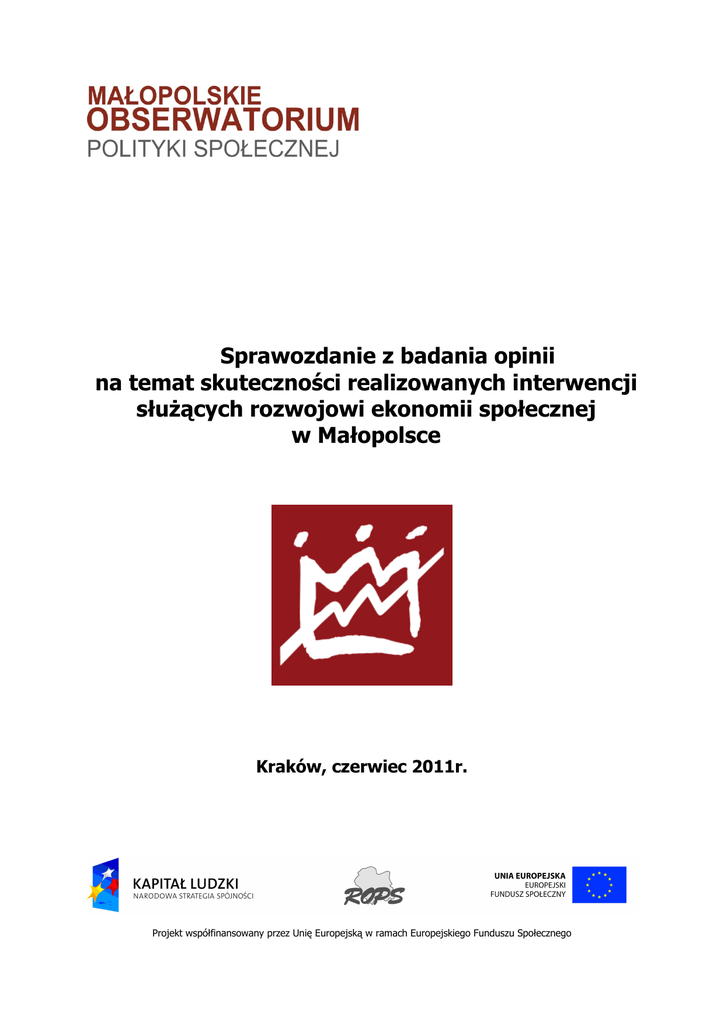 Sprawozdanie z badania opinii na temat skuteczności realizowanych interwencji słuŜących rozwojowi ekonomii społecznej w Małopolsce Kraków, czerwiec 2011r. Projekt współfinansowany przez Unię Europejską w ramach Europejskiego Funduszu Społecznego ZAWARTOŚĆ WYKAZ SKRÓTÓW.............................................................................................................................................................3 WPROWADZENIE...............................................................................................................................................................4 WNIOSKI I REKOMENDACJE .........................................................................................................................................5 SYNTEZA WYNIKÓW Z POSZCZEGÓLNYCH WYWIADÓW GRUPOWYCH .................................................9 ZAŁĄCZNIKI....................................................................................................................................................................... 15 2 WYKAZ SKRÓTÓW ES – Sektor ekonomii społecznej NGO – Organizacje pozarządowe (non-governmental organisation) PES – Podmioty ekonomii społecznej PS – Przedsiębiorstwo społeczne JST – Jednostka Samorządu Terytorialnego PO KL – Program Operacyjny Kapitał Ludzki OWES – ośrodek wsparcia ekonomii społecznej/ punkt skierowany do podmiotów ekonomii społecznej oraz osób i organizacji zainteresowanych tematyką ekonomii społecznej, prowadzony przez Podmioty realizujące Projekty w ramach Podzdziałania 7.2.2 Wsparcie ekonomii społecznej Programu Operacyjnego Kapitał Ludzki 2007 - 2013 3 WPROWADZENIE Niniejsze sprawozdanie podsumowuje badanie opinii interesariuszy odnośnie skuteczności realizowanych w ramach Programu Operacyjnego Kapitał Ludzki 2007 - 2013 interwencji służących rozwojowi ekonomii społecznej w Małopolsce. W ramach projektu przeprowadzono w okresie 27 – 30 maja 2011 r. trzy zogniskowane wywiady grupowe (FGI) z: • koordynatorami i pracownikami merytorycznymi w projektach realizowanych w ramach Poddziałania 7.2.2 PO KL; • osobami zarządzającymi spółdzielniami socjalnymi, które uzyskały wsparcie w ramach projektów realizowanych w Poddziałaniu 7.2.2 PO KL; • przedstawicielami organizacji pozarządowych w ramach Poddziałania 7.2.2 PO KL. korzystających ze wsparcia W dalszej części sprawozdania przedstawiono wnioski i rekomendacje wynikające z badania, a także syntezę wyników z poszczególnych wywiadów grupowych. Do dokumentu dołączono narzędzia użyte w ramach wywiadów grupowych. 4 WNIOSKI I REKOMENDACJE WNIOSKI 1. Poziom integracji i wymiany informacji pomiędzy poszczególnymi grupami interesariuszy jest zdecydowanie niewystarczający. REKOMENDACJE 1. Integracja grup interesariuszy, aby była trwała, musi wynikać z działań oddolnych – samoorganizacji podmiotów. Działalność administracji publicznej powinna się sprowadzać do: a) stwarzania przestrzeni dla samoorganizacji podmiotów (np. w ramach grup roboczych Małopolskiego Paktu na Rzecz Ekonomii Społecznej); b) udostępniania/promowania narzędzi wymiany informacji; c) popularyzowania dobrych praktyk w tym zakresie. 2. Działalność Ośrodków Wsparcia Ekonomii Społecznej nie jest w wystarczający sposób koordynowana. 2. Należy dążyć do utrzymania sieci wsparcia składającej się z istniejących ośrodków. Należy przy tym wskazać jedną instytucję, a w niej konkretne osoby odpowiedzialne za koordynację działań Ośrodków Wsparcia Ekonomii Społecznej. Nowy model współpracy powinien zostać wypracowany z udziałem Ośrodków Wsparcia. 3. Ekonomia społeczna w Małopolsce jest w niewystarczający sposób osadzona 3. Należy podjąć bardziej intensywnie działania ukierunkowane na: w szerszym systemie społeczno – instytucjonalnym, co zagraża jej trwałości a) zawieranie partnerstw lokalnych z udziałem JST; po zakończeniu obecnego okresu finansowania. b) kreowania popytu na produkty i usługi podmiotów ekonomii społecznej (m.in. poprzez wykorzystanie przez JST klauzul społecznych w ramach zamówień publicznych); c) mocniejsze zaangażowanie „klasycznych” przedsiębiorców w przedsięwzięcia 5 WNIOSKI REKOMENDACJE z zakresu ekonomii społecznej (m.in. w wymiarze lokalnym). 4. Udzielanie dotacji jedynie spółdzielniom socjalnym generuje kilka niezamierzonych efektów: 4. W celu podniesienia efektywności i trwałości dotacji rekomenduje się, obok dalszego ich stosowania, następujące działania: a) osoby fizyczne i prawne zainteresowane prowadzeniem działalności z zakresu ekonomii społecznej skłania to do częstszego wybierania tej formy prawnej działalności, kosztem innych (np. organizacji pozarządowej prowadzącej działalność gospodarczą); a) rozszerzenie przyznawania dotacji na organizacje pozarządowe prowadzące działalność gospodarczą; b) w skrajnych przypadkach dotacje stają się najważniejszym powodem zakładania spółdzielni socjalnych, co zagraża trwałości ich funkcjonowania i trwałości wsparcia; podmioty otrzymujące wsparcie nie są bowiem przygotowane na trudności, które pojawiają się po wygaśnięciu wsparcia. c) przy niewystarczającym weryfikowaniu wniosków podmioty otrzymujące dotacje, mogą niekiedy nie być w wystarczającym stopniu przygotowane do efektywnego wykorzystania otrzymanego wsparcia. 5. Jednocześnie bezpośrednie wsparcie finansowe jest działaniem niezbędnym dla funkcjonowania i rozwoju podmiotów ekonomii społecznej i jest na nie duże zapotrzebowanie. b) pogłębioną ocenę wniosków o dotacje; c) przygotowywanie potencjalnych założycieli spółdzielni socjalnych na trudności związane z tą formą działalności poprzez informowanie ich o barierach, które mogą napotkać oraz stosowanych sposobach rozwiązywania problemów (studia przypadków); d) zwiększenie stopnia przewidywalności faktu dostępności