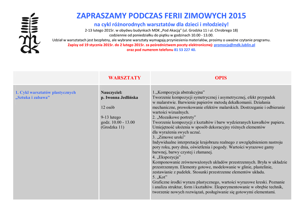 ZAPRASZAMY PODCZAS FERII ZIMOWYCH 2015 na cykl różnorodnych warsztatów dla dzieci i młodzieży! 2-13 lutego 2015r. w obydwu budynkach MDK „Pod Akacją” (ul. Grodzka 11 i ul. Chrobrego 18) codziennie od poniedziałku do piątku w godzinach 10.00 - 13.00. Udział w warsztatach jest bezpłatny, ale wybrane warsztaty wymagają przyniesienia materiałów, prosimy o uważne czytanie programu. Zapisy od 19 stycznia 2015r. do 2 lutego 2015r. za pośrednictwem poczty elektronicznej: [email protected] oraz pod numerem telefonu 81 53 227 40. WARSZTATY 1. Cykl warsztatów plastycznych „Sztuka i zabawa” Nauczyciel: p. Iwonna Jedlińska 12 osób 9-13 lutego godz. 10.00 - 13.00 (Grodzka 11) OPIS 1.„Kompozycja abstrakcyjna” Tworzenie kompozycji symetrycznej i asymetrycznej, efekt przypadek w malarstwie. Barwienie papierów metodą dekalkomanii. Działania mechaniczne, prowokowanie efektów malarskich. Dostrzeganie i odbieranie wartości wizualnych. 2. „Mozaikowe portrety” Tworzenie kompozycji z kształtów i barw wydzieranych kawałków papieru. Umiejętność ułożenia w sposób dekoracyjny różnych elementów dla wyrażenia swych uczuć. 3. „Zimowe uroki” Indywidualne interpretacje krajobrazu realnego z uwzględnieniem nastroju pory roku, pory dnia, oświetlenia i pogody. Wartości wyrazowe gamy barwnej, barwy czystej i złamanej. 4. „Ekspozycja” Komponowanie zrównoważonych układów przestrzennych. Bryła w układzie przestrzennym. Elementy gotowe, modelowanie w glinie, plastelinie, zestawianie z pudełek. Stosunki przestrzenne elementów układu. 5. „Kot” Graficzne środki wyrazu plastycznego, wartości wyrazowe kreski. Poznanie i analiza struktur, form i kształtów. Eksperymentowanie w obrębie technik, tworzenie nowych rozwiązań, posługiwanie się gotowymi elementami. 2. Warsztaty plastyczne: „Świat baśni i Anioły” − Poniedziałek - środa: cykl trzydniowy, materiały: kredki pastele - olejne, brystol A3 1 blok − Czwartek - piątek: cykl dwudniowy, materiały: 1 kg mąki + 1 kg soli Nauczyciel: p. Agata FijewskaPajdowska 12 osób 6-12 lat 2-6 lutego 2015 (Grodzka 11) 3. Warsztaty plastyczne 1. Poniedziałek: „świat zamknięty w butelce” - mini rzeźba, materiały: małe szklane buteleczki, plastelina ewentualnie klej na gorąco 2. Wtorek: „Ruchome obrazy”, materiały: farby akrylowe, ołówki, brystol, noże do papieru, taśma dwustronna, klej 3. Środa: „Cieniowanie ściany”, materiały: markery, brystol, farby akrylowe, taśma papierowa 4. Czwartek: „Taśmą malowane”, materiały: farby akrylowe, brystol, taśma papierowa, noże do papieru 5. Piątek: Warsztaty: „Sztuka podana na tacy”, materiały: farby akrylowe, tacki tekturowe, pędzle, złoty spray. Nauczyciele: p. Ewa DziekońskaSarlińska, p. Katarzyna Niedźwiadek 10 osób 10-15 lat 2-6 lutego 2015 (Chrobrego 18) 4. Warsztaty plastyczne - Linoryt-technika Nauczyciele grafiki warsztatowej. Wykonywanie małych p. Magdalena Ciężak, form graficznych. p. Monika Wesołowska 10 osób 10-18 lat Temat prac: „Anioły”. 5 dni: Zapoznanie dzieci z nową techniką plastyczną - linorytem. Uczestnicy warsztatów samodzielnie wykonują projekty, przenoszą je na matryce z linoleum, przy pomocy dłut graficznych wykonują grafikę, pod kierunkiem nauczycieli samodzielnie wykonują odbitkę graficzną w wersji czarno-białej i na kolorowym podkładzie z akwareli. 9-13 lutego 2015 (Chrobrego 18) Materiały: małe pudełko akwareli, ołówek, gumka, arkusz ciemnej kalki technicznej. Warsztaty w MDK „Pod Akacją” w Lublinie, 2-13.02.2015 • www.mdk.lublin.pl, facebook.com/mdklublin -2- 5. Warsztaty plastyczne w pracowni mody młodzieżowej 1. Poniedziałek: „Fałdy i załamania” - obrazy z tkaniny, tworzenie „patchworków na papierze”, materiały: klej w tubce (wikol, magic itp.), niepotrzebne skrawki tkanin, firanek 2. Wtorek: „Filcowe CoNieco” 3. Środa: Igielniki - kapelusze - szycie praktycznych igielników 4. Czwartek: „Papierowa moda”- projektowanie unikatowych papierowych kreacji (wstęp - krótka historia mody, pogadanka i prezentacja multimedialna), materiały: sznurek, guziki, folia aluminiowa lub bąbelkowa 5. Piątek: „Filcowa mozaika” - projektowanie i tworzenie drobnych form dekoracyjnych z drobnych fragmentów filcu, talerzyki papierowe okrągłe, klej (j.w.), czarny akryl Nauczyciele: p. Kamila ŚpiewlaKasperek, p. Renata Małyska 10 osób 8-13 lat 2-6 lutego 2015 (Grodzka 11) 6. Warsztaty teatralne 1. 2. 3. Nauczyciel: p. Mieczysław Wojtas 15 osób 12-18 lat Poniedziałek: Zabawy parateatralne i gry dramatyczne Wtorek: Ruch i ekspresja ciała - wyrażanie emocji Środa: Odkrywanie słowa - zajęcia poświęcone poprawności i kulturze mówienia 9-11 lutego 2015 (Grodzka 11) 7. Warsztaty teatralne 1. Wykonanie lalek charakterystycznych. Poszukiwanie symboli i znaków plastycznych 2. Opracowanie i prezentacja krótkich scenek teatralnych inspirowanych wierszem „Na straganie” 3. Wykonanie „królewskich” lalek z szarego papieru. Poszukiwanie cech „dworskości”. 4. Wykonanie aniołów z materiałów o efekcie fluo. Pierwsze doświadczanie czarnego teatru. Nauczyciel: p. Joanna FranaszczukNowak 10 osób 6-12 lat 2-6 lutego 2015 (Grodzka 11) Warsztaty w MDK „Pod Akacją” w Lublinie, 2-13.02.2015 • www.mdk.lublin.pl, facebook.com/mdklublin -3- 8. Warsztaty teatralne i fotograficzne − Poniedziałek: Warsztaty teatralne AKTOR I REŻYSER W TEATRZE DZIECIĘCYM, materiały: bibuła karbowana w różnych kolorach, taśma malarska (Chrobrego) − Wtorek: Warsztaty fotograficzne PRACA FOTOGRAFA W CIEMNI TRADYCYJNEJ, materiały: papier pakowy, taśma samoprzylepna, klej i nożyczki (Grodzka 11) − Środa: Warsztaty teatralne SCENOGRAF I AKTOR W TEATRZE DZIECIĘCYM, materiały: farbki w kredkach do malowania twarzy, bloki rysunkowe lub białe kartki papieru xero, kredki bambino, ołówki, temperówka, gumki do ścierania, bibuły w ró