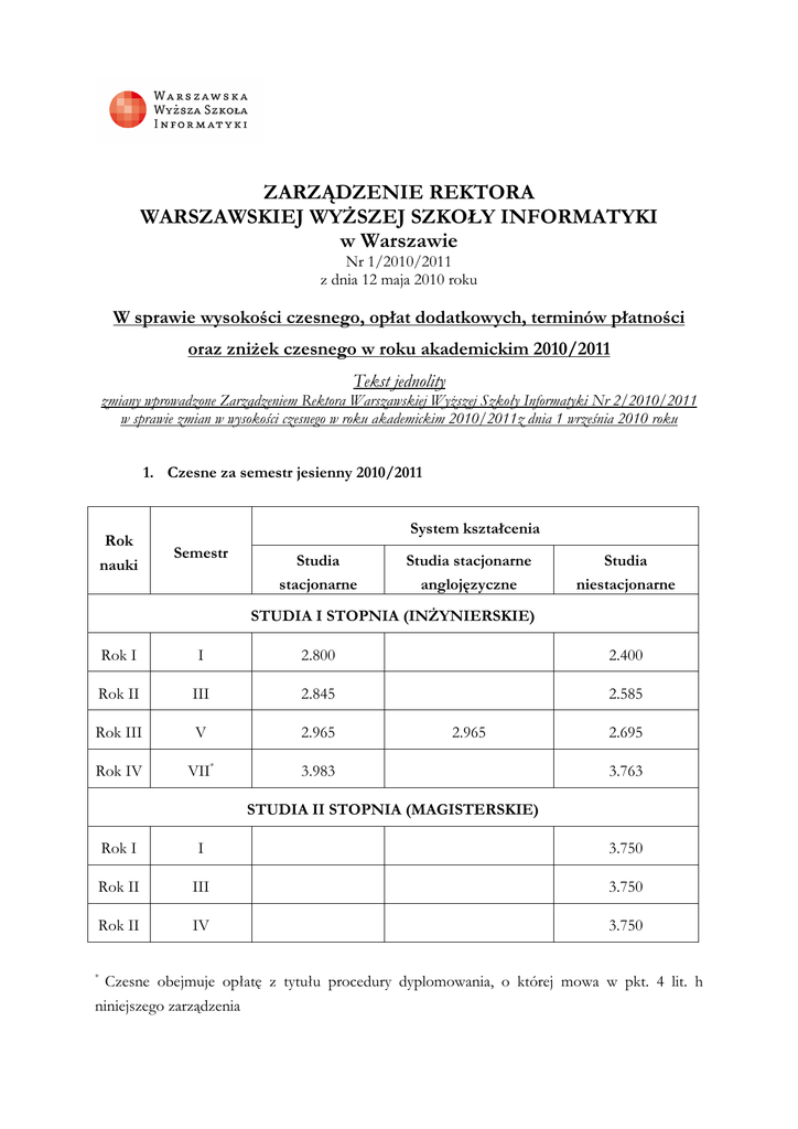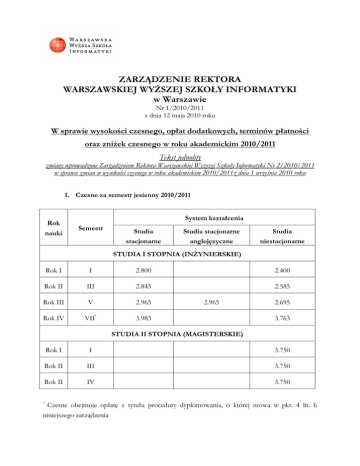ZARZĄDZENIE REKTORA WARSZAWSKIEJ WYŻSZEJ SZKOŁY INFORMATYKI w Warszawie Nr 1/2010/2011 z dnia 12 maja 2010 roku W sprawie wysokości czesnego, opłat dodatkowych, terminów płatności oraz zniżek czesnego w roku akademickim 2010/2011 Tekst jednolity zmiany wprowadzone Zarządzeniem Rektora Warszawskiej Wyższej Szkoły Informatyki Nr 2/2010/2011 w sprawie zmian w wysokości czesnego w roku akademickim 2010/2011z dnia 1 września 2010 roku 1. Czesne za semestr jesienny 2010/2011 Rok nauki System kształcenia Semestr Studia stacjonarne Studia stacjonarne anglojęzyczne Studia niestacjonarne STUDIA I STOPNIA (INŻYNIERSKIE) Rok I I 2.800 2.400 Rok II III 2.845 2.585 Rok III V 2.965 Rok IV VII* 3.983 2.965 2.695 3.763 STUDIA II STOPNIA (MAGISTERSKIE) Rok I I 3.750 Rok II III 3.750 Rok II IV 3.750 * Czesne obejmuje opłatę z tytułu procedury dyplomowania, o której mowa w pkt. 4 lit. h niniejszego zarządzenia 2. Czesne za semestr wiosenny 2010/2011 System kształcenia Rok nauki Semestr Studia Studia stacjonarne Studia stacjonarne anglojęzyczne niestacjonarne STUDIA I STOPNIA (INŻYNIERSKIE) Rok I 0 1.000 Rok I II 2.800 2.600 Rok II IV 2.845 2.585 Rok III VI 2.965 2.965 2.695 STUDIA II STOPNIA (MAGISTERSKIE) Rok I II 3.750 Rok II IV 3.750 3. Terminy wpłat czesnego Semestr I jesienny/ II wiosenny – STUDIA I STOPNIA (INŻYNIERSKIE) Wysokość raty czesnego Rata Studia stacjonarne Studia Termin wpłaty niestacjonarne 1 560 480 do 10 sierpnia 2010 2 560 480 do 10 września 2010 3 560 480 do 10 października 2010 4 560 480 do 10 listopada 2010 5 560 480 do 10 grudnia 2010 6 560 520 do 10 stycznia 2011 7 560 520 do 10 lutego 2011 8 560 520 do 10 marca 2011 9 560 520 do 10 kwietnia 2011 10 560 520 do 10 maja 2011 Semestr III jesienny/ IV wiosenny – STUDIA I STOPNIA (INŻYNIERSKIE) Wysokość raty czesnego Rata Studia stacjonarne Studia niestacjonarne Termin wpłaty 1 569 517 do 10 września 2010 2 569 517 do 10 października 2010 3 569 517 do 10 listopada 2010 4 569 517 do 10 grudnia 2010 5 569 517 do 10 stycznia 2011 6 569 517 do 10 lutego 2011 7 569 517 do 10 marca 2011 8 569 517 do 10 kwietnia 2011 9 569 517 do 10 maja 2011 10 569 517 do 10 czerwca 2011 Semestr V jesienny/ VI wiosenny – STUDIA I STOPNIA (INŻYNIERSKIE) Wysokość raty czesnego Studia stacjonarne Studia stacjonarne anglojęzyczne 1 593 593 539 do 10 września 2010 2 593 593 539 do 10 października 2010 3 593 593 539 do 10 listopada 2010 4 593 593 539 do 10 grudnia 2010 5 593 593 539 do 10 stycznia 2011 6 593 593 539 do 10 lutego 2011 7 593 593 539 do 10 marca 2011 8 593 593 539 do 10 kwietnia 2011 9 593 593 539 do 10 maja 2011 10 593 593 539 do 10 czerwca 2011 Rata Studia Termin wpłaty niestacjonarne Semestr VII jesienny czesne wraz z opłatą za procedurę dyplomowania – STUDIA I STOPNIA (INŻYNIERSKIE) Wysokość raty czesnego wraz z opłatą za Rata procedurę dyplomowania Termin wpłaty Studia stacjonarne Studia niestacjonarne 1 670 630 do 10 września 2010 2 670 630 do 10 października 2010 3 670 630 do 10 listopada 2010 4 670 630 do 10 grudnia 2010 5 670 630 do 10 stycznia 2011 6 633 613 do 10 lutego 2011 Semestr 0 wiosenny– STUDIA I STOPNIA (INŻYNIERSKIE) Rata Wysokość raty czesnego Studia niestacjonarne Termin wpłaty 1 200 do 10 lutego 2011 2 200 do 10 marca 2011 3 200 do 10 kwietnia 2011 4 200 do 10 maja 2011 5 200 do 10 czerwca 2011 Semestr I jesienny/ II wiosenny – STUDIA II STOPNIA (MAGISTERSKIE) Rata Wysokość raty czesnego Studia niestacjonarne Termin wpłaty 1 750 do 10 sierpnia 2010 2 750 do 10 września 2010 3 750 do 10 października 2010 4 750 do 10 listopada 2010 5 750 do 10 grudnia 2010 6 750 do 10 stycznia 2011 7 750 do 10 lutego 2011 8 750 do 10 marca 2011 9 750 do 10 kwietnia 2011 10 750 do 10 maja 2011 Semestr III jesienny/ IV wiosenny – STUDIA II STOPNIA (MAGISTERSKIE) Rata Wysokość raty czesnego Termin wpłaty Studia niestacjonarne 1 750 do 10 września 2010 2 750 do 10 października 2010 3 750 do 10 listopada 2010 4 750 do 10 grudnia 2010 5 750 do 10 stycznia 2011 6 750 do 10 lutego 2011 7 750 do 10 marca 2011 8 750 do 10 kwietnia 2011 9 750 do 10 maja 2011 10 750 do 10 czerwca 2011 Semestr IV jesienny – STUDIA II STOPNIA (MAGISTERSKIE) Rata Wysokość raty czesnego Studia niestacjonarne Termin wpłaty 1 750 do 10 września 2010 2 750 do 10 października 2010 3 750 do 10 listopada 2010 4 750 do 10 grudnia 2010 5 750 do 10 stycznia 2011 4. Wysokość i terminy płatności opłat dodatkowych na studiach I stopnia (inżynierskich) a) Wpisowe – 400 zł płatne w momencie zapisywania się na studia b) Egzamin poprawkowy w drugim terminie – 100 zł płatne przed egzaminem c) Egzamin sprawdzający dotyczący wyrównania różnic programowych – 100 zł płatne przed egzaminem d) Egzamin komisyjny – 150 zł płatne przed egzaminem e) Wpis warunkowy na każde zajęcia lub przedmiot objęty wpisem warunkowym: • Studia stacjonarne - 550 zł płatne przed rozpoczęciem zajęć • Studia niestacjonarne – 510 zł płatne przed rozpoczęciem zajęć f) Za powtarzany rok – pełna opłata czesnego za rok akademicki – zgodnie z harmonogramem spłat czesnego g) Za wznowienie studiów (powtórne wpisanie na listę studentów) – karne wpisowe – 100% opłaty wpisowego – przed ponownym wpisaniem na listę studentów h) Za procedurę dyplomowania – 1000 zł – opłata na VII semestrze studiów – płatna razem z ratami czesnego zgodnie z harmonogramem wpłat czesnego określonym w pkt.2 niniejszego zarządzenia i) Za obronę pracy dyplomowej w dodatkowym terminie – 800 zł – płatne co najmniej miesiąc przed egzaminem dyplomowym j) Poprawkowy egzamin dyplomowy – 500 zł – płatne co najmniej miesiąc przed egzaminem dyplomowym k) Duplikat legitymacji studenckiej papierowej – 10 zł – przed wydaniem duplikatu Duplikat legitymacji studenckiej elektronicznej – 25 zł – przed wydaniem duplikatu l) m) n) o) p) Duplikat indeksu – 150 zł – przed wydaniem 