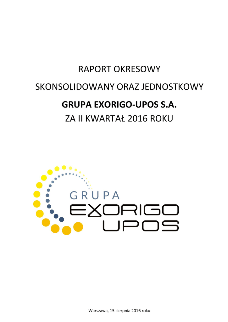 RAPORT OKRESOWY SKONSOLIDOWANY ORAZ JEDNOSTKOWY GRUPA EXORIGO-UPOS S.A. ZA II KWARTAŁ 2016 ROKU Warszawa, 15 sierpnia 2016 roku Raport okresowy za II kwartał 2016 r. Spis treści: 1. 2. 3. 4. 5. 6. 7. 8. 9. 10. 11. 12. PODSTAWOWE INFORMACJE O SPÓŁCE KWARTALNE SKRÓCONE SKONSOLIDOWANE SPRAWOZDANIE FINANSOWE KWARTALNE SKRÓCONE JEDNOSTKOWE SPRAWOZDANIE FINANSOWE INFORMACJE O ZASADACH PRZYJĘTYCH PRZY SPORZĄDZANIU RAPORTU, W TYM INFORMACJE O ZMIANACH STOSOWANYCH ZASAD (POLITYKI) RACHUNKOWOŚCI ISTOTNE DOKONANIA LUB NIEPOWODZENIA EMITENTA WRAZ Z OPISEM NAJWAŻNIEJSZYCH CZYNNIKÓW I ZDARZEŃ, W SZCZEGÓLNOŚCI O NIETYPOWYM CHARAKTERZE, MAJĄCYCH WPŁYW NA OSIĄGNIĘTE WYNIKI STANOWISKO DOTYCZĄCE MOŻLIWOŚCI ZREALIZOWANIA PROGNOZ OPIS STANU REALIZACJI DZIAŁAŃ I INWESTYCJI EMITENTA ORAZ HARMONOGRAMU ICH REALIZACJI INFORMACJE NA TEMAT AKTYWNOŚCI W ZAKRESIE INICJATYW NASTAWIONYCH NA WPROWADZENIE ROZWIĄZAŃ INNOWACYJNYCH W PRZEDSIĘBIORSTWIE W OBSZARZE ROZWOJU PROWADZONEJ DZIAŁALNOŚCI OPIS ORGANIZACJI GRUPY KAPITAŁOWEJ, ZE WSKAZANIEM JEDNOSTEK PODLEGAJĄCYCH KONSOLIDACJI WSKAZANIE PRZYCZYN NIESPORZĄDZANIA SKONSOLIDOWANYCH SPRAWOZDAŃ FINANSOWYCH INFORMACJA O STRUKTURZE AKCJONARIATU EMITENTA, ZE WSKAZANIEM AKCJONARIUSZY POSIADAJĄCYCH, NA DZIEŃ PRZEKAZANIA RAPORTU, CO NAJMNIEJ 5% GŁOSÓW NA WALNYM ZGROMADZENIU INFORMACJE DOTYCZĄCE LICZBY OSÓB ZATRUDNIONYCH PRZEZ EMITENTA, W PRZELICZENIU NA PEŁNE ETATY Warszawa, 15 sierpnia 2016 roku Strona 2 Raport okresowy za II kwartał 2016 r. 1. PODSTAWOWE INFORMACJE O SPÓŁCE Siedziba Telefon Fax E-mail Strona internetowa NIP REGON Numer KRS wraz z organem prowadzącym rejestr Zarząd Rada Nadzorcza* ul. Kolejowa 5/7, 01-217 Warszawa (+48) 22 12 20 400 (+48) 22 12 20 499 [email protected] www.exorigo-upos.pl 5252535950 146251737 Spółka jest wpisana do rejestru przedsiębiorców Krajowego Rejestru Sądowego prowadzonego przez Sąd Rejonowy dla miasta stołecznego Warszawy w Warszawie, XII Wydział Gospodarczy Krajowego Rejestru Sądowego pod numerem KRS 0000428347. Paweł Dudziuk Prezes Zarządu Andrzej Dudziuk Przewodniczący Rady Nadzorczej Piotr Karmelita Członek Rady Nadzorczej Martin Oxley Członek Rady Nadzorczej Marcin Sadlej Członek Rady Nadzorczej Andrzej Ziemiński Członek Rady Nadzorczej *Zgodnie z raportem bieżącym EBI nr 12/2016, w dniu 18 maja 2016 roku, Pan Jan Woźniak Wiceprzewodniczący Rady Nadzorczej Spółki, złożył rezygnację z funkcji członka rady nadzorczej Emitenta. Rezygnacja została złożona ze skutkiem na dzień 13 czerwca 2016 roku. Zgodnie z raportem bieżącym EBI nr 15/2016, w dniu 14 czerwca 2016 roku, Zwyczajne Walne Zgromadzenie odwołało z Rady Nadzorczej Spółki Pana Norberta Biedrzyckiego. Jednocześnie do Rady Nadzorczej Emitenta powołani zostali Pan Andrzej Ziemiński na mocy uchwały ZWZ oraz Pan Marcin Sadlej na podstawie oświadczenia ,,Uprawnionego Akcjonariusza’’ (§9 ust. 1 statutu Spółki) - Jonitaco Holdings Limited z siedzibą w Larnace (Cypr) zgodnie z §17 ust. 3 statutu Spółki. Na dzień sporządzenia niniejszego raportu, kapitał zakładowy Spółki jest opłacony w całości i wynosi 73.800.000 zł. Składa się na niego 10.000.000 akcji o wartości nominalnej 7,38 zł każda: 9.002.214 akcji zwykłych na okaziciela serii A, 997.786 akcji zwykłych na okaziciela serii B. Wszystkie akcje serii A i B są dopuszczone do obrotu (akcje serii B począwszy od 16 marca 2015 roku) na rynku NewConnect prowadzonym jako alternatywny system obrotu przez Giełdę Papierów Wartościowych S.A. w Warszawie. Warszawa, 15 sierpnia 2016 roku Strona 3 Raport okresowy za II kwartał 2016 r. 2. KWARTALNE SKRÓCONE SKONSOLIDOWANE SPRAWOZDANIE FINANSOWE 2.1. SKONSOLIDOWANY RACHUNEK ZYSKÓW I STRAT Wyszczególnienie Przychody netto ze sprzedaży produktów, towarów i materiałów Przychody netto ze sprzedaży produktów Przychody netto ze sprzedaży towarów i materiałów Koszty sprzedanych produktów, towarów i materiałów Koszt wytworzenia sprzedanych produktów 01.04.2016 - 01.04.2015 - 01.01.2016 - 01.01.2015 - 30.06.2016 30.06.2015 30.06.2016 30.06.2015 [tys. PLN] [tys. PLN] [tys. PLN] [tys. PLN] 24 723 25 826 46 557 50 155 20 000 20 179 38 571 41 560 4 723 5 647 7 986 8 595 -19 217 -19 476 -36 151 -36 468 -15 318 -14 700 -29 515 -29 242 -3 899 -4 776 -6 636 -7 226 5 506 6 350 10 406 13 687 -801 -551 -1 755 -1 393 Koszty ogólnego zarządu -3 491 -4 082 -7 353 -7 655 Zysk (strata) ze sprzedaży 1 214 1 717 1 298 4 639 556 134 702 210 15 -23 23 0 Inne przychody operacyjne 541 157 679 210 Pozostałe koszty operacyjne Strata ze zbycia niefinansowych aktywów trwałych Aktualizacja wartości aktywów niefinansowych 126 -346 80 -568 0 -42 0 -42 168 67 145 -78 Inne koszty operacyjne -42 -371 -65 -448 1 896 1 505 2 080 4 281 Przychody finansowe 80 114 165 235 Odsetki 72 108 153 220 8 6 12 15 -1 -3 -60 -187 -17 97 -36 -54 16 -100 -24 -133 Zysk (strata) z działalności gospodarczej 1 975 1 616 2 185 4 329 Zysk (strata) brutto 1 975 1 616 2 185 4 329 Podatek dochodowy -403 -420 -477 -967 1 572 1 196 1 708 3 362 Wartość sprzedanych towarów i materiałów Zysk (strata) brutto ze sprzedaży Koszty sprzedaży Pozostałe przychody operacyjne Zysk ze zbycia niefinansowych aktywów trwałych Zysk (strata) z działalności operacyjnej Inne Koszty finansowe Odsetki Inne Zysk (strata) netto Warszawa, 15 sierpnia 2016 roku Strona 4 Raport okresowy za II kwartał 2016 r. 2.2. SKONSOLIDOWANY BILANS Wyszczególnienie 30.06.2016 30.06.2015 [tys. PLN] [tys. PLN] Aktywa trwałe 11 984 12 864 311 1 145 5 668 5 982 Należności długoterminowe 0 217 Inwestycje długoterminowe 4 334 4 428 Długoterminowe rozliczenia międzyokresowe 1 671 1 092 43 348 42 832 4 574 9 127 Należności krótkoterminowe 17 937 28 945 Inwestycje krótkoterminowe 19 703 3 577 1 134 1 183 AKTYWA RAZEM 55 332 55 696 Kapitał (Fundusz) własny 31 378 35 166 Kapitał (fundusz) podstawowy 73 800 73 800 Kapitał (fundusz) zapasowy 16 