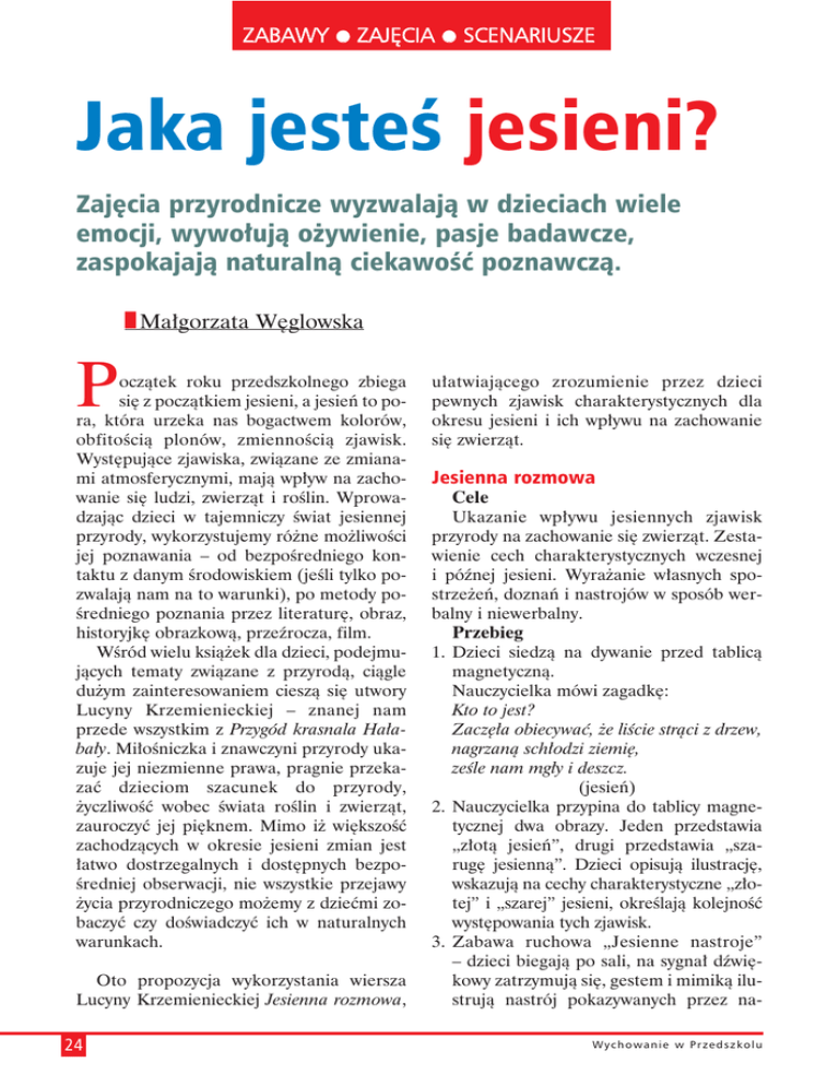 ZABAWY l ZAJĘCIA l SCENARIUSZE Jaka jesteś jesieni? Zajęcia przyrodnicze wyzwalają w dzieciach wiele emocji, wywołują ożywienie, pasje badawcze, zaspokajają naturalną ciekawość poznawczą. n Małgorzata Węglowska P oczątek roku przedszkolnego zbiega się z początkiem jesieni, a jesień to pora, która urzeka nas bogactwem kolorów, obfitością plonów, zmiennością zjawisk. Występujące zjawiska, związane ze zmianami atmosferycznymi, mają wpływ na zachowanie się ludzi, zwierząt i roślin. Wprowadzając dzieci w tajemniczy świat jesiennej przyrody, wykorzystujemy różne możliwości jej poznawania – od bezpośredniego kontaktu z danym środowiskiem (jeśli tylko pozwalają nam na to warunki), po metody pośredniego poznania przez literaturę, obraz, historyjkę obrazkową, przeźrocza, film. Wśród wielu książek dla dzieci, podejmujących tematy związane z przyrodą, ciągle dużym zainteresowaniem cieszą się utwory Lucyny Krzemienieckiej – znanej nam przede wszystkim z Przygód krasnala Hałabały. Miłośniczka i znawczyni przyrody ukazuje jej niezmienne prawa, pragnie przekazać dzieciom szacunek do przyrody, życzliwość wobec świata roślin i zwierząt, zauroczyć jej pięknem. Mimo iż większość zachodzących w okresie jesieni zmian jest łatwo dostrzegalnych i dostępnych bezpośredniej obserwacji, nie wszystkie przejawy życia przyrodniczego możemy z dziećmi zobaczyć czy doświadczyć ich w naturalnych warunkach. Oto propozycja wykorzystania wiersza Lucyny Krzemienieckiej Jesienna rozmowa, 24 ułatwiającego zrozumienie przez dzieci pewnych zjawisk charakterystycznych dla okresu jesieni i ich wpływu na zachowanie się zwierząt. Jesienna rozmowa Cele Ukazanie wpływu jesiennych zjawisk przyrody na zachowanie się zwierząt. Zestawienie cech charakterystycznych wczesnej i późnej jesieni. Wyrażanie własnych spostrzeżeń, doznań i nastrojów w sposób werbalny i niewerbalny. Przebieg 1. Dzieci siedzą na dywanie przed tablicą magnetyczną. Nauczycielka mówi zagadkę: Kto to jest? Zaczęła obiecywać, że liście strąci z drzew, nagrzaną schłodzi ziemię, ześle nam mgły i deszcz. (jesień) 2. Nauczycielka przypina do tablicy magnetycznej dwa obrazy. Jeden przedstawia „złotą jesień”, drugi przedstawia „szarugę jesienną”. Dzieci opisują ilustrację, wskazują na cechy charakterystyczne „złotej” i „szarej” jesieni, określają kolejność występowania tych zjawisk. 3. Zabawa ruchowa „Jesienne nastroje” – dzieci biegają po sali, na sygnał dźwiękowy zatrzymują się, gestem i mimiką ilustrują nastrój pokazywanych przez naWychowanie w Przedszkolu uczycielkę obrazków: „słońce i kolorowe liście na trawie” lub „ciemna chmura i deszcz” (przykładowe zachowania dzieci: uśmiech na twarzy, zadowolenie, powolny spacer, kulenie się z zimna, osłanianie się, ucieczka przed deszczem). 4. Dzieci wracają na dywan i dzielą się swoimi odczuciami dotyczącymi tych dwóch różnych dni jesiennych. Uzasadniają wybór ulubionej pory. 5. Nauczycielka wprowadza w treść wiersza Jesienna rozmowa krótkim przypomnieniem, że wraz z nadejściem jesieni zwierzęta również przygotowują się do zbliżających się chłodów i nadchodzącej zimy. Następnie recytuje wiersz, trzymając w ręku pacynkę – panią Jesień i przypinając na tablicy magnetycznej sylwety kolejnych zwierząt – bohaterów wiersza. Słowami tekstu prowadzi z nimi rozmowę. Jesienna rozmowa Wiewióreczce jesień szepce: – Bądź co bądź, do zapasów w spiżareczce czas się wziąć. Dojrzały orzeszki, nazbieraj ich w mieszki. Garść buczyny zdrowej w mrocznej dziupli schowaj. Napotkała jesień jeża: – Mądrym bądź! Kiedyż to się jeż zamierza pracy jąć? Suche listki leżą na jesiennej dróżce, nazbieraj ich, jeżu, sobie na poduszkę.(…) Prezentacja wiersza może się również odbywać w formie teatrzyku kukiełkowego. 6. Po wysłuchaniu wiersza nauczycielka kieruje rozmową na temat jego treści: – Jakie zwierzęta wystąpiły w wierszu? 9/2006 – Jakich rad udzielała im pani Jesień? – Czy zwierzęta też muszą się zabezpieczyć przed zimą? 7. Zabawa ruchowa utrwalająca zdobyte wiadomości – nauczycielka rozkłada na sali sześć dużych obręczy. W obręczach znajdują się: 1. zeschłe liście – mieszkanie na zimę dla jeża, 2. orzechy – zapasy dla wiewiórki, 3. kamień pokryty mułem, błotem – schronienie dla żaby, 4. słoik miodu – przysmak niedźwiedzia, 5. żołędzie – pokarm borsuka, 6. karmnik – zimowa „stołówka” dla wróbla. Dzieci spacerują po sali, na sygnał dźwiękowy przyglądają się sylwecie zwierzęcia pokazanej przez nauczycielkę (wykorzystujemy sylwety z tablicy magnetycznej), nazywają to zwierzę i biegną do odpowiedniej obręczy. 8. Na zakończenie dzieci jeszcze raz wysłuchają recytacji wiersza. Podejmują wspólną decyzję o założeniu w zimie „ptasiej stołówki” w ogrodzie przedszkolnym. Dużą uwagę dzieci przyciąga również przyroda nieożywiona: „babie lato” – oznaka wczesnej jesieni, zjawisko, na które warto zwrócić uwagę przedszkolaków. Możemy tu również wykorzystać wiersz Lucyny Krzemienieckiej Płynie sobie niteczka. 25 Oto propozycja zapoznania dzieci ze zjawiskiem „babiego lata” – zajęcia te mogą się odbywać w ciągu dwóch kolejnych dni. Płynie sobie niteczka Cele Poznanie zjawiska „babiego lata” i jego znaczenia w przyrodzie. Rozwijanie dziecięcej wyobraźni oraz różnych form ekspresji: słownej, ruchowej, plastycznej. Przebieg 1. Spacer w pogodny, słoneczny, jesienny dzień. Przed wyjściem nauczycielka wyjaśnia dzieciom cel spaceru – poszukiwanie na trawie, na krzewach, między drzewami rozciągniętych, fruwających na wietrze srebrzystych nitek. Po powrocie ze spaceru dzieci dzielą się spostrzeżeniami. 2. Następnie nauczycielka recytuje wiersz i wyjaśnia dzieciom, skąd s