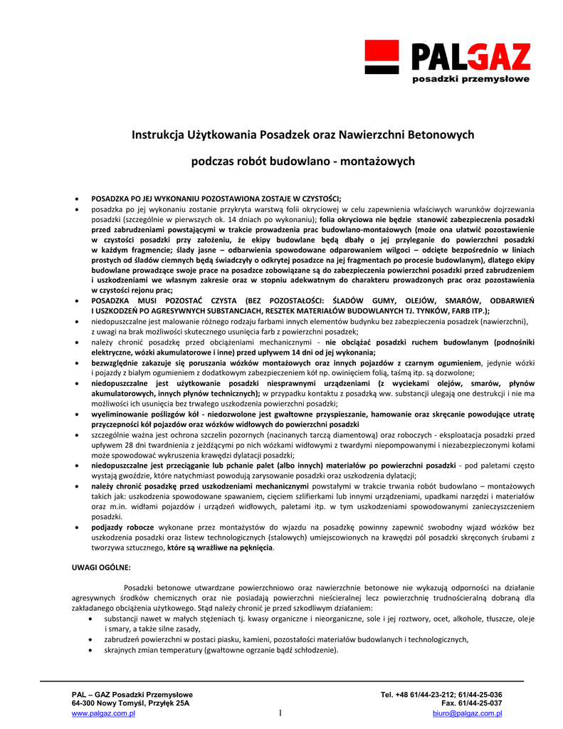 Instrukcja Użytkowania Posadzek oraz Nawierzchni Betonowych podczas robót budowlano - montażowych POSADZKA PO JEJ WYKONANIU POZOSTAWIONA ZOSTAJE W CZYSTOŚCI; posadzka po jej wykonaniu zostanie przykryta warstwą folii okryciowej w celu zapewnienia właściwych warunków dojrzewania posadzki (szczególnie w pierwszych ok. 14 dniach po wykonaniu); folia okryciowa nie będzie stanowić zabezpieczenia posadzki przed zabrudzeniami powstającymi w trakcie prowadzenia prac budowlano-montażowych (może ona ułatwić pozostawienie w czystości posadzki przy założeniu, że ekipy budowlane będą dbały o jej przyleganie do powierzchni posadzki w każdym fragmencie; ślady jasne – odbarwienia spowodowane odparowaniem wilgoci – odcięte bezpośrednio w liniach prostych od śladów ciemnych będą świadczyły o odkrytej posadzce na jej fragmentach po procesie budowlanym), dlatego ekipy budowlane prowadzące swoje prace na posadzce zobowiązane są do zabezpieczenia powierzchni posadzki przed zabrudzeniem i uszkodzeniami we własnym zakresie oraz w stopniu adekwatnym do charakteru prowadzonych prac oraz pozostawienia w czystości rejonu prac; POSADZKA MUSI POZOSTAĆ CZYSTA (BEZ POZOSTAŁOŚCI: ŚLADÓW GUMY, OLEJÓW, SMARÓW, ODBARWIEŃ I USZKODZEŃ PO AGRESYWNYCH SUBSTANCJACH, RESZTEK MATERIAŁÓW BUDOWLANYCH TJ. TYNKÓW, FARB ITP.); niedopuszczalne jest malowanie różnego rodzaju farbami innych elementów budynku bez zabezpieczenia posadzek (nawierzchni), z uwagi na brak możliwości skutecznego usunięcia farb z powierzchni posadzek; należy chronić posadzkę przed obciążeniami mechanicznymi - nie obciążać posadzki ruchem budowlanym (podnośniki elektryczne, wózki akumulatorowe i inne) przed upływem 14 dni od jej wykonania; bezwzględnie zakazuje się poruszania wózków montażowych oraz innych pojazdów z czarnym ogumieniem, jedynie wózki i pojazdy z białym ogumieniem z dodatkowym zabezpieczeniem kół np. owinięciem folią, taśmą itp. są dozwolone; niedopuszczalne jest użytkowanie posadzki niesprawnymi urządzeniami (z wyciekami olejów, smarów, płynów akumulatorowych, innych płynów technicznych); w przypadku kontaktu z posadzką ww. substancji ulegają one destrukcji i nie ma możliwości ich usunięcia bez trwałego uszkodzenia powierzchni posadzki; wyeliminowanie poślizgów kół - niedozwolone jest gwałtowne przyspieszanie, hamowanie oraz skręcanie powodujące utratę przyczepności kół pojazdów oraz wózków widłowych do powierzchni posadzki szczególnie ważna jest ochrona szczelin pozornych (nacinanych tarczą diamentową) oraz roboczych - eksploatacja posadzki przed upływem 28 dni twardnienia z jeżdżącymi po nich wózkami widłowymi z twardymi niepompowanymi i niezabezpieczonymi kołami może spowodować wykruszenia krawędzi dylatacji posadzki; niedopuszczalne jest przeciąganie lub pchanie palet (albo innych) materiałów po powierzchni posadzki - pod paletami często wystają gwoździe, które natychmiast powodują zarysowanie posadzki oraz uszkodzenia dylatacji; należy chronić posadzkę przed uszkodzeniami mechanicznymi powstałymi w trakcie trwania robót budowlano – montażowych takich jak: uszkodzenia spowodowane spawaniem, cięciem szlifierkami lub innymi urządzeniami, upadkami narzędzi i materiałów oraz m.in. widłami pojazdów i urządzeń widłowych, paletami itp. w tym uszkodzeniami spowodowanymi zanieczyszczeniem posadzki. podjazdy robocze wykonane przez montażystów do wjazdu na posadzkę powinny zapewnić swobodny wjazd wózków bez uszkodzenia posadzki oraz listew technologicznych (stalowych) umiejscowionych na krawędzi pól posadzki skręconych śrubami z tworzywa sztucznego, które są wrażliwe na pęknięcia. UWAGI OGÓLNE: Posadzki betonowe utwardzane powierzchniowo oraz nawierzchnie betonowe nie wykazują odporności na działanie agresywnych środków chemicznych oraz nie posiadają powierzchni nieścieralnej lecz powierzchnię trudnościeralną dobraną dla zakładanego obciążenia użytkowego. Stąd należy chronić je przed szkodliwym działaniem: substancji nawet w małych stężeniach tj. kwasy organiczne i nieorganiczne, sole i jej roztwory, ocet, alkohole, tłuszcze, oleje i smary, a także silne zasady, zabrudzeń powierzchni w postaci piasku, kamieni, pozostałości materiałów budowlanych i technologicznych, skrajnych zmian temperatury (gwałtowne ogrzanie bądź schłodzenie). PAL – GAZ Posadzki Przemysłowe 64-300 Nowy Tomyśl, Przyłęk 25A www.palgaz.com.pl 1 Tel. +48 61/44-23-212; 61/44-25-036 Fax. 61/44-25-037 [email protected] Posadzki i nawierzchnie przemysłowe betonowe, jak wszystkie produkty na bazie cementu, tolerują jedynie oddziaływanie krótkotrwałe mediów zasadowych w niewielkich stężeniach o 7 ≤ pH ≤ 9. Ze względu też na możliwość wypłukania spoiwa cementowego, zabrania się bezpośredniego oddziaływania kapiącej lub ciągle spływającej wody na posadzkę (nawierzchnię). Należy zwracać uwagę na usuwanie piasku, szkła oraz innych twardych materiałów, które pod kółkami wózków montażowych (także innych pojazdów) oraz podczas ruchu pieszego (najczęściej przy wejściach) powodują nadmierne ścieranie powierzchni i uszkodzenia mechaniczne (działanie podobne jak papier ścierny). Dlatego należy ZADBAC O WYPOSAŻENIE WEJŚĆ NA POSADZKĘ (DRZWI, BRAMY WEJŚCIOWE ITP.) W WYCIERACZKI oraz utrzymywać posadzkę w odpowiedniej czystości, tzn. usuwać piasek, brud, szkło oraz inne zabrudzenia, które mechanicznie niszczą powierzchnię. Środki chemiczne oraz inne roztwory o agresywnym oddziaływaniu należy bezwzględnie usuwać z powierzchni posadzki (nawierzchni) bezpośrednio po zdarzeniu. Najszybciej jak to możliwe powierzchnię zmyć czystą ciepłą wodą i w razie konieczności zneutralizować pozostałości substancji. Pomimo usunięcia ww. substancji mogą pojawić się plamy, odbarwienia bądź inne uszkodzenia na powierzchni posadzki (nawier