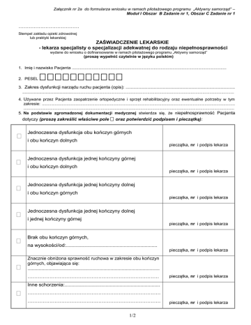 Załącznik nr 2a do formularza wniosku w ramach pilotażowego programu „Aktywny samorząd” – Moduł I Obszar B Zadanie nr 1, Obszar C Zadanie nr 1 ……………………………… Stempel zakładu opieki zdrowotnej lub praktyki lekarskiej ZAŚWIADCZENIE LEKARSKIE - lekarza specjalisty o specjalizacji adekwatnej do rodzaju niepełnosprawności wydane do wniosku o dofinansowanie w ramach pilotażowego programu „Aktywny samorząd” (proszę wypełnić czytelnie w języku polskim) 1. Imię i nazwisko Pacjenta .................................................................................................................................... 2. PESEL 3. Zakres dysfunkcji narządu ruchu pacjenta (opis): ..................................................................................... ................................................................................................................................................................................. 4. Używane przez Pacjenta zaopatrzenie ortopedyczne i sprzęt rehabilitacyjny oraz ewentualne potrzeby w tym zakresie: ..................................................................................................................................................................... .................................................................................................................................................................................... 5. Na podstawie zgromadzonej dokumentacji medycznej stwierdza się, że niepełnosprawność Pacjenta dotyczy (proszę zakreślić właściwe pole oraz potwierdzić podpisem i pieczątką): Jednoczesna dysfunkcja obu kończyn górnych i obu kończyn dolnych pieczątka, nr i podpis lekarza Jednoczesna dysfunkcja jednej kończyny górnej i obu kończyn dolnych pieczątka, nr i podpis lekarza Jednoczesna dysfunkcja jednej kończyny dolnej i obu kończyn górnych pieczątka, nr i podpis lekarza Jednoczesna dysfunkcja jednej kończyny dolnej i jednej kończyny górnej pieczątka, nr i podpis lekarza Brak obu kończyn górnych, na wysokości/od:................................................................. pieczątka, nr i podpis lekarza Znacznie obniżona sprawność ruchowa w zakresie obu kończyn górnych, objawiająca się: .............................................................................................. …………………………………………………………………… pieczątka, nr i podpis lekarza Inne schorzenia:.................................................................... ……………………………………………………………………. ……………………………………………………………………. 1/2 pieczątka, nr i podpis lekarza 6. Ponadto (pole obowiązkowe w przypadku Pacjenta ubiegającego się o dofinansowanie w ramach obszaru C programu) - na podstawie zgromadzonej dokumentacji medycznej stwierdza się, że: proszę zaznaczyć właściwe pola 1. Pacjent może samodzielnie poruszać się na wózku inwalidzkim o napędzie ręcznym: tak nie 2. Korzystanie z wózka o napędzie elektrycznym jest niewskazane, gdyż może spowodować wstrzymanie lub pogorszenie procesu rehabilitacji lub wpłynie niekorzystnie na sprawność kończyn górnych: tak nie 3. Przeciwwskazania do korzystania z wózka o napędzie elektrycznym (np. utraty przytomności, epilepsja): .................................................................. ............................................................................................................................ ............................................................................. brak przeciwwskazań pieczątka, nr i podpis lekarza Dotyczy wyłącznie Wnioskodawców ubiegających się o zwiększenie kwoty dofinansowania na zakup wózka inwalidzkiego o napędzie elektrycznym Pacjent z uwagi na ograniczenia funkcjonalne, stan i zakres dysfunkcji narządu ruchu powodującej niepełnosprawność wymaga zakupu wózka inwalidzkiego o napędzie elektrycznym z ponadstandardowym wyposażeniem, w tym: (proszę zakreślić właściwe pola ) niestandardowe sterowniki umożliwiające sterowanie wózkiem za pomocą jedynie władnych części ciała jak np.: ręki, palca, brody, stopy, warg lub wdechu i wydechu powietrza itp. urządzenia umożliwiające prowadzenie wózka także przez osobę towarzyszącą (hamulec, sterownik itp.) niestandardowe siedzisko (np. z windą podnoszącą, rehabilitacyjne, zapewniające maksymalną stabilizację, przeciwodleżynowe, itp.) specjalne, regulowane (w tym elektrycznie i w różnych płaszczyznach): podnóżki, podłokietniki lub oparcia nadgarstków kliny zapobiegające zsuwaniu się Pacjenta z wózka lub podpórki boczne, peloty piersiowe zagłówek stabilizujący głowę i szyję (w kształcie litery U) specjalne pasy bezpieczeństwa (np. dwupunktowe zapinane na biodrach, czteropunktowe) indywidualne dopasowanie do sylwetki Pacjenta (np. w przypadku niestandardowego wzrostu czy wagi Pacjenta) inne elementy i urządzenia (np. umożliwiające podłączenia joysticka wózka do komputera i posługiwanie się nim jak myszką), jakie: ……………………………………………………………………………………………………………………………. ……………………………………………………………………………………………………………………………. miejscowość: …………………………… dnia ………………… ............................................... pieczątka, nr i podpis lekarza 2/2