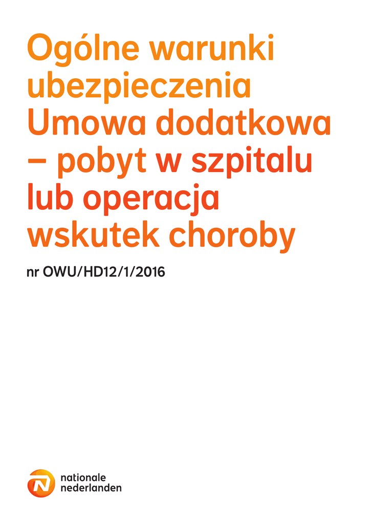 Ogólne warunki ubezpieczenia Umowa dodatkowa – pobyt w szpitalu lub operacja wskutek choroby nr OWU/HD12/1/2016 Spis treści Ogólne warunki ubezpieczenia Umowa dodatkowa – pobyt w szpitalu lub operacja wskutek choroby nr OWU/HD12/1/2016........................................................................4 Art. 1 Co oznaczają używane pojęcia?...................................4 Art. 2 Kogo ubezpieczamy i co obejmuje ubezpieczenie?.....................................................................5 Art. 3 Jak długo trwa Umowa dodatkowa?............................5 Art. 4 Czy możesz kontynuować ubezpieczenie?...............5 Art. 5 Jaką kwotę wypłacimy w przypadku pobytu w szpitalu?..............................................................................5 Art. 6 Jaką kwotę wypłacimy w przypadku operacji?.......5 Art. 7 Jak będą wypłacane Pieniądze? Co jest potrzebne?...............................................................6 Art. 8 Jak podwyższyć lub obniżyć Sumę ubezpieczenia?........................................................6 Art. 9 Jak ustalimy wysokość Składki? Jak będzie opłacana?.........................................................6 Art. 10 W jakich sytuacjach nie wypłacimy Pieniędzy?......6 Art. 11 Zastosowanie Warunków.................................................6 Art. 12 Wejście w życie Warunków Umowy dodatkowej....6 Załącznik – procedury medyczne wskutek choroby nr 1/2015................................................................................................... 7 2| Informacje dotyczące: Ogólne warunki ubezpieczenia Umowa dodatkowa – pobyt w szpitalu lub operacja wskutek choroby nr OWU/HD12/1/2016 (OWU) Informacje zawarte w OWU Nr artykułu OWU 1. Przesłanki wypłaty odszkodowania i innych świadczeń lub wartości wykupu Ubezpieczenia Art. 1, Art. 2, Art. 5, Art. 6 OWU 2. Ograniczenia oraz wyłączenia odpowiedzialności zakładu ubezpieczeń uprawniające do odmowy wypłaty odszkodowania i innych świadczeń lub ich obniżenia Art. 3, Art. 5, Art. 6, Art. 10 OWU 3. Koszty oraz inne obciążenia potrącane ze składek ubezpieczeniowych, z aktywów ubezpieczeniowych funduszy kapitałowych lub poprzez umorzenie jednostek uczestnictwa ubezpieczeniowych funduszy kapitałowych. Nie dotyczy 4. Wartość wykupu ubezpieczenia w poszczególnych okresach trwania ochrony ubezpieczeniowej oraz okres, w którym roszczenie o wypłatę wartości wykupu nie przysługuje. Nie dotyczy |3 Ogólne warunki ubezpieczenia Umowa dodatkowa – pobyt w szpitalu lub operacja wskutek choroby nr OWU/HD12/1/2016 Umowa dodatkowa – pobyt w szpitalu lub operacja wskutek choroby (dalej: Umowa dodatkowa) jest zawierana na podstawie Warunków oraz Ogólnych warunków ubezpieczenia Umowy dodatkowej – pobyt w szpitalu lub operacja wskutek choroby (dalej: Warunki Umowy dodatkowej). Ty – jako Ubezpieczony – jesteś uprawniony do Pieniędzy z tytułu tej umowy, i dlatego w treści dokumentu zwracamy się bezpośrednio do Ciebie. Art. 1 Co oznaczają używane pojęcia? 1. „Suma ubezpieczenia” – kwota wybrana przez Właściciela polisy, na podstawie której obliczymy, ile Pieniędzy Ci wypłacimy z Umowy dodatkowej. 2. „Świadczenie” albo „Pieniądze” – kwota, jaką wypłacimy w przypadku Twojego Pobytu w szpitalu, Pobytu w szpitalu o długotrwałym charakterze lub Operacji. 3. „Pobyt w szpitalu” – Twój stały i nieprzerwany pobyt w Szpitalu, służący zachowaniu, przywróceniu lub poprawie stanu Twojego zdrowia, którego przyczyną była Choroba. W rozumieniu Warunków Umowy dodatkowej za Pobyt w szpitalu nie uważa się hospitalizacji, której celem była rehabilitacja lub rekonwalescencja. 4.„Pobyt w szpitalu o długotrwałym charakterze” – Pobyt w szpitalu trwający nieprzerwanie co najmniej 14 dni. Uzgodniona z Lekarzem czasowa nieobecność w Szpitalu przerywa bieg tego 14-dniowego terminu. 5. „Dzień pobytu w szpitalu” – każdy ukończony dzień kalendarzowy pobytu w Szpitalu. Za pierwszy dzień pobytu w Szpitalu uważa się okres od przyjęcia do Szpitala do końca dnia (do godz. 24.00). 6. „Szpital” – publiczny lub niepubliczny zamknięty zakład opieki zdrowotnej, którego zadaniem jest całodobowa opieka nad chorymi i ich leczenie, dysponujący odpowiednim zapleczem diagnostycznym i leczniczym, zatrudniający personel medyczny, tj. wykwalifikowaną obsługę pielęgniarską i przynajmniej jednego Lekarza w trybie ciągłym, oraz gromadzący pełną dokumentację medyczną każdego pacjenta. W rozumieniu Warunków Umowy dodatkowej Szpitalem nie jest dom opieki, ośrodek dla psychicznie chorych, hospicjum, placówka, której zadaniem jest leczenie alkoholizmu i innych uzależnień, szpital rehabilitacyjny, szpitalny oddział rehabilitacyjny, ośrodek rekonwalescencyjny, rehabilitacyjny, sanatoryjny, szpital sanatoryjny, ośrodek wypoczynkowy, zakład lecznictwa uzdrowiskowego. 7. „Operacja” – zabieg wymagający nacięcia skóry lub innych tkanek, obejmujący jedną lub więcej procedur medycznych wymienionych w Załączniku – Procedury medyczne wskutek choroby nr 1/2015, przeprowadzony w znieczuleniu ogólnym lub miejscowym w Szpitalu przez Lekarza uprawnionego do jego wykonania, w obecności anestezjologa. Z medycznego punktu widzenia Operacja musi być konieczna w celu wyleczenia lub zmniejszenia objawów Choroby. W rozumieniu Warunków Umowy dodatkowej Operacją nie jest operacja przeprowadzona jedynie w celach diagnostycznych za wyjątkiem zabiegu obejmującego jedną lub więcej procedur medycznych wymienionych w Załączniku – Procedury medyczne wskutek choroby nr 1/2015. 8. „Choroba” – zdiagnozowana przez Lekarza reakcja organizmu na działanie czynnika chorobotwórczego, wewnętrznego lub zewnętrznego, prowadząca do zaburzeń czynnościowych, zmian organicznych w tkankach, narządach, układach lub całym ustroju. W rozumieniu Warunków Umowy dodatkowej z