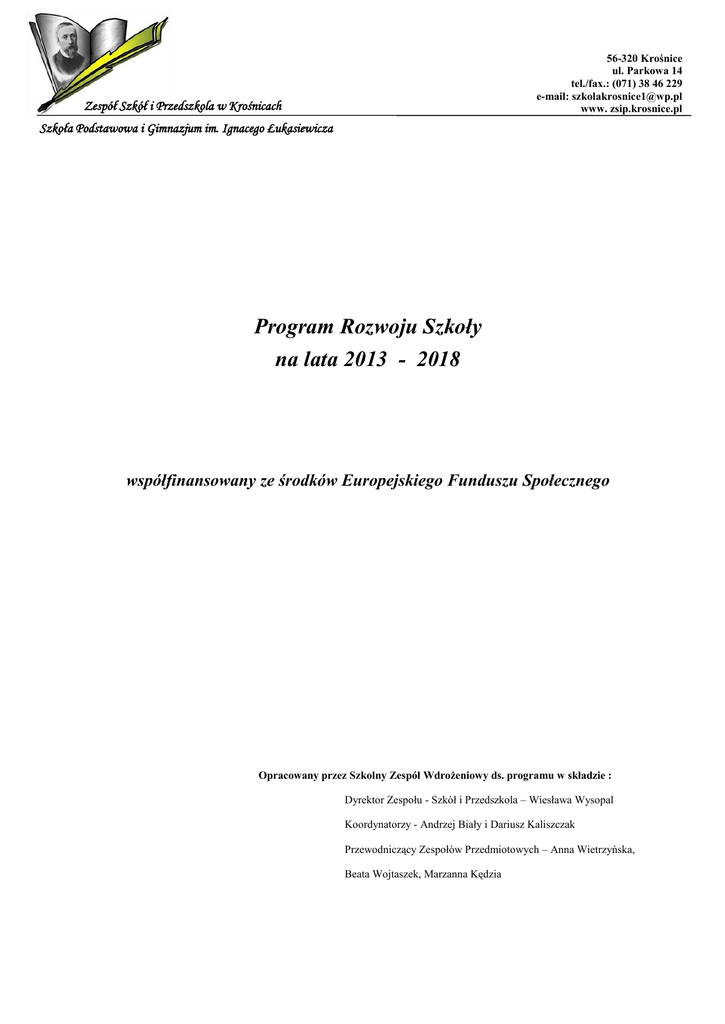 56-320 Krośnice ul. Parkowa 14 tel./fax.: (071) 38 46 229 e-mail: [email protected] www. zsip.krosnice.pl Zespół Szkół i Przedszkola w Krośnicach Szkoła Podstawowa i Gimnazjum im. Ignacego Łukasiewicza www.zsip.krosnice.pl Program Rozwoju Szkoły na lata 2013 - 2018 współfinansowany ze środków Europejskiego Funduszu Społecznego Opracowany przez Szkolny Zespół Wdrożeniowy ds. programu w składzie : Dyrektor Zespołu - Szkół i Przedszkola – Wiesława Wysopal Koordynatorzy - Andrzej Biały i Dariusz Kaliszczak Przewodniczący Zespołów Przedmiotowych – Anna Wietrzyńska, Beata Wojtaszek, Marzanna Kędzia Spis treści: Misja szkoły……………………………………………………………………………….str. 3 Rozdział I POSTANOWIENIA OGÓLNE................................................................................. str. 3 Rozdział II CELE DZIAŁAŃ W PROGRAMIE........................................................................ str. 4 OPIS I DIAGNOZA (OCENA) STANU WYJŚCIOWEGO.................................... str. 5 Rozdział III ANALIZA I WIZJA ROZWOJU PLACÓWKI..................................................... str. 9 Rozdział IV PLAN DZIAŁANIA NA LATA 2009 – 2013 I JEGO REALIZACJA...................... str. 19 Rozdział V MONITOROWANIE REALIZACJI PLANU......................................................... str. 23 Rozdział VI PRZEGLĄD (OCENA) SYTUACJI W TRAKCIE REALIZACJI PROGRAMU ........ str. 25 Misją Zespołu Szkół i Przedszkola w Krośnicach 2 jest przygotowanie powierzonych nam dzieci i młodzieży do dalszej edukacji, aktywnego i twórczego uczestnictwa w życiu społecznym, wspieranie jej aktywnego rozwoju poprzez efektywne kształcenie i wychowanie w ścisłej współpracy z rodziną. Szkoła promuje humanistyczny system wartości, tolerancyjne podejście do drugiego człowieka respektując wartości chrześcijańskie. Istniejemy po to, aby w atmosferze odpowiedzialności, uczciwości, kreatywności i dążenia do sukcesu towarzyszyć uczniom na drodze do poznania i spełnienia siebie. Rozdział I POSTANOWIENIA OGÓLNE Dokonujące się w szybkim tempie zmiany społeczne i gospodarcze inspirują Szkoły również naszą - do modyfikowania dotychczasowego procesu nauczania, do postawienia pytania: Jak w nowych warunkach prowadzić i rozwijać kształcenie ? Wyzwaniem dla całej edukacji (w tym dla naszego Zespołu Szkół i Przedszkola) staje się globalna ekonomia, zmiany technologiczne, umiędzynarodowienie, rozwój technik masowej komunikacji, konkurencja na rynku pracy. W takiej sytuacji strategię rozwoju szkoły musimy potraktować jako element większego systemu programowania uwzględniającego różne poziomy: szkolny, lokalny, regionalny, krajowy. Warunkiem efektywnej realizacji naszego programu rozwoju jest zharmonizowanie go ze wszystkimi w/w obszarami. Dlatego bazą dla sformułowania zasadniczych celów i zadań naszej szkolnej strategii są priorytety zawarte w dokumentach strategicznych. Dokumenty programowe określające ogólną wizję rozwoju oświaty, formułujące cele dla tego sektora, a tym samym dla naszej szkoły, to : Strategia Lizbońska Odnowiona Strategia Lizbońska Wspólnotowy Program Lizboński Strategia Rozwoju Kraju 2007 – 2013 Strategia Rozwoju Województwa Dolnośląskiego do 2020 roku. ZALECENIE PARLAMENTU EUROPEJSKIEGO I RADY z dnia 18 grudnia 2006 r. w sprawie kompetencji kluczowych w procesie uczenia się przez całe życie (2006/962/WE) Rozporządzenie Ministra Edukacji Narodowej z dnia 23 12 2008r w sprawie podstawy programowej wychowania przedszkolnego oraz kształcenia ogólnego w poszczególnych typach szkół, DZ. U. z 2009r. Nr 4, poz.17. 3 Rozdział II WIZJA I CELE DZIAŁAŃ W PROGRAMIE Istotnym krokiem na drodze przygotowania programu rozwoju naszego Zespołu Szkół i Przedszkola w Krośnicach jest wykreowanie – w nawiązaniu do ogólnej koncepcji rozwoju oświaty - wizji naszej placówki. Kreowanie wizji szkoły oraz programowanie jej rozwoju jest szansą na : lepsze wykorzystanie posiadanych zasobów (ludzkich i materialnych) reagowanie na wyzwania środowiska lokalnego, a także współczesnego świata, poszerzanie oferty edukacyjnej szkoły, która stanowi o jej konkurencyjności włączanie całej społeczności szkolnej w programowanie rozwoju szkoły integrację środowiska na rzecz osiągania wysokiej jakości pracy zmniejszanie różnic i podnoszenie poziomu nauczania wspieranie indywidualnych zainteresowań i zdolności każdego ucznia ze szczególnym uwzględnieniem umiejętności kluczowych Przewidywane efekty: Dążenie do uzyskiwania wysokich wyników ze sprawdzianów i egzaminów zewnętrznych oraz konkursów przedmiotowych i międzyprzedmiotowych. Zaspokajanie potrzeb i oczekiwań uczniów, rodziców i nauczycieli. Sformułowanie wizji oraz przygotowanie Strategii rozwoju winno być poprzedzone dokonaniem analizy sytuacji wyjściowej. Ocena sytuacji wyjściowej Zespołu Szkół i Przedszkola w Krośnicach została zrealizowana poprzez : zgromadzenie istniejących informacji statystycznych przegląd zapisów w istniejących dokumentach o charakterze strategicznym zgromadzenie opinii przedstawicieli kluczowych osób i instytucji. przeprowadzone ankiety i analizy np. Analiza SWOT 4 OPIS I DIAGNOZA (OCENA) STANU WYJŚCIOWEGO A) ŚRODOWISKO Zespół Szkół i Przedszkola funkcjonuje w gminie Krośnice, w powiecie milickim, północno – wschodniej części województwa dolnośląskiego. Gminę (obejmującą powierzchnię 17 873 ha) tworzy 25 wsi, w tym 22 sołectw. Gminę zamieszkuje 8024 mieszkańców. Jest to ludność w większości napływowa przesiedleńcy z dawnych Kresów Wschodnich i Wielkopolski. Większość dorosłych mieszkańców posiada podstawowe lub zasadnicze wykształcenie. Nieliczna grupa zdobyła wykształcenie średnie i wyższe. Specyfiką Gminy jest jej lokalizacja na terenie Parku Krajobrazowego „Dolina Baryczy”. Większa c