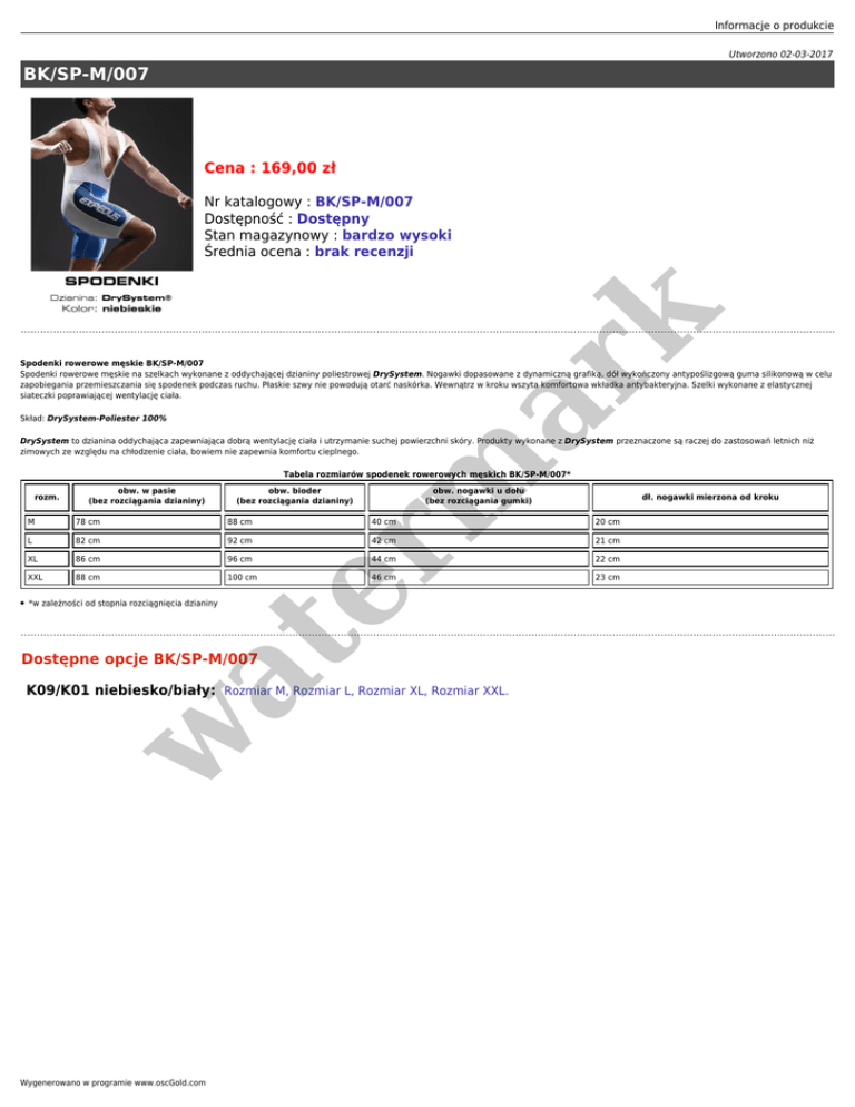 Informacje o produkcie Utworzono 02-03-2017 BK/SP-M/007 Cena : 169,00 zł er m ar k Nr katalogowy : BK/SP-M/007 Dostępność : Dostępny Stan magazynowy : bardzo wysoki Średnia ocena : brak recenzji Spodenki rowerowe męskie BK/SP-M/007 Spodenki rowerowe męskie na szelkach wykonane z oddychającej dzianiny poliestrowej DrySystem. Nogawki dopasowane z dynamiczną grafiką, dół wykończony antypoślizgową guma silikonową w celu zapobiegania przemieszczania się spodenek podczas ruchu. Płaskie szwy nie powodują otarć naskórka. Wewnątrz w kroku wszyta komfortowa wkładka antybakteryjna. Szelki wykonane z elastycznej siateczki poprawiającej wentylację ciała. Skład: DrySystem-Poliester 100% DrySystem to dzianina oddychająca zapewniająca dobrą wentylację ciała i utrzymanie suchej powierzchni skóry. Produkty wykonane z DrySystem przeznaczone są raczej do zastosowań letnich niż zimowych ze względu na chłodzenie ciała, bowiem nie zapewnia komfortu cieplnego. Tabela rozmiarów spodenek rowerowych męskich BK/SP-M/007* rozm. obw. bioder (bez rozciągania dzianiny) obw. nogawki u dołu (bez rozciągania gumki) dł. nogawki mierzona od kroku M 78 cm 88 cm 40 cm 20 cm L 82 cm 92 cm 42 cm 21 cm XL 86 cm 96 cm 44 cm 22 cm XXL 88 cm 100 cm 46 cm 23 cm *w zależności od stopnia rozciągnięcia dzianiny at ● obw. w pasie (bez rozciągania dzianiny) Dostępne opcje BK/SP-M/007 w K09/K01 niebiesko/biały: Rozmiar M, Rozmiar L, Rozmiar XL, Rozmiar XXL. Wygenerowano w programie www.oscGold.com