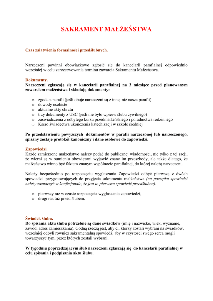 SAKRAMENT MAŁŻEŃSTWA Czas załatwienia formalności przedślubnych. Narzeczeni powinni obowiązkowo zgłosić się do kancelarii parafialnej odpowiednio wcześniej w celu zarezerwowania terminu zawarcia Sakramentu Małżeństwa. Dokumenty. Narzeczeni zgłaszają się w kancelarii parafialnej na 3 miesiące przed planowanym zawarciem małżeństwa i składają dokumenty: • • • • • • zgoda z parafii (jeśli oboje narzeczeni są z innej niż nasza parafii) dowody osobiste aktualne akty chrztu trzy dokumenty z USC (jeśli nie było wpierw ślubu cywilnego) zaświadczenia z odbytego kursu przedmałżeńskiego i poradnictwa rodzinnego Ksero świadectwa ukończenia katechizacji w szkole średniej Po przedstawieniu powyższych dokumentów w parafii narzeczonej lub narzeczonego, spisany zostaje protokół kanoniczny i dane osobowe do zapowiedzi. Zapowiedzi. Każde zamierzone małżeństwo należy podać do publicznej wiadomości, nie tylko z tej racji, że wierni są w sumieniu obowiązani wyjawić znane im przeszkody, ale także dlatego, że małżeństwo winno być faktem znanym wspólnocie parafialnej, do której należą narzeczeni. Należy bezpośrednio po rozpoczęciu wygłaszania Zapowiedzi odbyć pierwszą z dwóch spowiedzi przygotowujących do przyjęcia sakramentu małżeństwa (na początku spowiedzi należy zaznaczyć w konfesjonale, że jest to pierwsza spowiedź przedślubna). • • pierwszy raz w czasie rozpoczęcia wygłaszania zapowiedzi, drugi raz tuż przed ślubem. Świadek ślubu. Do spisania aktu ślubu potrzebne są dane świadków (imię i nazwisko, wiek, wyznanie, zawód, adres zamieszkania). Godną rzeczą jest, aby ci, którzy zostali wybrani na świadków, wcześniej odbyli również sakramentalną spowiedź, aby w czystości swego serca mogli towarzyszyć tym, przez których zostali wybrani. W tygodniu poprzedzającym ślub narzeczeni zgłaszają się do kancelarii parafialnej w celu spisania i podpisania aktu ślubu. Liturgia Sakramentu Małżeństwa z Mszą św. (tzw. Ślub Rzymski) wg Obrzędów Sakramentu Małżeństwa WEJŚCIE DO KOŚCIOŁA W ustalonym czasie kapłan w mszalnych szatach liturgicznych wychodzi z ministrantami do drzwi kościoła i tam pozdrawia po chrześcijańsku narzeczonych, dając w ten sposób wyraz radości, którą dzieli z nimi Kościół. Jeśli przemawiają za tym okoliczności, opuszcza się obrzęd powitania przy drzwiach kościoła, a liturgię małżeństwa rozpoczyna się od razu od Mszy św. Jeżeli odbywa się procesja do ołtarza, wówczas pierwsi idą ministranci, następnie kapłan, a za nim narzeczeni, którym towarzyszą, stosownie do miejscowych zwyczajów, przynajmniej rodzice i dwaj świadkowie. W tym czasie śpiewa się pieśń na wejście. Gdy wszyscy przybędą przed ołtarz i zajmą swoje miejsca, kapłan żegna się i pozdrawia wiernych jak zwykle na początku Mszy. Następnie zwraca się do narzeczonych i zgromadzonych, aby wprowadzić ich do udziału w obrzędach. Może użyć jednej z podanych formuł albo dokonać tego własnymi słowami. A. PIERWSZA FORMUŁA POWITANIA Najmilsi, przybyliście do naszej świątyni, aby w obecności kapłana oraz wspólnoty Kościoła Chrystus Pan uświęcił i utwierdził waszą miłość. Chrystus uświęcił was już w sakramencie chrztu, a teraz błogosławi waszej miłości oraz umacnia was przez sakrament małżeństwa, abyście byli sobie zawsze wierni i umieli podjąć i wypełnić obowiązki małżeńskie. Razem z wami będziemy słuchać słowa Bożego i uczestniczyć w ofierze eucharystycznej, aby was wspierać naszymi modlitwami. Następuje akt pokuty. B. DRUGA FORMUŁA POWITANIA Zgromadziliśmy się w kościele wokół N. i N., którzy dzisiaj chcą zawrzeć sakramentalny związek małżeński. W tym ważnym dla nich momencie życia otoczmy ich naszą miłością i naszymi modlitwami. Razem z nimi będziemy słuchać słowa Bożego i uczestniczyć w ofierze eucharystycznej, prosząc o obfite błogosławieństwo dla młodej pary. Następuje akt pokuty. C. TRZECIA FORMUŁA POWITANIA W imieniu wspólnoty parafialnej (chrześcijańskiej), do której należą N. i N., serdecznie witam wszystkich przybyłych do tej świątyni, aby uczestniczyć w obrzędach sakramentu małżeństwa. N. i N. pragną nie tylko, abyśmy byli tutaj obecni w uroczystej chwili, lecz chcą, abyśmy razem z nimi głęboko przeżyli tę ważną chwilę ich życia. Sami wybrali czytania, które usłyszymy, i modlitwy, które będziemy odmawiali. Następuje akt pokuty. LITURGIA SŁOWA Liturgia słowa odbywa się zgodnie z przepisami. Mogą być trzy czytania, z których pierwsze powinno być ze Starego Testamentu. Po odczytaniu Ewangelii kapłan, w oparciu o tekst liturgiczny i w sposób dostosowany do słuchaczy, wygłasza homilię o małżeństwie chrześcijańskim, o miłości i obowiązkach małżonków i o łaskach sakramentu. LITURGIA SAKRAMENTU DIALOG WSTĘPNY Po homilii wszyscy wstają, a narzeczem zbliżają się do ołtarza i stają przed kapłanem. Kapłan mówi do narzeczonych: N. i N, wysłuchaliście słowa Bożego i przypomnieliście sobie znaczenie ludzkiej miłości i małżeństwa. W imieniu Kościoła pytam was, jakie są wasze postanowienia. Następnie kapłan zadaje im pytania dotyczące dobrowolnej zgody na małżeństwo, woli wytrwania w wierności oraz gotowości na przyjęcie i wychowanie potomstwa. N. i N., czy chcecie dobrowolnie i bez żadnego przymusu zawrzeć związek małżeński? Narzeczeni: Chcemy. Czy chcecie wytrwać w tym związku w zdrowiu i w chorobie, w dobrej i zlej doli, aż do końca życia? Narzeczeni: Chcemy. Następne pytanie można opuścić, jeżeli przemawiają za tym okoliczności, np. starszy wiek narzeczonych. Czy chcecie z miłością przyjąć i po katolicku wychować potomstwo, którym was Bóg obdarzy? Narzeczeni: Chcemy. HYMN DO DUCHA ŚWIĘTEGO Kapłan mówi: Prośmy Ducha Świętego, aby uświęcił ten związek i dał narzeczon