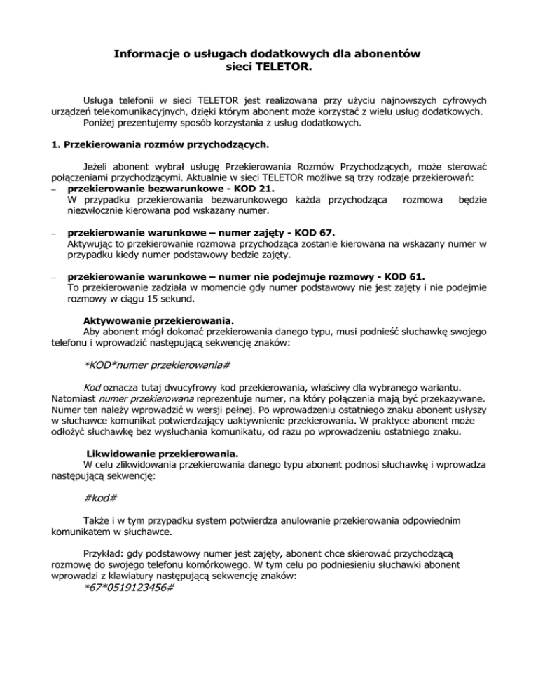Informacje o usługach dodatkowych dla abonentów sieci TELETOR. Usługa telefonii w sieci TELETOR jest realizowana przy użyciu najnowszych cyfrowych urządzeń telekomunikacyjnych, dzięki którym abonent może korzystać z wielu usług dodatkowych. Poniżej prezentujemy sposób korzystania z usług dodatkowych. 1. Przekierowania rozmów przychodzących. Jeżeli abonent wybrał usługę Przekierowania Rozmów Przychodzących, może sterować połączeniami przychodzącymi. Aktualnie w sieci TELETOR możliwe są trzy rodzaje przekierowań: – przekierowanie bezwarunkowe - KOD 21. W przypadku przekierowania bezwarunkowego każda przychodząca rozmowa będzie niezwłocznie kierowana pod wskazany numer. – przekierowanie warunkowe – numer zajęty - KOD 67. Aktywując to przekierowanie rozmowa przychodząca zostanie kierowana na wskazany numer w przypadku kiedy numer podstawowy bedzie zajęty. – przekierowanie warunkowe – numer nie podejmuje rozmowy - KOD 61. To przekierowanie zadziała w momencie gdy numer podstawowy nie jest zajęty i nie podejmie rozmowy w ciągu 15 sekund. Aktywowanie przekierowania. Aby abonent mógł dokonać przekierowania danego typu, musi podnieść słuchawkę swojego telefonu i wprowadzić następującą sekwencję znaków: *KOD*numer przekierowania# Kod oznacza tutaj dwucyfrowy kod przekierowania, właściwy dla wybranego wariantu. Natomiast numer przekierowana reprezentuje numer, na który połączenia mają być przekazywane. Numer ten należy wprowadzić w wersji pełnej. Po wprowadzeniu ostatniego znaku abonent usłyszy w słuchawce komunikat potwierdzający uaktywnienie przekierowania. W praktyce abonent może odłożyć słuchawkę bez wysłuchania komunikatu, od razu po wprowadzeniu ostatniego znaku. Likwidowanie przekierowania. W celu zlikwidowania przekierowania danego typu abonent podnosi słuchawkę i wprowadza następującą sekwencję: #kod# Także i w tym przypadku system potwierdza anulowanie przekierowania odpowiednim komunikatem w słuchawce. Przykład: gdy podstawowy numer jest zajęty, abonent chce skierować przychodzącą rozmowę do swojego telefonu komórkowego. W tym celu po podniesieniu słuchawki abonent wprowadzi z klawiatury następującą sekwencję znaków: *67*0519123456# 2. Poczta głosowa. Kiedy abonent ma aktywną usługę Poczty Głosowej rozmówca zostanie połączony ze skrzynką poczty głosowej w przypadku gdy: - numer telefonu abonenta jest zajęty (należy ustawić przekierowanie: *67*9555#), - terminal (modem) abonenta nie jest połączony z siecią TELETOR (należy ustawić przekierowanie: *61*9555#) , - abonent nie odbierze rozmowy po ok. 20 sekundach (należy ustawić przekierowanie: *61*9555#). Aby połączyć się ze skrzynką poczty głosowej należy z własnego telefonu wybrać numer 9555. Domyślne hasło dostępowe to '1111'. Poniżej przedstawiona jest mapa nawigacji przy obsłudze poczty głosowej. Z najwyższego (głównego) poziomu użytkownik może wybrać odczytywanie i obsługę wiadomości, zmianę bieżącego folderu (katalogu) albo menu opcji. Klawisz '*' zawsze wywołuje pomoc, natomiast klawisz '#'. powoduje powrót do poprzedniego poziomu obsługi. W menu głównym będzie to oczywiście całkowite zakończenie obsługi poczty głosowej. Menu główna: 1. Odczytywanie wiadomości (po naciśnięciu '1' poziomu głównego) 4 Odtworzenie poprzedniej wiadomości 5 Powtórzenie bieżącej wiadomości 6 Odtworzenie następnej wiadomości 7 Kasowanie bieżącej wiadomości 8 Przekierowanie wiadomości do poczty głosowej innego abonenta w obrębie sieci TELETOR 9 Zachowanie wiadomości w wybranym folderze * Pomoc lub podczas odtwarzania wiadomości przewijanie do tyłu # Powrót do głównego menu lub podczas odtwarzania wiadomości przewijanie do przodu 2. Menu folderów (po naciśnięciu '2' z poziomu głównego) 0 Nowe wiadomości 1 Wiadomości w folderze „Stare wiadomości” 2 Wiadomości w folderze „Służbowe wiadomości” 3 Wiadomości w folderze „Rodzinne wiadomości” 4 Wiadomości w folderze „Prywatne wiadomości” * Pomoc # Powrót do głównego menu 3. Menu opcji poczty głosowej (po naciśnięciu '3' z poziomu głównego) 1 Nagranie wiadomości powitalnej 5 Zmiana hasła * Pomoc # Powrót do głównego menu # Zakończenie obsługi poczty głosowej 3. Prezentacja numeru. Usługa prezentacji numeru dzieli się na dwa rodzaje: - CLIP - prezentacja numeru osoby, która dzwoni do abonenta. Usługa ta jest uruchamiana bezpłatnie dla wszystkich użytkowników sieci TELETOR. Dzięki niej abonent wie, kto do niego dzwoni. Oczywiście pod warunkiem, że osoba dzwoniąca nie korzysta z usługi CLIR. - CLIR - blokada prezentacji numeru abonenta. Jeżeli ta usługa jest aktywna to na wyświetlaczu osoby, do której dzwoni abonent, nie pojawi się jego numer (pozostajemy anonimowi). Domyślnie ta usługa jest wyłączona, tzn. numer abonenta będzie pojawiał się na wyświetlaczu telefonu osoby do której dzwonimy. 4. Automatyczna blokada połączeń wychodzących. Dzięki usłudze automatycznej blokady połączeń wychodzących Abonent ma możliwość samodzielnego definiowania poziomu blokady. Dostępne opcje prezetuje poniższa tabela: Poziom blokady Blokada połączeń 1 ● ● ● ● ● ● o podwyższonej opłacie (030x, 040x, 070x) do sieci komórkowych lokalne międzymiastowe międzynarodowe do sieci teleinformatycznych (020x) 2 ● o podwyższonej opłacie (030x, 040x, 070x) 3 ● ● o podwyższonej opłacie (030x, 040x, 070x) międzynarodowe 4 ● ● o podwyższonej opłacie (030x, 040x, 070x) do sieci komórkowych 5 ● ● o podwyższonej opłacie (030x, 040x, 070x) do sieci teleinformatycznych (020x) 6 ● ● ● ● o podwyższonej opłacie (030x, 040x, 070x) do sieci komórkowych międzynarodowe do sieci teleinformatycznych (020x) 7 ● do sieci komórkowych W usłudze dostępne są następujące opcje: ● włączenie blokady - *34*hasło*poziom# Przykład. Hasło