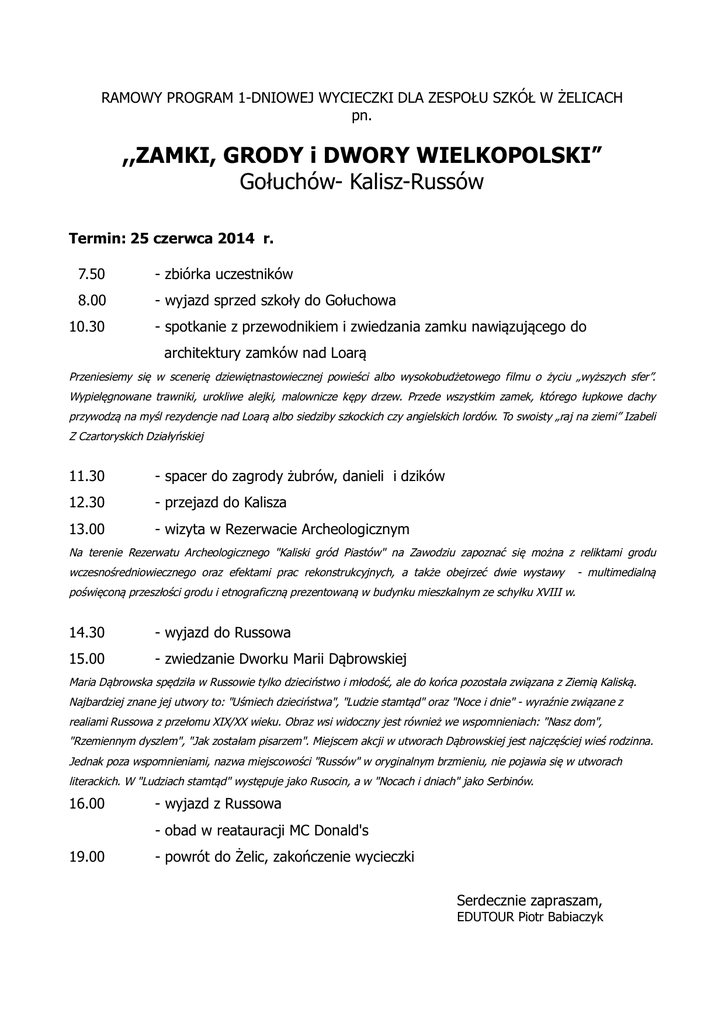 RAMOWY PROGRAM 1-DNIOWEJ WYCIECZKI DLA ZESPOŁU SZKÓŁ W ŻELICACH pn. ,,ZAMKI, GRODY i DWORY WIELKOPOLSKI” Gołuchów- Kalisz-Russów Termin: 25 czerwca 2014 r. 7.50 - zbiórka uczestników 8.00 - wyjazd sprzed szkoły do Gołuchowa 10.30 - spotkanie z przewodnikiem i zwiedzania zamku nawiązującego do architektury zamków nad Loarą Przeniesiemy się w scenerię dziewiętnastowiecznej powieści albo wysokobudżetowego filmu o życiu „wyższych sfer”. Wypielęgnowane trawniki, urokliwe alejki, malownicze kępy drzew. Przede wszystkim zamek, którego łupkowe dachy przywodzą na myśl rezydencje nad Loarą albo siedziby szkockich czy angielskich lordów. To swoisty „raj na ziemi” Izabeli Z Czartoryskich Działyńskiej 11.30 - spacer do zagrody żubrów, danieli i dzików 12.30 - przejazd do Kalisza 13.00 - wizyta w Rezerwacie Archeologicznym Na terenie Rezerwatu Archeologicznego "Kaliski gród Piastów" na Zawodziu zapoznać się można z reliktami grodu wczesnośredniowiecznego oraz efektami prac rekonstrukcyjnych, a także obejrzeć dwie wystawy - multimedialną poświęconą przeszłości grodu i etnograficzną prezentowaną w budynku mieszkalnym ze schyłku XVIII w. 14.30 - wyjazd do Russowa 15.00 - zwiedzanie Dworku Marii Dąbrowskiej Maria Dąbrowska spędziła w Russowie tylko dzieciństwo i młodość, ale do końca pozostała związana z Ziemią Kaliską. Najbardziej znane jej utwory to: "Uśmiech dzieciństwa", "Ludzie stamtąd" oraz "Noce i dnie" - wyraźnie związane z realiami Russowa z przełomu XIX/XX wieku. Obraz wsi widoczny jest również we wspomnieniach: "Nasz dom", "Rzemiennym dyszlem", "Jak zostałam pisarzem". Miejscem akcji w utworach Dąbrowskiej jest najczęściej wieś rodzinna. Jednak poza wspomnieniami, nazwa miejscowości "Russów" w oryginalnym brzmieniu, nie pojawia się w utworach literackich. W "Ludziach stamtąd" występuje jako Rusocin, a w "Nocach i dniach" jako Serbinów. 16.00 - wyjazd z Russowa - obad w reatauracji MC Donald's 19.00 - powrót do Żelic, zakończenie wycieczki Serdecznie zapraszam, EDUTOUR Piotr Babiaczyk