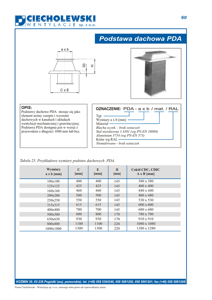 60 W E N T Y L A C J E sp. z o.o. Podstawa dachowa PDA H 30 axb CxE OPIS: Podstawy dachowe PDA stosuje siê jako element noœny czerpni i wyrzutni dachowych w kana³ach i uk³adach wentylacji mechanicznej i grawitacyjnej. Podstawa PDA dostêpna jest w wersji z przewodem o d³ugoœci 1000 mm lub bez. OZNACZENIE: PDA - a x b / mat. / RAL Typ Wymiary a x b [mm] Materia³ Blacha ocynk. - brak oznaczeñ Stal nierdzewna 1.4301 (wg PN-EN 10088) Aluminium 5754 (wg PN-EN 573) Kolor wg RAL Niemalowane - brak oznaczeñ Tabela 25. Przyk³adowe wymiary podstaw dachowych PDA. Wymiary a x b [mm] C [mm] E [mm] H [mm] Cokó³ CDC, CDIC A x B [mm] 100x100 125x125 160x160 200x200 250x250 315x315 400x400 500x500 630x630 800x800 1000x1000 400 425 460 500 550 615 700 800 930 1100 1300 400 425 460 500 550 615 700 800 930 1100 1300 145 145 145 145 145 145 145 170 170 220 220 380 x 380 400 x 400 440 x 440 480 x 480 530 x 530 600 x 600 680 x 680 780 x 780 910 x 910 1080 x 1080 1280 x 1280 Firma Ciecholewski - Wentylacje sp. z o.o. zastrzega sobie prawo do wprowadzania zmian 61 H W E N T Y L A C J E sp. z o.o. Cokó³ dachowy CDC / CDIC 50 α B CxD A OPIS: Cokó³ dachowy CDC/CDIC jest wykonywany w wersji z izolacj¹ lub bez. Mo¿e byæ montowany z podstawami dachowymi typu B. Zastosowana izolacja z we³ny mineralnej ma charakter dŸwiêko i ciep³ochronny. OZNACZENIE: CDC - A x B / α / mat. / RAL Typ CDC - cokó³ dachowy CDIC - cokó³ dach. izolowany Wymiary [mm] K¹t nachylenia [°] Materia³ Blacha ocynk. - brak oznaczeñ Stal nierdzewna 1.4301 (wg PN-EN 10088) Aluminium 5754 (wg PN-EN 573) Kolor wg. RAL Niemalowane - brak oznaczeñ Tabela 26. Przyk³adowe wymiary coko³ów dachowych CDC / CDIC. Wymiary AxB [mm] Wymiary CxD [mm] Wymiar H [mm] Wymiary PDA axb [mm] 380 x 380 400 x 400 440 x 440 480 x 480 530 x 530 600 x 600 680 x 680 780 x 780 910 x 910 1080 x 1080 1280 x 1280 580 x 580 600 x 600 640 x 640 680 x 680 730 x 730 800 x 800 880 x 880 980 x 980 1010 x 1010 1280 x 1280 1480 x 1480 500 500 500 500 500 500 500 500 500 500 500 100x100 125x125 160x160 200x200 250x250 315x315 400x400 500x500 630x630 800x800 1000x1000 Firma Ciecholewski - Wentylacje sp. z o.o. zastrzega sobie prawo do wprowadzania zmian 62 W E N T Y L A C J E sp. z o.o. Cokó³ dachowy t³umi¹cy CDTC H A 50 α B OPIS: Coko³y dachowe CDTC stosowane s¹ w celu t³umienia dŸwiêku w kana³ach wentylacyjnych wyci¹gowych. Wspó³pracuj¹ z wentylatorami dachowymi ró¿nego typu. Mog¹ byæ montowane z podstawami dachowymi typu B I, bezpoœrednio z wentylatorami lub wywietrzakami. Œcianki oraz kulisy t³umi¹ce wy³o¿one s¹ materia³em dŸwiêkoch³onnym. OZNACZENIE: CDTC - A / α / mat. / RAL Typ Wymiar A [mm] K¹t nachylenia [°] Materia³ Blacha ocynk. - brak oznaczeñ Stal nierdzewna 1.4301 (wg PN-EN 10088) Aluminium 5754 (wg PN-EN 573) Kolor wg. RAL Niemalowane - brak oznaczeñ Tabela 27. Wymiary coko³ów dachowych CDTC. Wymiar A [mm] Wymiar B [mm] Wymiar H [mm] Liczba wk³adów o gruboœci 100 mm 380 425 440 480 530 600 680 780 910 1080 1280 580 625 640 680 730 800 880 980 1110 1280 1480 500 500 500 500 500 500 500 500 500 500 500 1 1 1 1 2 2 2 3 3 4 4 Firma Ciecholewski - Wentylacje sp. z o.o. zastrzega sobie prawo do wprowadzania zmian
