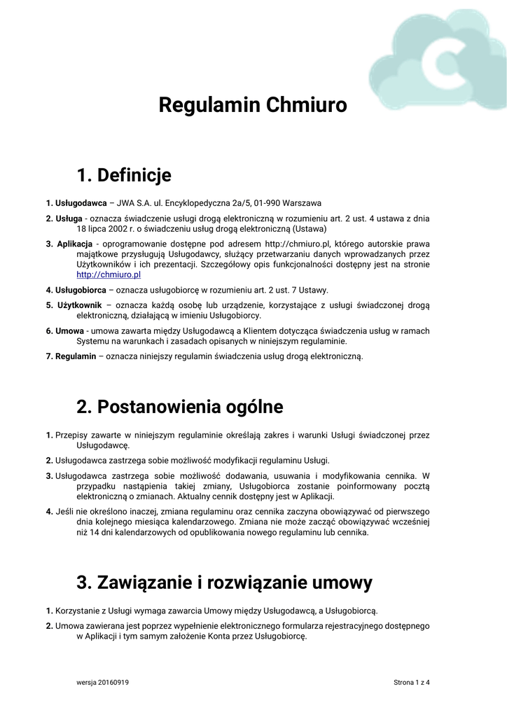 Regulamin Chmiuro 1. Definicje 1. Usługodawca – JWA S.A. ul. Encyklopedyczna 2a/5, 01-990 Warszawa 2. Usługa - oznacza świadczenie usługi drogą elektroniczną w rozumieniu art. 2 ust. 4 ustawa z dnia 18 lipca 2002 r. o świadczeniu usług drogą elektroniczną (Ustawa) 3. Aplikacja - oprogramowanie dostępne pod adresem http://chmiuro.pl, którego autorskie prawa majątkowe przysługują Usługodawcy, służący przetwarzaniu danych wprowadzanych przez Użytkowników i ich prezentacji. Szczegółowy opis funkcjonalności dostępny jest na stronie http://chmiuro.pl 4. Usługobiorca – oznacza usługobiorcę w rozumieniu art. 2 ust. 7 Ustawy. 5. Użytkownik – oznacza każdą osobę lub urządzenie, korzystające z usługi świadczonej drogą elektroniczną, działającą w imieniu Usługobiorcy. 6. Umowa - umowa zawarta między Usługodawcą a Klientem dotycząca świadczenia usług w ramach Systemu na warunkach i zasadach opisanych w niniejszym regulaminie. 7. Regulamin – oznacza niniejszy regulamin świadczenia usług drogą elektroniczną. 2. Postanowienia ogólne 1. Przepisy zawarte w niniejszym regulaminie określają zakres i warunki Usługi świadczonej przez Usługodawcę. 2. Usługodawca zastrzega sobie możliwość modyfikacji regulaminu Usługi. 3. Usługodawca zastrzega sobie możliwość dodawania, usuwania i modyfikowania cennika. W przypadku nastąpienia takiej zmiany, Usługobiorca zostanie poinformowany pocztą elektroniczną o zmianach. Aktualny cennik dostępny jest w Aplikacji. 4. Jeśli nie określono inaczej, zmiana regulaminu oraz cennika zaczyna obowiązywać od pierwszego dnia kolejnego miesiąca kalendarzowego. Zmiana nie może zacząć obowiązywać wcześniej niż 14 dni kalendarzowych od opublikowania nowego regulaminu lub cennika. 3. Zawiązanie i rozwiązanie umowy 1. Korzystanie z Usługi wymaga zawarcia Umowy między Usługodawcą, a Usługobiorcą. 2. Umowa zawierana jest poprzez wypełnienie elektronicznego formularza rejestracyjnego dostępnego w Aplikacji i tym samym założenie Konta przez Usługobiorcę. wersja 20160919 Strona 1 z 4 3. Poprzez utworzenie Konta Usługobiorca oświadcza, że zapoznał się z niniejszym Regulaminem i akceptuje w całości jego warunki. 4. Podając swoje dane identyfikacyjne w formularzu rejestracyjnym, Usługobiorca potwierdza ich autentyczność i zgodność ze stanem faktycznym. 5. Usługobiorca ma prawo wypowiedzieć Umowę bez podania przyczyny w dowolnej chwili, wysyłając oświadczenie drogą elektroniczną do Usługodawcy. Usługodawca nie zwraca opłaty wniesionej z góry za niewykorzystany okres w przypadku wypowiedzenia umowy przez Usługobiorcę. 6. Usługobiorca ma prawo wypowiedzieć Umowę w przypadku nie zaakceptowania nowych warunków regulaminu lub cennika, w okresie pomiędzy opublikowaniem owego regulaminu lub cennika, a wejściem ich w życie. W takim przypadku Usługodawca zobowiązuje się do zwrotu opłaty wniesionej z góry za niewykorzystany okres. 7. Zaleganie z opłatami za Usługę przez okres dłuższy niż 30 dni traktowane jest, jako wypowiedzenie Umowy przez Usługobiorcę bez podania przyczyny. 4. Prawa i obowiązki Stron 1. Warunkiem koniecznym korzystania z Aplikacji przez Usługobiorcę jest posiadanie sprawnego łącza internetowego w celu dostępu do Usługi. 2. Zabronione jest umieszczanie w Aplikacji materiałów niedozwolonych prawem, oraz podejmowania wszelkich działań niezgodnych z prawem, w tym podejmowania prób blokowania lub upośledzania działania Aplikacji, podejmowania prób wykradania danych innych Użytkowników i Usługobiorców, umieszczania wirusów, skryptów służących wykradzeniu tożsamości, oraz podejmowania innych podobnych działań. W przypadku stwierdzenia przez Usługodawcę prób podejmowania przez Użytkownika tego typu działań, Usługodawca zastrzega sobie możliwość zablokowania konta Użytkownika i/lub konta firmy Użytkownika, usunięcia materiałów umieszczonych niezgodnie z prawem, oraz poinformowania o tych działaniach organów sprawiedliwości. 3. Usługodawca zobowiązuje się do świadczenia Usługi z zachowaniem należytej staranności. 4. Usługodawca zastosuje odpowiednie środki techniczne tak dobrane, aby dane wprowadzane przez Usługobiorcę były bezpiecznie przesyłane, przechowywane i zabezpieczone przed niepowołanym dostępem. 5. Usługodawca zobowiązuje się do zastosowania środków technicznych mających na celu zapewnienie trwałości danych wprowadzonych przez Usługobiorców do Aplikacji. W przypadku stwierdzenia awarii systemu, Usługodawca zastrzega sobie możliwość przywrócenia systemu do stanu z ostatniej wykonanej kopii bezpieczeństwa. 6. Usługodawca nie ponosi odpowiedzialności za skutki spowodowane ujawnieniem przez Użytkownika hasła do Aplikacji osobom trzecim. 7. Usługodawca nie ponosi odpowiedzialności za skutki spowodowane podsłuchaniem przez osoby trzecie danych przesyłanych przez sieć Internet. Usługodawca dochowując należytej staranności, w celu zabezpieczenia Użytkowników przed takimi zagrożeniami, stosuje ochronę kryptograficzną transmisji z wykorzystaniem certyfikatów SSL. 8. Usługodawca nie ponosi odpowiedzialności za skutki niewłaściwego używania Aplikacji. 9. Usługodawca zastrzega sobie możliwość przeprowadzania konserwacji i aktualizacji Aplikacji. W tym czasie Aplikacja może być niedostępna dla Użytkowników. Usługodawca dołoży wszelkich starań, aby przerwy takie następowały w czasie, który spowoduje możliwie najmniejsze zakłócenia w działaniu Aplikacji dla Użytkowników. wersja 20160919 Strona 2 z 4 10. Usługodawca nie odpowiada za zakłócenia w działaniu Usługi spowodowane przez przyczyny niezależne od Usługodawcy, w tym między innymi: brak lub wadliwe działanie połączenia internetowego pomiędzy komputerem Użytkownika, a serwerami Aplikacji, nieprawidłowe działanie urządzeń używanych przez Użytkownika do obsługi A