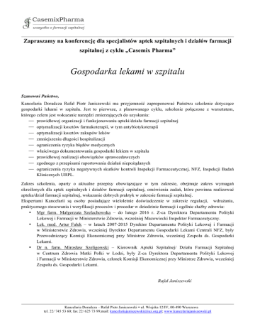 Zapraszamy na konferencję dla specjalistów aptek szpitalnych i działów farmacji szpitalnej z cyklu „Casemix Pharma” Gospodarka lekami w szpitalu Szanowni Państwo, Kancelaria Doradcza Rafał Piotr Janiszewski ma przyjemność zaproponować Państwu szkolenie dotyczące gospodarki lekami w szpitalu. Jest to pierwsze, z planowanego cyklu, szkolenie połączone z warsztatem, którego celem jest wskazanie narzędzi zmierzających do uzyskania: ⎯ prawidłowej organizacji i funkcjonowaniu apteki/działu farmacji szpitalnej ⎯ optymalizacji kosztów farmakoterapii, w tym antybiotykoterapii ⎯ optymalizacji kosztów zakupów leków ⎯ zmniejszeniu długości hospitalizacji ⎯ ograniczenia ryzyka błędów medycznych ⎯ właściwego dokumentowania gospodarki lekiem w szpitalu ⎯ prawidłowej realizacji obowiązków sprawozdawczych ⎯ zgodnego z przepisami raportowania działań niepożądanych ⎯ ograniczenia ryzyka negatywnych skutków kontroli Inspekcji Farmaceutycznej, NFZ, Inspekcji Badań Klinicznych URPL. Zakres szkolenia, oparty o aktualne przepisy obowiązujące w tym zakresie, obejmuje zakres wymagań określonych dla aptek szpitalnych i działów farmacji szpitalnej, omówienia zadań, które powinna realizować apteka/dział farmacji szpitalnej, wskazanie dobrych praktyk w zakresie farmacji szpitalnej. Ekspertami Kancelarii są osoby posiadające wieloletnie doświadczenie w zakresie regulacji, wdrażania, praktycznego stosowania i weryfikacji procesów i procedur w dziedzinie farmacji i ogólnie służby zdrowia: • Mgr farm. Małgorzata Szelachowska – do lutego 2016 r. Z-ca Dyrektora Departamentu Polityki Lekowej i Farmacji w Ministerstwie Zdrowia, wcześniej Mazowiecki Inspektor Farmaceutyczny. • Lek. med. Artur Fałek – w latach 2007-2015 Dyrektor Departamentu Polityki Lekowej i Farmacji w Ministerstwie Zdrowia, wcześniej Dyrektor Departamentu Gospodarki Lekami Centrali NFZ, były Przewodniczący Komisji Ekonomicznej przy Ministrze Zdrowia, wcześniej Zespołu ds. Gospodarki Lekami. • Dr n. farm. Mirosław Szeligowski – Kierownik Apteki Szpitalnej/ Działu Farmacji Szpitalnej w Centrum Zdrowia Matki Polki w Łodzi, były Z-ca Dyrektora Departamentu Polityki Lekowej i Farmacji w Ministerstwie Zdrowia, członek Komisji Ekonomicznej przy Ministrze Zdrowia, wcześniej Zespołu ds. Gospodarki Lekami. Rafał Janiszewski Kancelaria Doradcza – Rafał Piotr Janiszewski ul. Wiejska 12/IV, 00-490 Warszawa tel. 22/ 745 53 60; fax 22/ 625 73 99,mail: [email protected]; www.kancelariajaniszewski.pl PROGRAM KONFERENCJI: Dzień Pierwszy – 9 września 2016 (piątek) 12:00 Zakwaterowanie uczestników 13:00 Obiad 14:00 - 14:45 Kierunki zmian działalności leczniczej a gospodarka lekami w szpitalu i zarządzanie apteką. ⎯ Dekomercjalizacja szpitali. Ustawa o działalności leczniczej ⎯ Pojęcie racjonalnej gospodarki lekami ⎯ Znaczenie racjonalnej gospodarki lekami w systemie budżetowym ⎯ Sposoby liczenia kosztów apteki. 15:00 - 15:40 Prawo farmaceutyczne na co dzień ⎯ legislacja europejska ⎯ legislacja narodowa Obowiązki podmiotu leczniczego w zakresie prowadzenia apteki/działu farmacji szpitalnej ⎯ przepisy prawa regulujące działalność apteki szpitalnej ⎯ umiejscowienie w strukturze organizacyjnej przykłady ⎯ apteka, apteka zakładowa, dział farmacji szpitalnej różnice ⎯ wymagania kadrowe ⎯ wymagania lokalowe ⎯ wymagania sprzętowe 16:00 - 16:45 Organizacja i funkcjonowanie apteki/działu farmacji szpitalnej ⎯ dobre praktyki organizacji apteki szpitalnej ⎯ wytyczne Europejskiego Stowarzyszenia Farmaceutów Szpitalnych ⎯ znaczenie apteki w kontraktowaniu świadczeń 17:00 - 17:45 Zadania apteki szpitalnej ⎯ organizowanie zaopatrzenia szpitala w produkty lecznicze i wyroby medyczne ⎯ wydawanie produktów leczniczych i wyrobów medycznych, określonych w odrębnych przepisach ⎯ współuczestniczenie w prowadzeniu gospodarki produktami leczniczymi i wyrobami medycznymi w szpitalu ⎯ sporządzanie leków recepturowych ⎯ sporządzenie leków aptecznych; ⎯ wytwarzanie leków: a) cytostatycznych b) do żywienia pozajelitowego c) do żywienia dojelitowego Kancelaria Doradcza – Rafał Piotr Janiszewski ul. Wiejska 12/IV, 00-490 Warszawa tel. 22/ 745 53 60; fax 22/ 625 73 99; mail: [email protected]; www.kancelariajaniszewski.pl ⎯ ⎯ ⎯ ⎯ ⎯ d) radiofarmaceutycznych e) wytwarzanie płynów infuzyjnych f) przygotowywanie roztworów do hemodializy i dializy dootrzewnowej udzielanie informacji o produktach leczniczych i wyrobach medycznych udział w monitorowaniu działań niepożądanych leków udział w badaniach klinicznych prowadzonych na terenie szpitala udział w racjonalizacji farmakoterapii Najczęściej zadawane pytania 18:00 - 18:45 Obowiązki sprawozdawcze, dokumentacyjne, ewidencyjne, i rozliczenia z płatnikiem ⎯ prawidłowej realizacja obowiązków sprawozdawczych ⎯ właściwe dokumentowanie i raportowanie obrotu lekami i wyrobami medycznymi w szpitalu ⎯ sprawozdawczość wewnętrzna, dla zarządu dla Kierownika Apteki ⎯ prowadzenie ewidencji leków ⎯ udział w rozliczeniach z płatnikiem 19:30 Kolacja Dzień Drugi – 10 września 2016 (sobota) 8:00 Śniadanie 9:00 - 9:45 Bezpieczeństwo farmakoterapii – odpowiedzialność szpitala ⎯ pharmacovigilance ⎯ dobra praktyka dystrybucyjna ⎯ dobra praktyka wytwarzania ⎯ dobra praktyka kliniczna ⎯ ograniczanie ryzyka błędów medycznych; ⎯ wykrywanie i zgłaszanie działań niepożądanych; Wsparcie działań apteki szpitalnej ⎯ wsparcie Kierownictwa szpitala z perspektywy Kierownika Apteki Szpitalnej , Inspekcji Farmaceutycznej, teorii zarządzania zmianą. ⎯ Rola i zadania Komitetu Terapeutycznego ⎯ Receptariusz szpitalny i szpitalna lista leków ⎯ wsparcie systemowe realizacji zadań ⎯ jak uniknąć zakupu niedostosowanego do potrzeb oprogramowania. ⎯ zestaw minimalnych wymagań dla systemów typu PhIS 10:00 - 10:45 Aspe