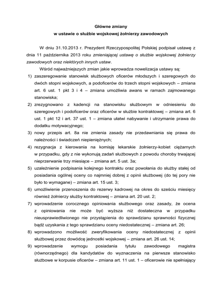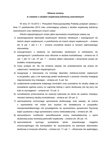 Główne zmiany w ustawie o służbie wojskowej żołnierzy zawodowych W dniu 31.10.2013 r. Prezydent Rzeczypospolitej Polskiej podpisał ustawę z dnia 11 października 2013 roku zmieniającej ustawę o służbie wojskowej żołnierzy zawodowych oraz niektórych innych ustaw. Wśród najważniejszych zmian jakie wprowadza nowelizacja ustawy są: 1) zaszeregowanie stanowisk służbowych oficerów młodszych i szeregowych do dwóch stopni wojskowych, a podoficerów do trzech stopni wojskowych – zmiana art. 6 ust. 1 pkt 3 i 4 – zmiana umożliwia awans w ramach zajmowanego stanowiska; 2) zrezygnowano z kadencji na stanowisku służbowym w odniesieniu do szeregowych i podoficerów oraz oficerów w służbie kontraktowej – zmiana art. 6 ust. 1 pkt 12 i art. 37 ust. 1 – zmiana ułatwi nabywanie i utrzymanie prawa do dodatku motywacyjnego; 3) nowy przepis art. 8a nie zmienia zasady nie przedawniania się prawa do należności i świadczeń niepieniężnych; 4) rezygnacja z kierowania na komisję lekarskie żołnierzy-kobiet ciężarnych w przypadku, gdy z nie wykonują zadań służbowych z powodu choroby trwającej nieprzerwanie trzy miesiące – zmiana art. 5 ust. 3a; 5) uzależnienie podpisania kolejnego kontraktu oraz powołania do służby stałej od posiadania ogólnej oceny co najmniej dobrej z opinii służbowej (do tej pory nie było to wymagane) – zmiana art. 15 ust. 3; 6) umożliwienie przenoszenia do rezerwy kadrowej na okres do sześciu miesięcy również żołnierzy służby kontraktowej – zmiana art. 20 ust. 2; 7) wprowadzenie corocznego opiniowania służbowego oraz zasady, że ocena z opiniowania nie może być wyższa niż dostateczna w przypadku nieusprawiedliwionego nie przystąpienia do sprawdzianu sprawności fizycznej bądź uzyskania z tego sprawdzianu oceny niedostatecznej – zmiana art. 26; 8) wprowadzono możliwość zweryfikowania oceny niedostatecznej z opinii służbowej przez dowódcę jednostki wojskowej – zmiana art. 26 ust. 14; 9) wprowadzenie wymogu posiadania tytułu zawodowego magistra (równorzędnego) dla kandydatów do wyznaczenia na pierwsze stanowisko służbowe w korpusie oficerów – zmiana art. 11 ust. 1 – oficerowie nie spełniający tego wymogu mogą nadal zajmować stanowiska służbowe na poziomie zajmowanego w dniu wejścia w życie ustawy (art. 5 ustawy zmieniającej ustawę o służbie wojskowej żołnierzy zawodowych); 10) umożliwienie wyznaczenia żołnierza zawodowego, za jego zgodą, na niższe stanowisko służbowe w przypadku likwidacji zajmowanego stanowiska służbowego bądź rozformowania jednostki wojskowej albo zmniejszenie stanu etatowego jednostki wojskowej – nowy art. 42 b ust. 1 i 2 – w trosce o nienadużywanie instytucji na wniosek Konwentu ograniczono wyznaczenia na stanowiska o jeden stopień niższe; 11) zrezygnowano z usprawiedliwienia nieprzystąpienia do sprawdzianu sprawności fizycznej z przyczyn służbowych oraz wprowadzono możliwości zdawania przez żołnierzy sprawdzianu sprawności fizycznej przez cały rok kalendarzowy – zmiana art. 50a ust. 2 i 3; 12) zrezygnowano z ograniczenia do trzech lat wstecz prawa wypłaty ekwiwalentu za niewykorzystany urlop wypoczynkowy i dodatkowy urlop – zmiana art. 95 pkt 2; UWAGA: Żołnierze, którym w dniu zwolnienia z zawodowej służby wojskowej posiadał zaległy urlop wypoczynkowy za okres dłuższy niż wypłacono ekwiwalent pieniężny mogą wystąpić w terminie 6 miesięcy od dnia wejścia w życie nowelizacji ustawy pragmatycznej do dowódcy jednostki wojskowej, który przyznał im należności przysługujące w związku ze zwolnieniem ze służby wojskowej (lub jego następcy prawnego w przypadku likwidacji jednostki wojskowej) z wnioskiem o wypłatę ekwiwalentu za tę część niewykorzystanego urlopu za który nie wypłacono ekwiwalentu – art. 10 ustawy zmieniającej ustawę o służbie wojskowej żołnierzy zawodowych. 13) wprowadzenie zasady zgodnie z którą wypowiedzenie przez żołnierza stosunku służbowego w okresie 12 miesięcy od dnia objęcia wyższego stanowiska służbowego bądź stanowiska służbowego zaszeregowanego do wyższej grupy uposażenia skutkować będzie wypłatą należności z tytułu zwolnienia ze służby z uwzględnieniem otrzymywanego uposażenia na poprzednim stanowisku służbowym. Przepis nie będzie miał wpływu na ustalenie podstawy wymiaru emerytury wojskowej, która będzie naliczana z uposażenia należnego na ostatnio zajmowanym stanowisku służbowym – nowy art. 97a; 14) usunięcie dwóch przesłanek uzasadniających obligatoryjne zwolnienia żołnierza z zawodowej służby wojskowej, tj. uzyskania w dwóch kolejnych latach oceny niedostatecznej ze sprawdzianu sprawności fizycznej lub nieusprawiedliwionego nieprzystąpienia w dwóch kolejnych latach do tego sprawdzianu oraz niezłożenia w terminie oświadczenia majątkowego – wykreślenie pkt 6a i 6 b z art. 111; 15) wprowadzono limity na udzielenie pomocy w zakresie przekwalifikowania zawodowego po 9 latach służby w wysokości 200% (limit to 75% najniższego uposażenia zasadniczego) – zmiana art. 120 ust. 4b pkt 2; 16) umożliwiono w terminie do dnia 31 grudnia 2014 roku, byłym żołnierzom zawodowym oraz byłym żołnierzom nadterminowej zasadniczej służby wojskowej, którzy wskutek wypadku w związku lub podczas wykonywania obowiązków służbowych albo choroby pozostającej w związku ze służbą wojskową pełnioną poza granicami państwa po dniu 1 stycznia 1998 roku doznali stałego lub długotrwałego uszczerbku na zdrowiu, złożenie wniosku do Ministra Obrony Narodowej o powołanie do zawodowej służby wojskowej, o ile właściwa wojskowa komisja lekarska orzeknie o zaliczeniu tych żołnierzy do kategorii Z/O (zdolny z ograniczeniami) – art. 14 ustawy zmieniającej ustawę o służbie wojskowej żołnierzy zawodowych. Jest to kolejna po wprowadzeniu w ustawie zmieniającej w 2010 roku możliwość powrotu do sł