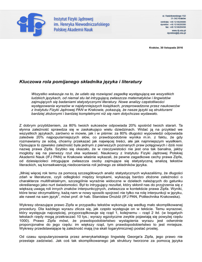 Kraków, 30 listopada 2016 Kluczowa rola pomijanego składnika języka i literatury Wszystko wskazuje na to, że udało się rozwiązać zagadkę występującą we wszystkich ludzkich językach, od niemal stu lat intrygującą zwłaszcza matematyków i lingwistów zajmujących się badaniami statystycznymi literatury. Nowe analizy częstotliwości występowania wyrazów w najsłynniejszych książkach, przeprowadzone przez naukowców z Instytutu Fizyki Jądrowej PAN w Krakowie, pokazują, że nasze języki są strukturami bardziej złożonymi i bardziej kompletnymi niż się nam dotychczas wydawało. Z dobrym przybliżeniem, za 80% twoich sukcesów odpowiada 20% spośród twoich starań. Ta słynna zależność sprawdza się w zaskakująco wielu dziedzinach. Widać ją na przykład we wszystkich językach, zarówno w mowie, jak i w piśmie: za 80% długości wypowiedzi odpowiada zaledwie 20% najpopularniejszych słów, co prawdopodobnie wynika m.in. z faktu, że gdy rozmawiamy ze sobą, chcemy przekazać jak najwięcej treści, ale jak najmniejszym wysiłkiem. Opisująca to zjawisko zależność była jednym z pierwszych poznanych praw potęgowych i dziś nosi nazwę prawa Zipfa. Szybko się okazało, że w rzeczywistości nie jest ona tak banalna, jakby mogłoby się na pierwszy rzut oka wydawać. Naukowcy z Instytutu Fizyki Jądrowej Polskiej Akademii Nauk (IFJ PAN) w Krakowie właśnie wykazali, że pewne zagadkowe cechy prawa Zipfa, od dziesięcioleci intrygujące zwłaszcza osoby zajmujące się statystyczną analizą tekstów literackich, są konsekwencją niedoceniania roli jednego ze składników języka. „Mniej więcej rok temu za pomocą szczegółowych analiz statystycznych wykazaliśmy, że długości zdań w literaturze, czyli odległości między kropkami, wykazują bardzo złożone zależności o charakterze multifraktalnym, szczególnie wyraźnie widoczne w dziełach należących do gatunku określanego jako nurt świadomości. Był to intrygujący rezultat, który skłonił nas do przyjrzenia się z większą uwagą roli innych znaków interpunkcyjnych, zwłaszcza w kontekście prawa Zipfa. Wyniki, które teraz otrzymaliśmy, każą nam w nowy sposób spojrzeć nie tylko na rolę interpunkcji w języku, ale nawet na sam język”, mówi prof. dr hab. Stanisław Drożdż (IFJ PAN, Politechnika Krakowska). Wykresy obrazujące prawo Zipfa w przypadku tekstów wykonuje się według mało skomplikowanej procedury. Dla każdego wyrazu zlicza się, jak często występuje on w tekście. Temu wyrazowi, który występuje najczęściej, przyporządkowuje się rząd 1, kolejnemu – rząd 2 itd. (w bogatych tekstach rzędy mogą przekraczać 10 tys.; wyrazy egzotyczne zwykle pojawiają się powyżej rzędu 1000). Prawo Zipfa mówi, że prawdopodobieństwo wystąpienia wyrazu jest odwrotnie proporcjonalne do jego rzędu: im większy rząd, tym prawdopodobieństwo to jest mniejsze. Wykresy przedstawiające tę zależność mają (na skali logarytmicznej) postać prostej. Od czasu spopularyzowania przez amerykańskiego lingwistę George'a Zipfa, jego prawo nie przestaje zadziwiać. Jak coś tak skomplikowanego jak struktury tworzone za pomocą języka można opisać tak prostym prawem? Zagadek było więcej. Dość wcześnie zauważano, że wykresy dotyczące częstotliwości występowania wyrazów dla rzędów bliskich jedności odginają się nieco w dół od prostej. Owo odgięcie szczególnie intrygowało Benoit Mandelbrota, wielkiego francuskiego matematyka polskiego pochodzenia, który zajmował się tym zagadnieniem przez wiele lat. Zaproponował on nawet własną poprawkę do oryginalnego prawa Zipfa, lepiej odwzorowującą odgięcie (warto w tym miejscu wspomnieć, że to m.in. prace nad prawem Zipfa pchnęły Mandelbrota ku koncepcji fraktali). W swoich najnowszych badaniach fizycy z IFJ PAN poddali analizie teksty napisane w sześciu językach indoeuropejskich, należących do grup germańskiej (angielski i niemiecki), romańskiej (francuski i włoski) i słowiańskiej (polski i rosyjski). Użyto dzieł literackich z archiwów Projektu Gutenberg (www.gutenberg.org), o długości co najmniej pięciu tysięcy zdań. W każdym z języków z co najmniej pięciu różnych tekstów utworzono także jeden dodatkowy, liczący około miliona wyrazów. Wszędzie usunięto wyrazy niezwiązane z przenoszoną treścią, takie jak „rozdział”, „część” czy „epilog”, a także charakterystyczne dla danego języka skróty, np. „Mr.” czy „Dr.”, które po wykasowaniu kropek traktowano jako odrębne wyrazy. Zlikwidowano także przypisy, numery stron i inne znaki o charakterze bardziej typograficznym: cudzysłowy i nawiasy. „Ostatecznie znakami interpunkcyjnymi uwzględnianymi w naszych analizach były przecinki, dwukropki i średniki, a za znaki kończące zdania uznaliśmy kropki, wykrzykniki, pytajniki i wielokropki”, precyzuje dr hab. Jarosław Kwapień (IFJ PAN), jeden ze współautorów publikacji w znanym czasopiśmie naukowym „Information Sciences”. Wśród badanych dzieł znalazły się m.in.: „1984” George'a Orwella, „Moby Dick” Hermana Melville'a, „Ulysses” Jamesa Joyce'a, „Gulliver's Travel” Jonathana Swifta, „Gone with the Wind” Margaret Mitchell, „Also sprach Zarathustra” Friedricha Nietzschego, „Der Process” Franza Kafki, „Der Zauberberg” Thomasa Manna, „Madame Bovary” Gustavea Flauberta, „Le Fantôme de L’Opéra” Gastona Leroux, „Il pendolo di Foucault” Umberto Eco, „Giacinta” Luigiego Capuany, „Przedwiośnie” Stefana Żeromskiego, „Ziemia obiecana” Władysława Reymonta, „Lalka” Bolesława Prusa, „Anna Karenina” i „Wojna i pokój” Lwa Tołstoja, a także „Bracia Karamazow” Fiodora Dostojewskiego. Uwzględnienie znaków interpunkcyjnych doprowadziło do interesującego rezultatu: zakrzywienie wykresu Zipfa dla wyrazów o rzędach bliskich jedności praktycznie zniknęło. Now