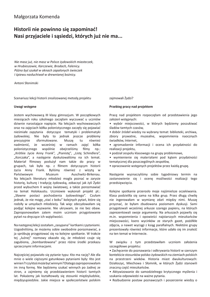 Małgorzata Komenda Historii nie powinno się zapominać! Nasi przyjaciele i sąsiedzi, których już nie ma... Nie masz już, nie masz w Polsce żydowskich miasteczek, w Hrubieszowie, Karczewie, Brodach, Falenicy. Późno byś szukał w oknach zapalonych świeczek I śpiewu nasłuchiwał w drewnianej bożnicy. Antoni Słonimski Scenariusz lekcji historii zrealizowanej metodą projektu zajmowali Żydzi? Uwagi wstępne Przebieg pracy nad projektem Jestem wychowawcą III klasy gimnazjum. W początkowych miesiącach roku szkolnego zaczęłam wyczuwać u uczniów dziwnie narastające napięcie. Na lekcjach wychowawczych oraz na zajęciach kółka polonistycznego zaczęły się pojawiać nieśmiałe zapytania dotyczące tematyki i problematyki żydowskiej. Nie były to jednak jeszcze problemy precyzyjnie sformułowane. Muszę tu również nadmienić, że wcześniej w ramach zajęć kółka polonistycznego wspólnie obejrzeliśmy filmy np.: „Krótkie życie Anny Frank”, „Pianistę”, „Listę Schindlera”, „Korczaka”, a następnie dyskutowaliśmy na ich temat. Materiał filmowy posłużył nam także do pracy w grupach, tak było np. z filmem dotyczącym historii życia Anny Frank. Byliśmy również z wizytą w Państwowym Muzeum Auschwitz-Birkenau. Na lekcjach literatury młodzież mogła poznać w zarysie historię, kulturę i tradycję żydowską, zobaczyć jak żyli Żydzi przed wybuchem II wojny światowej, a także porozmawiać na temat Holokaustu. Uczniowie wykonali projekt pt.: „Sławne postaci pochodzenia żydowskiego”. Czułam jednak, że nie mogę „stać z boku” kolejnych pytań, które się rodziły w umysłach młodzieży. Tak więc zdecydowałam się podjąć kolejne wyzwanie. Nie ukrywam, że nie bez obaw. Zaproponowałam zatem moim uczniom przygotowanie pytań na dręczące ich wątpliwości. Pracę nad projektem rozpoczęłam od przedstawienia jego założeń wstępnych: • wybór miejscowości, w których będziemy poszukiwać śladów tamtych czasów, • dobór źródeł wiedzy na wybrany temat: biblioteki, archiwa, zbiory prywatne, muzealne, wspomnienia naocznych świadków, Internet, • zgromadzenie informacji i ocena ich przydatności do realizacji projektu, • podział zespołu klasowego na grupy problemowe, • wymienienie się materiałami pod kątem przydatności tematycznej dla poszczególnych zespołów, • opracowanie wstępnych projektów przez każdą grupę. Na następnej lekcji zostałam „zasypana” kartkami z pytaniami. Uzgodniliśmy, że możemy sobie swobodnie porozmawiać, a ja spróbuję przygotować się na kolejne spotkanie. W trakcie tej „luźnej” rozmowy okazało się, że młodzież czuje się zagubiona, „bombardowana” przez różne środki przekazu sprzecznymi informacjami. Najczęściej pojawiało się pytanie typu: Kto ma rację? Ale dla mnie o wiele cięższymi gatunkowo pytaniami były: Kto jest winien? I czy ktoś może być winnym? Dlatego zaproponowałam im inną formę. Nie będziemy szukać winnych po żadnej ze stron, a zajmiemy się przedstawieniem historii tamtych lat. Pokażemy jak kształtowały się stosunki międzyludzkie, międzysąsiedzkie. Jakie miejsce w społeczeństwie polskim Następnie wyznaczyliśmy sobie tygodniowy termin na zastanowienie się i ocenę możliwości realizacji tego przedsięwzięcia. Kolejne spotkanie przerosło moje najśmielsze oczekiwania. Klasa podzieliła się sama na kilka grup. Przez długą chwilę nie ingerowałam w wymianę zdań między nimi. Muszę przyznać, że byłam zbudowana poziomem dyskusji. Sami przygotowali wcześniej arkusze szarego papieru, na których zaprezentowali swoje argumenty. Na arkuszach pojawiły się m.in. wspomnienia i opowieści najstarszych mieszkańców miejscowości, ksero wycinków ze starych gazet, pożółkłe zdjęcia, a nawet wyciągi z ksiąg parafialnych. Niektóre grupy prezentowały również informacje, które udało się im znaleźć na ten temat w Internecie. W związku z tym przedstawiłam uczniom założenia szczegółowe projektu: • Zachęcenie do poznawania i odkrywania historii w szerszym kontekście stosunków polsko-żydowskich na ziemiach polskich na przestrzeni wieków. Historia miast dwukulturowych: Działoszyc, Miechowa i Słomnik, w których Żydzi stanowili znaczną część mieszkańców. • Aktywizowanie do samodzielnego krytycznego myślenia i szukania odpowiedzi na ważne pytania. • Rozbudzenie postaw poznawczych i poszerzenie wiedzy o regionie. • Możliwość wykorzystania wiedzy i umiejętności uczniów w pracy inspirowanej przez nauczyciela. • Aktywność twórcza, podejmowanie samodzielnych prób twórczych. Potem przystąpiliśmy do określenia: • zakresu tematycznego dla każdej grupy, • przydzielenia zadań indywidualnych dla uczniów w obrębie grup, • harmonogramu pracy, • form konsultacji z nauczycielem, • oceny kosztów realizacji projektu. W międzyczasie powstał międzygrupowy zespół techniczny składający się z uczniów najlepiej umiejących się posługiwać komputerem i innymi urządzeniami technicznymi (aparat fotograficzny, ksero, skaner, drukarka). Do zadań tej grupy należało również komputerowe „uporządkowanie” zebranych materiałów. Następnie zaproponowałam uczniom przemyślenie sposobu i formy oceny końcowej opracowań. Ocenę tę postanowiliśmy ustalić wspólnie. W ramach pracy grup tematycznych uczniowie podjęli się wykonać określone zadania: • fotografowanie najciekawszych obiektów, • wyszukiwanie i opracowanie informacji o miejscowościach, postaciach historycznych, obiektach, • wyszukiwanie ciekawych ludzi i ewentualne wywiady, • kontakty z urzędami, • opracowania komputerowe materiałów, • zespół „techniczny” (pozyskanie sponsorów, zakup papieru ksero, tuszu, filmów fotograficznych, dopilnowanie wywołania zdjęć, archiwizowanie wypracowanych w trakcie realizacji projektu materiałów). W trakcie realizacji na
