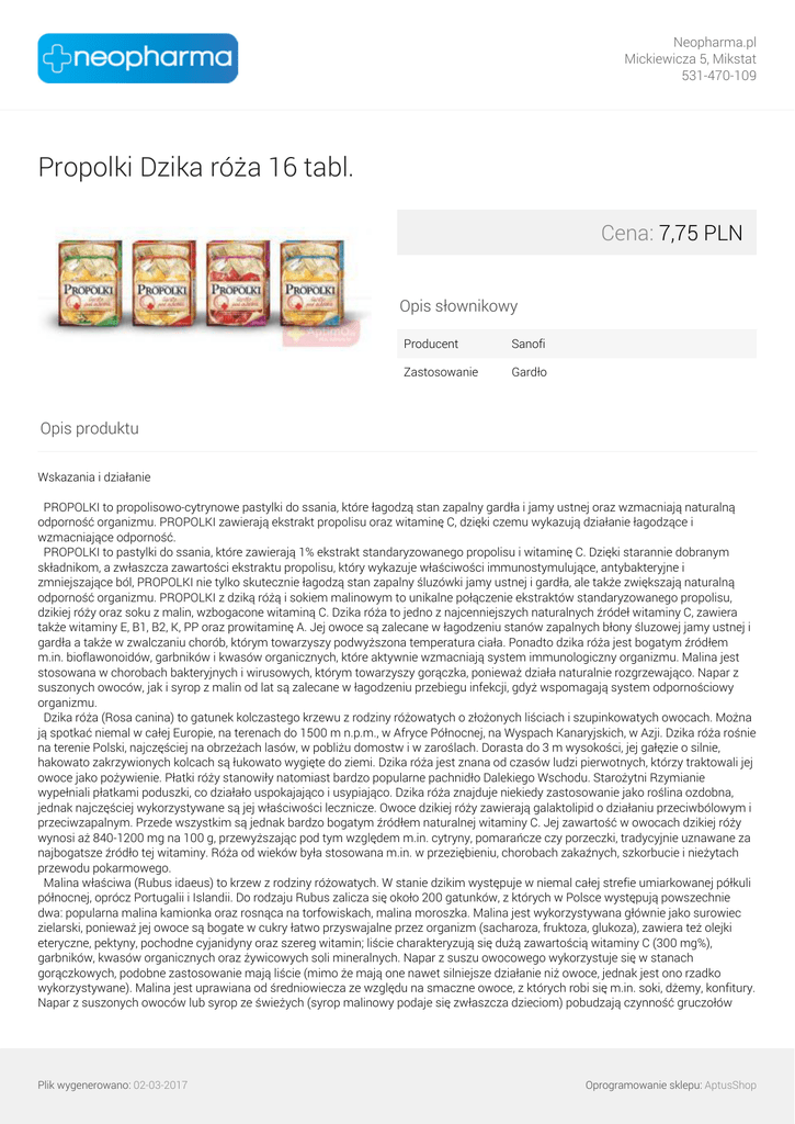 Neopharma.pl Mickiewicza 5, Mikstat 531-470-109 Propolki Dzika róża 16 tabl. Cena: 7,75 PLN Opis słownikowy Producent Sanofi Zastosowanie Gardło Opis produktu Wskazania i działanie PROPOLKI to propolisowo-cytrynowe pastylki do ssania, które łagodzą stan zapalny gardła i jamy ustnej oraz wzmacniają naturalną odporność organizmu. PROPOLKI zawierają ekstrakt propolisu oraz witaminę C, dzięki czemu wykazują działanie łagodzące i wzmacniające odporność. PROPOLKI to pastylki do ssania, które zawierają 1% ekstrakt standaryzowanego propolisu i witaminę C. Dzięki starannie dobranym składnikom, a zwłaszcza zawartości ekstraktu propolisu, który wykazuje właściwości immunostymulujące, antybakteryjne i zmniejszające ból, PROPOLKI nie tylko skutecznie łagodzą stan zapalny śluzówki jamy ustnej i gardła, ale także zwiększają naturalną odporność organizmu. PROPOLKI z dziką różą i sokiem malinowym to unikalne połączenie ekstraktów standaryzowanego propolisu, dzikiej róży oraz soku z malin, wzbogacone witaminą C. Dzika róża to jedno z najcenniejszych naturalnych źródeł witaminy C, zawiera także witaminy E, B1, B2, K, PP oraz prowitaminę A. Jej owoce są zalecane w łagodzeniu stanów zapalnych błony śluzowej jamy ustnej i gardła a także w zwalczaniu chorób, którym towarzyszy podwyższona temperatura ciała. Ponadto dzika róża jest bogatym źródłem m.in. bioflawonoidów, garbników i kwasów organicznych, które aktywnie wzmacniają system immunologiczny organizmu. Malina jest stosowana w chorobach bakteryjnych i wirusowych, którym towarzyszy gorączka, ponieważ działa naturalnie rozgrzewająco. Napar z suszonych owoców, jak i syrop z malin od lat są zalecane w łagodzeniu przebiegu infekcji, gdyż wspomagają system odpornościowy organizmu. Dzika róża (Rosa canina) to gatunek kolczastego krzewu z rodziny różowatych o złożonych liściach i szupinkowatych owocach. Można ją spotkać niemal w całej Europie, na terenach do 1500 m n.p.m., w Afryce Północnej, na Wyspach Kanaryjskich, w Azji. Dzika róża rośnie na terenie Polski, najczęściej na obrzeżach lasów, w pobliżu domostw i w zaroślach. Dorasta do 3 m wysokości, jej gałęzie o silnie, hakowato zakrzywionych kolcach są łukowato wygięte do ziemi. Dzika róża jest znana od czasów ludzi pierwotnych, którzy traktowali jej owoce jako pożywienie. Płatki róży stanowiły natomiast bardzo popularne pachnidło Dalekiego Wschodu. Starożytni Rzymianie wypełniali płatkami poduszki, co działało uspokajająco i usypiająco. Dzika róża znajduje niekiedy zastosowanie jako roślina ozdobna, jednak najczęściej wykorzystywane są jej właściwości lecznicze. Owoce dzikiej róży zawierają galaktolipid o działaniu przeciwbólowym i przeciwzapalnym. Przede wszystkim są jednak bardzo bogatym źródłem naturalnej witaminy C. Jej zawartość w owocach dzikiej róży wynosi aż 840-1200 mg na 100 g, przewyższając pod tym względem m.in. cytryny, pomarańcze czy porzeczki, tradycyjnie uznawane za najbogatsze źródło tej witaminy. Róża od wieków była stosowana m.in. w przeziębieniu, chorobach zakaźnych, szkorbucie i nieżytach przewodu pokarmowego. Malina właściwa (Rubus idaeus) to krzew z rodziny różowatych. W stanie dzikim występuje w niemal całej strefie umiarkowanej półkuli północnej, oprócz Portugalii i Islandii. Do rodzaju Rubus zalicza się około 200 gatunków, z których w Polsce występują powszechnie dwa: popularna malina kamionka oraz rosnąca na torfowiskach, malina moroszka. Malina jest wykorzystywana głównie jako surowiec zielarski, ponieważ jej owoce są bogate w cukry łatwo przyswajalne przez organizm (sacharoza, fruktoza, glukoza), zawiera też olejki eteryczne, pektyny, pochodne cyjanidyny oraz szereg witamin; liście charakteryzują się dużą zawartością witaminy C (300 mg%), garbników, kwasów organicznych oraz żywicowych soli mineralnych. Napar z suszu owocowego wykorzystuje się w stanach gorączkowych, podobne zastosowanie mają liście (mimo że mają one nawet silniejsze działanie niż owoce, jednak jest ono rzadko wykorzystywane). Malina jest uprawiana od średniowiecza ze względu na smaczne owoce, z których robi się m.in. soki, dżemy, konfitury. Napar z suszonych owoców lub syrop ze świeżych (syrop malinowy podaje się zwłaszcza dzieciom) pobudzają czynność gruczołów Plik wygenerowano: 02-03-2017 Oprogramowanie sklepu: AptusShop Neopharma.pl Mickiewicza 5, Mikstat 531-470-109 potowych i w stanach gorączkowych wywołują po pół godzinie (do godziny) obfite wydzielanie potu. Napary z malin działają ściągająco i wzmacniająco ogólnie, a jako dodatek do mieszanek herbacianych znakomicie je aromatyzują. Susz z liści malin stosuje się w postaci naparu przeciw biegunkom, przy zaburzeniach menstruacyjnych, przy wysypkach i egzemach oraz jako płukanka przy stanach zapalnych jamy ustnej i gardła. PROPOLKI z dziką różą i sokiem malinowym – pastylki, które łagodzą podrażnienia w obrębie jamy ustnej i gardła, zawierają ekstrakt standaryzowanego propolisu i witaminę C oraz naturalne wyciągi z dzikiej róży i malin. Plik wygenerowano: 02-03-2017 Powered by TCPDF (www.tcpdf.org) Oprogramowanie sklepu: AptusShop