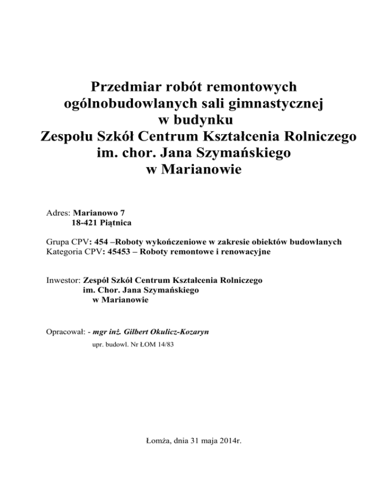 Przedmiar robót remontowych ogólnobudowlanych sali gimnastycznej w budynku Zespołu Szkół Centrum Kształcenia Rolniczego im. chor. Jana Szymańskiego w Marianowie Adres: Marianowo 7 18-421 Piątnica Grupa CPV: 454 –Roboty wykończeniowe w zakresie obiektów budowlanych Kategoria CPV: 45453 – Roboty remontowe i renowacyjne Inwestor: Zespół Szkół Centrum Kształcenia Rolniczego im. Chor. Jana Szymańskiego w Marianowie Opracował: - mgr inż. Gilbert Okulicz-Kozaryn upr. budowl. Nr ŁOM 14/83 Łomża, dnia 31 maja 2014r. Spis treści 1. Zakres robót budowlanych 2. Przedmiar robót Zakres opracowania W niniejszym kosztorysie zgodnie z uzgodnieniami z inwestorem, oszacowano poniższy zakres prac: 1. Demontaż istniejących drabinek i tablic do koszykówki; 2. Naprawa, szlifowanie, lakierowanie i ponowny montaż drabinek; 3. Demontaż metalowych osłon lamp oświetleniowych – 56 szt. 4. Naprawa (podspawanie) i malowanie konstrukcji tablic do koszykówki oraz siatkówki; 5. Zamurowanie i otynkowanie dwóch wnęk po grzejnikach, 6. Wymiana kratek wentylacyjnych – 8szt.; 7. Przetarcie i naprawa uszkodzonych tynków; 8. Wstawienie metalowych kątowników na narożach remontowanych ścian i ościeży; 9. Szpachlowanie ścian i sufitów; 10. Malowanie farbą zmywalną ścian i sufitów; 11. Malowanie wywietrzaków metalowych; 12. Cyklinowanie i lakierowanie parkietu lakierem o wysokiej wytrzymałości; 13. Malowanie linii wyznaczających boiska na podłodze. Uwagi: Prace budowlane remontowe nie wymagają uzyskania decyzji o pozwoleniu na budowę, niemniej muszą być one realizowane zgodnie z warunkami technicznymi wykonania i odbioru robót budowlanych, instrukcjami producentów materiałów oraz obowiązującymi przepisami. Zastosowane materiały muszą być dopuszczone do stosowania w budownictwie, a przed zakupem uzgodnione z inwestorem (jakość, producent, charakterystyczne dane techniczne). Remont będzie realizowany w czynnym obiekcie, dlatego też prace winny być prowadzone ze szczególnym uwzględnieniem zasad BHP, pod nadzorem osoby posiadającej uprawnienia do kierowania robotami budowlanymi. Przedmiar robót do poniższego kosztorysu inwestorskiego wykonany został w oparciu o pomiary z natury. Łomża 31 maja 2014r. Opracował: mgr inż. Gilbert Okulicz-Kozaryn Kosztorys robót remontowych sali gimnastycznej ZSCKR Tabela przedmiaru robót Nr Kod pozycji przedmiaru 1 2 Numer STWiOR B 3 Nazwa, opis i obliczenie ilości robót 4 J.m. Ilość j.m. 5 6 Dział nr 1. Roboty ogólnobudowlane [CPV: 45453000-7 Roboty remontowe i renowacyjne] Dział nr 1.1. Rozbiórki i wyburzenia [CPV: 45453000-7 Roboty remontowe i renowacyjne] 1 KNR 4-01 0354-0500 Bud 1.1 Wykucie z muru ościeżnic drewnianych o powierzchni ponad 2 m2 m2 Demontaż drzwi o pow. ponad 2 m2: 1,40*2,02*2 2 TZKNBK cz. XV 0405-3310 bud 1.1 Przygotowanie starej stolarki pod malowanie (oczyszczenie, rozmontowanie, zabezpieczenie itp.) 5,6560 m2 Demontaż drabinek i tablic do koszykówki, przygotowanie do renowacji i ponowny montaż: 17,0*3,00+1,10+(2,35*2+2,36+2,32+2,31+2,39+2,29+2,38)+1,80*1,05 *2 3 KNR 4-06 0115-0100 bud 1.1 Zdejmowanie śrub konstrukcyjnych o średnicy do 20 mm. Liczba zdejmowanych śrub na jednym stanowisku na wys.do 22 m-do 10 szt (analogia) 5,6560 74,6300 74,6300 szt Demontaż osłon opraw oświetleniowych w sali gimnastycznej: 56*2 112,0000 112,0000 Dział nr 1.2. Roboty remontowe pomieszczeń [CPV: 45453000-7 Roboty remontowe i renowacyjne] 4 KNR 4-01 0303-0200 bud 1.3 Uzupełnienie ścianek lub zamurowanie otworów w ściankach o grubości 1/2 cegły, cegłą budowlaną pełną na zaprawie cementowo-wapiennej m2 Zamurowanie wnęk i budowa nowych ścianek: 1,30*2,10*2 5 KNR 4-01 0711-0300 bud 1.4. Uzupełnienie tynków kat. III z zaprawy cementowo-wapiennej na ścianach z cegły lub pustaków ceramicznych, o powierzchni uzupełnienia ponad 2 m2 do 5 m2 5,4600 m2 Otynkowanie nowych ścianek: 1,30*2,10*2 6 KNR 4-01 0713-0100 bud 1.4. Przecieranie tynków z zeskrobaniem farby lub zdzieraniem tapet na ścianach 5,4600 5,4600 5,4600 m2 393,0265 Przecierka i naprawa starych tynków na ścianach: - sala gimnastyczna: 23,81*6,38+11,50*6,10*2+23,81*5,83-2,30*3,75*8+0,23*5,23*16+0,15 *(2,30*8+3,75*8*2) 7 KNR 4-01 0713-0200 bud 1.4. Przecieranie tynków z zeskrobaniem farby lub zdzieraniem tapet na stropach, biegach i spocznikach 393,0265 m2 Przecierka tynków sufitów: 279,18 8 KNR 2-02 0815-0400 bud 1.4. Gładź gipsowa na ścianach z elementów prefabrykowanych i betonów wylewanych - dwuwarstwowa 279,1800 m2 Szpachlowanie dwuwarstwowe ścian i sufitów: 393,0265 9 KNR 2-02 0815-0600 bud 1.4. Gładź gipsowa na sufitach z elementów prefabrykowanych i betonów wylewanych - dwuwarstwowa KNR AT-22 0104-0300 bud 1.4. Obsadzenie listew ochronnych w narożach w zaprawie klejowej cienkowarstwowej lub epoksydowej m2 KNR 2-02 1505-0300 bud. 1.6. Malowanie farbami emulsyjnymi powierzchni wewnętrznych; podłoży gipsowych - dwukrotne z gruntowaniem m KNR 2-02 1505-0400 bud. 1.6. Malowanie farbami emulsyjnymi powierzchni wewnętrznych; podłoży gipsowych; dodatek za każde dalsze malowanie Dodatek za trzecie malowanie sali gimnastycznej: 393,03 -1- 102,2400 102,2400 m2 Malowanie farbą lateksową ścian sali gimnastycznej: 393,03 11x 279,1800 279,1800 Montaż narożników tynkarskich: 5,24*16+2,30*8 11 393,0265 393,0265 Szpachlowanie dwukrotne sufitów: 279,18 10 279,1800 393,0300 393,0300 m2 393,0300 393,0300 1.2. Roboty remontowe pomieszczeń Nr Kod pozycji przedmiaru 1 2 12 KNR 2-02 1505-0300 Numer STWiOR B 3 Nazwa, opis i obliczenie ilości robót bud. 1.6. Malowanie farbami emulsyjnymi powierzchni wewnętrznych; podłoży gipsowych - dwukrotne z gruntowaniem 4 J.m. Ilość j.m. 5 6 m2 Malowanie ścian i sufitów farbą akrylową: 279,18 12x KNR 2-02 1505-0400 bud. 1.6. Malowanie farbami emulsyjnymi powierzchni wewnętrznych; podłoży gipsowych; dodatek za każde dalsze malowanie 279,1800 m2 Dodatek za 