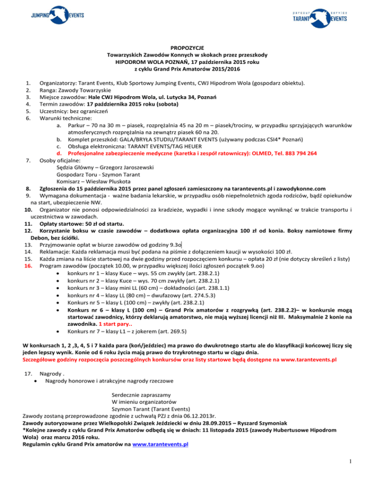 PROPOZYCJE Towarzyskich Zawodów Konnych w skokach przez przeszkody HIPODROM WOLA POZNAŃ, 17 października 2015 roku z cyklu Grand Prix Amatorów 2015/2016 1. 2. 3. 4. 5. 6. Organizatorzy: Tarant Events, Klub Sportowy Jumping Events, CWJ Hipodrom Wola (gospodarz obiektu). Ranga: Zawody Towarzyskie Miejsce zawodów: Hale CWJ Hipodrom Wola, ul. Lutycka 34, Poznań Termin zawodów: 17 października 2015 roku (sobota) Uczestnicy: bez ograniczeń Warunki techniczne: a. Parkur – 70 na 30 m – piasek, rozprężalnia 45 na 20 m – piasek/trociny, w przypadku sprzyjających warunków atmosferycznych rozprężalnia na zewnątrz piasek 60 na 20. b. Komplet przeszkód: GALA/BRYŁA STUDIU/TARANT EVENTS (używany podczas CSI4* Poznań) c. Obsługa elektroniczna: TARANT EVENTS/TAG HEUER d. Profesjonalne zabezpieczenie medyczne (karetka i zespół ratowniczy): OLMED, Tel. 883 794 264 7. Osoby oficjalne: Sędzia Główny – Grzegorz Jaroszewski Gospodarz Toru - Szymon Tarant Komisarz – Wiesław Pluskota 8. Zgłoszenia do 15 października 2015 przez panel zgłoszeń zamieszczony na tarantevents.pl i zawodykonne.com 9. Wymagana dokumentacja - ważne badania lekarskie, w przypadku osób niepełnoletnich zgoda rodziców, bądź opiekunów na start, ubezpieczenie NW. 10. Organizator nie ponosi odpowiedzialności za kradzieże, wypadki i inne szkody mogące wyniknąć w trakcie transportu i uczestnictwa w zawodach. 11. Opłaty startowe: 50 zł od startu. 12. Korzystanie boksu w czasie zawodów – dodatkowa opłata organizacyjna 100 zł od konia. Boksy namiotowe firmy Debon, bez ściółki. 13. Przyjmowanie opłat w biurze zawodów od godziny 9.3o 14. Reklamacje: Każda reklamacja musi być podana na piśmie z dołączeniem kaucji w wysokości 100 zł. 15. Każda zmiana na liście startowej na dwie godziny przed rozpoczęciem konkursu – opłata 20 zł (nie dotyczy skreśleń z listy) 16. Program zawodów (początek 10.00, w przypadku większej ilości zgłoszeń początek 9.oo) konkurs nr 1 – klasy Kuce – wys. 55 cm zwykły (art. 238.2.1) konkurs nr 2 – klasy Kuce – wys. 70 cm zwykły (art. 238.2.1) konkurs nr 3 – klasy mini LL (60 cm) – dokładności (art. 238.1.1) konkurs nr 4 – klasy LL (80 cm) – dwufazowy (art. 274.5.3) Konkurs nr 5 – klasy L (100 cm) – zwykły (art. 238.2.1) Konkurs nr 6 – klasy L (100 cm) – Grand Prix amatorów z rozgrywką (art. 238.2.2)– w konkursie mogą startować zawodnicy, którzy deklarują amatorstwo, nie mają wyższej licencji niż III. Maksymalnie 2 konie na zawodnika. 1 start pary.. Konkurs nr 7 – klasy L1 – z jokerem (art. 269.5) . W konkursach 1, 2 ,3, 4, 5 i 7 każda para (koń/jeździec) ma prawo do dwukrotnego startu ale do klasyfikacji końcowej liczy się jeden lepszy wynik. Konie od 6 roku życia mają prawo do trzykrotnego startu w ciągu dnia. Szczegółowe godziny rozpoczęcia poszczególnych konkursów oraz listy startowe będą dostępne na www.tarantevents.pl 17. Nagrody . Nagrody honorowe i atrakcyjne nagrody rzeczowe Serdecznie zapraszamy W imieniu organizatorów Szymon Tarant (Tarant Events) Zawody zostaną przeprowadzone zgodnie z uchwałą PZJ z dnia 06.12.2013r. Zawody autoryzowane przez Wielkopolski Związek Jeździecki w dniu 28.09.2015 – Ryszard Szymoniak *Kolejne zawody z cyklu Grand Prix Amatorów odbędą się w dniach: 11 listopada 2015 (zawody Hubertusowe Hipodrom Wola) oraz marcu 2016 roku. Regulamin cyklu Grand Prix amatorów na www.tarantevents.pl 1 KODEKS POSTĘPOWANIA Z KONIEM I. Na wszystkich etapach treningu i przygotowań konia do startu w zawodach, dobro konia musi stać ponad wszelkimi innymi wymaganiami. Dotyczy to stałej opieki, metod treningu, starannego obrządku, kucia i transportu. II. Konie i jeźdźcy muszą być wytrenowani, kompetentni i zdrowi zanim wezmą udział w zawodach. Odnosi się to także do podawania leków i środków medycznych, zabiegów chirurgicznych zagrażających dobru konia lub ciąży klaczy, oraz do przypadków nadużywania pomocy. III. Zawody nie mogą zagrażać dobru konia. Wymaga to zwrócenia szczególnej uwagi na teren zawodów, powierzchnię podłoża, pogodę, warunki stajenne, kondycję koni i ich bezpieczeństwo także podczas podróży powrotnej z zawodów. IV. Należy dołożyć wszelkich starań, aby zapewnić koniom staranną opiekę po zakończeniu zawodów, a także humanitarne traktowanie po zakończeniu kariery sportowej. Dotyczy to właściwej opieki weterynaryjnej obrażeń odniesionych na zawodach, spokojnej starości, ewentualnie eutanazji. V. PZJ zachęca wszystkie osoby działające w sporcie jeździeckim do stałego podnoszenia swojej wiedzy oraz umiejętności dotyczących wszelkich aspektów współpracy z koniem. 2