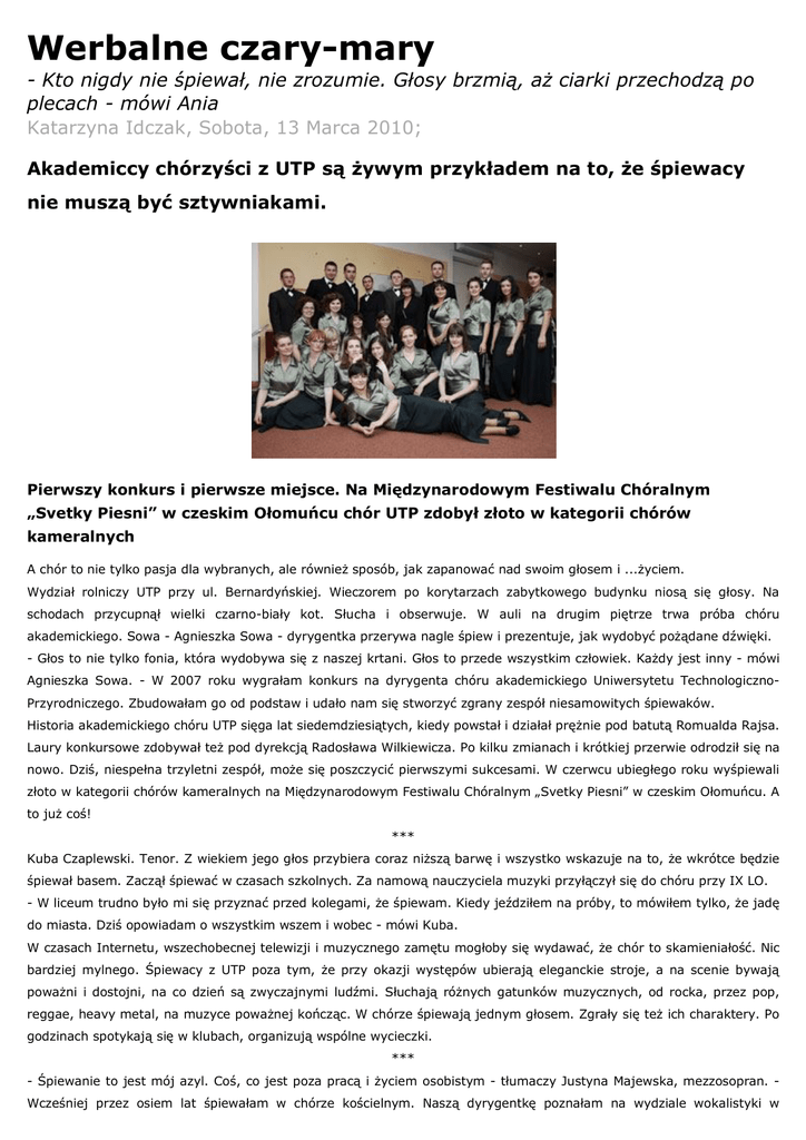 Werbalne czary-mary - Kto nigdy nie śpiewał, nie zrozumie. Głosy brzmią, aż ciarki przechodzą po plecach - mówi Ania Katarzyna Idczak, Sobota, 13 Marca 2010; Akademiccy chórzyści z UTP są żywym przykładem na to, że śpiewacy nie muszą być sztywniakami. Pierwszy konkurs i pierwsze miejsce. Na Międzynarodowym Festiwalu Chóralnym „Svetky Piesni” w czeskim Ołomuńcu chór UTP zdobył złoto w kategorii chórów kameralnych A chór to nie tylko pasja dla wybranych, ale również sposób, jak zapanować nad swoim głosem i ...życiem. Wydział rolniczy UTP przy ul. Bernardyńskiej. Wieczorem po korytarzach zabytkowego budynku niosą się głosy. Na schodach przycupnął wielki czarno-biały kot. Słucha i obserwuje. W auli na drugim piętrze trwa próba chóru akademickiego. Sowa - Agnieszka Sowa - dyrygentka przerywa nagle śpiew i prezentuje, jak wydobyć pożądane dźwięki. - Głos to nie tylko fonia, która wydobywa się z naszej krtani. Głos to przede wszystkim człowiek. Każdy jest inny - mówi Agnieszka Sowa. - W 2007 roku wygrałam konkurs na dyrygenta chóru akademickiego Uniwersytetu TechnologicznoPrzyrodniczego. Zbudowałam go od podstaw i udało nam się stworzyć zgrany zespół niesamowitych śpiewaków. Historia akademickiego chóru UTP sięga lat siedemdziesiątych, kiedy powstał i działał prężnie pod batutą Romualda Rajsa. Laury konkursowe zdobywał też pod dyrekcją Radosława Wilkiewicza. Po kilku zmianach i krótkiej przerwie odrodził się na nowo. Dziś, niespełna trzyletni zespół, może się poszczycić pierwszymi sukcesami. W czerwcu ubiegłego roku wyśpiewali złoto w kategorii chórów kameralnych na Międzynarodowym Festiwalu Chóralnym „Svetky Piesni” w czeskim Ołomuńcu. A to już coś! *** Kuba Czaplewski. Tenor. Z wiekiem jego głos przybiera coraz niższą barwę i wszystko wskazuje na to, że wkrótce będzie śpiewał basem. Zaczął śpiewać w czasach szkolnych. Za namową nauczyciela muzyki przyłączył się do chóru przy IX LO. - W liceum trudno było mi się przyznać przed kolegami, że śpiewam. Kiedy jeździłem na próby, to mówiłem tylko, że jadę do miasta. Dziś opowiadam o wszystkim wszem i wobec - mówi Kuba. W czasach Internetu, wszechobecnej telewizji i muzycznego zamętu mogłoby się wydawać, że chór to skamieniałość. Nic bardziej mylnego. Śpiewacy z UTP poza tym, że przy okazji występów ubierają eleganckie stroje, a na scenie bywają poważni i dostojni, na co dzień są zwyczajnymi ludźmi. Słuchają różnych gatunków muzycznych, od rocka, przez pop, reggae, heavy metal, na muzyce poważnej kończąc. W chórze śpiewają jednym głosem. Zgrały się też ich charaktery. Po godzinach spotykają się w klubach, organizują wspólne wycieczki. *** - Śpiewanie to jest mój azyl. Coś, co jest poza pracą i życiem osobistym - tłumaczy Justyna Majewska, mezzosopran. Wcześniej przez osiem lat śpiewałam w chórze kościelnym. Naszą dyrygentkę poznałam na wydziale wokalistyki w bydgoskiej szkole muzycznej. Z chórem UTP jestem związana od samego początku. Cały czas pracuję nad barwą, rozwijam swoje umiejętności. Lubię też gospel. Kiedy mogę, wyjeżdżam na warsztaty i śpiewam, ile dusza zapragnie. *** Współcześnie trudno jest pozyskać nowych śpiewaków. Na wagę złota są męskie basy. Ale jak się okazuje, każdy głos można wyćwiczyć. Ba! Nawet jest to wskazane. - Ludzie nie wiedzą, jak ważne jest, aby zadbać o struny głosowe. Na przykład niewłaściwy oddech ściera je, przegrzewa. Wystarczy łyk chłodnego powietrza i choroba gotowa - tłumaczy Agnieszka Sowa. - A można przecież nad tym wszystkim zapanować. To takie pozawerbalne czary-mary. Dlatego przyjmujemy wszystkich chętnych i gotowych do ciężkiej pracy. Wystarczy mieć odwagę, charyzmę i słuch muzyczny. Umiejętność wydobywania właściwych tonów przydaje się nawet w karierze zawodowej. Wiedzą o tym specjaliści od public relations, dziennikarze, nauczyciele i w zasadzie każdy, w którego zawód jest wpisany kontakt z ludźmi. *** Marta Radomska. Sopran. Do chóru UTP wstąpiła na drugim roku studiów. I chociaż pożegnała się już z wydziałem inżynierii środowiska i pracuje dziś w biurze projektowym, to w każdy poniedziałek i czwartek przychodzi na próby. - Kto nigdy nie śpiewał, nie zrozumie, co się wtedy czuje - opowiada Marta Radomska. - Kiedy stojąc na scenie widzimy tylko ręce dyrygentki i cały świat ogranicza się tylko do tej konkretnej chwili. Głosy brzmią, aż przechodzą ciarki po plecach. *** Chórzyści z UTP z dumą mówią o konkursowych sukcesach. Z uśmiechem na twarzy opowiadają o wzajemnych stosunkach i przyjaźni, jaka zrodziła się między nimi. Ale jest jeszcze jedna historia, która chyba najlepiej świadczy o ich wartości. - Od kilku lat Towarzystwo Przyjaciół Dolnej Wisły organizuje świąteczną kwestę i zaprasza nas do miejscowości Włóki, aby wspólnie z mieszkańcami pośpiewać kolędy. Ledwo mieścimy się w tamtejszym kościółku. Jest jak łupinka. Ale panuje tam niepowtarzalna atmosfera. W tym roku proboszcz parafii myślał, aby zrezygnować z naszego chóru i zaprosił śpiewaków z bydgoskiej fary. Mieszkańcom ten pomysł bardzo się nie spodobał i postarali się o nasz przyjazd - opowiada Marta Radomska. - To lepsze wyróżnienie niż pierwsze miejsce w jakimkolwiek konkursie. Chcesz spróbować swoich sił w chórze? Spodobał Ci się pomysł, aby zapanować nad swoim głosem? Możesz przyłączyć się do chóru UTP. Szczegółowe informacje i kontakt dostępne na stronie : www.chorutp.wordpress.com