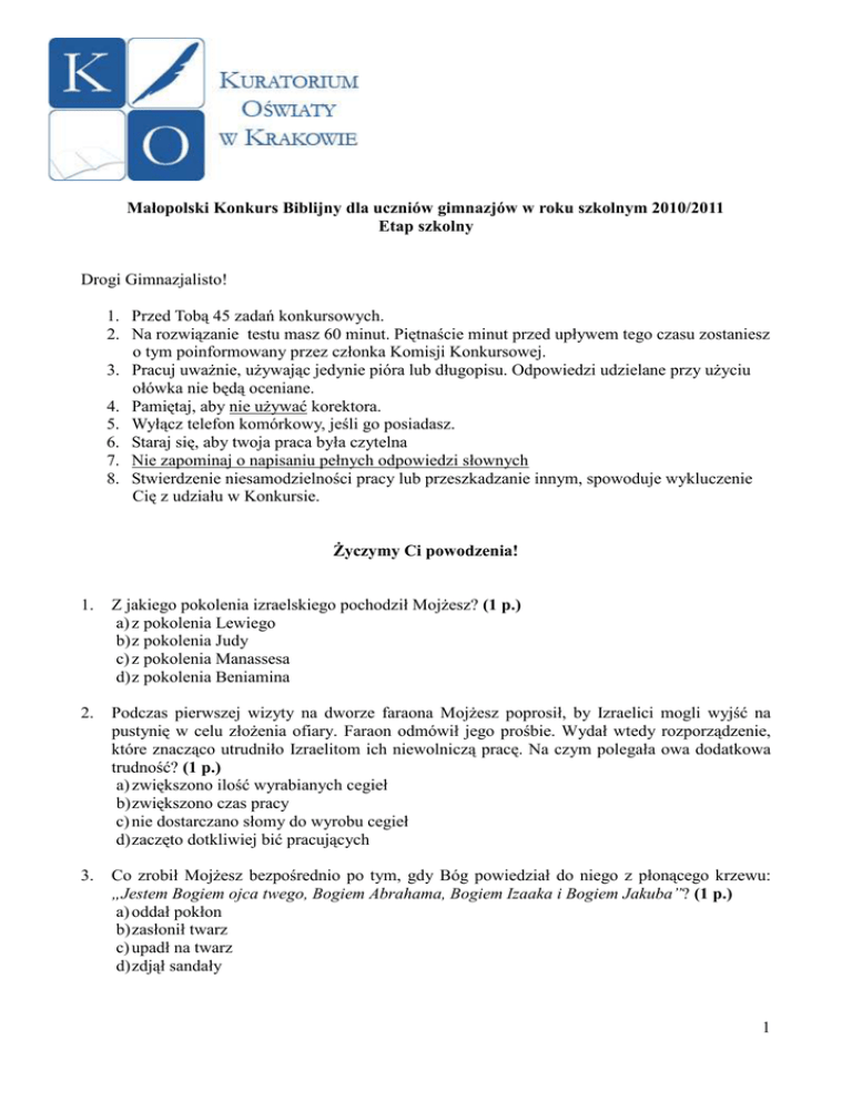 Małopolski Konkurs Biblijny dla uczniów gimnazjów w roku szkolnym 2010/2011 Etap szkolny Drogi Gimnazjalisto! 1. Przed Tobą 45 zadań konkursowych. 2. Na rozwiązanie testu masz 60 minut. Piętnaście minut przed upływem tego czasu zostaniesz o tym poinformowany przez członka Komisji Konkursowej. 3. Pracuj uwaŜnie, uŜywając jedynie pióra lub długopisu. Odpowiedzi udzielane przy uŜyciu ołówka nie będą oceniane. 4. Pamiętaj, aby nie uŜywać korektora. 5. Wyłącz telefon komórkowy, jeśli go posiadasz. 6. Staraj się, aby twoja praca była czytelna 7. Nie zapominaj o napisaniu pełnych odpowiedzi słownych 8. Stwierdzenie niesamodzielności pracy lub przeszkadzanie innym, spowoduje wykluczenie Cię z udziału w Konkursie. śyczymy Ci powodzenia! 1. Z jakiego pokolenia izraelskiego pochodził MojŜesz? (1 p.) a) z pokolenia Lewiego b) z pokolenia Judy c) z pokolenia Manassesa d) z pokolenia Beniamina 2. Podczas pierwszej wizyty na dworze faraona MojŜesz poprosił, by Izraelici mogli wyjść na pustynię w celu złoŜenia ofiary. Faraon odmówił jego prośbie. Wydał wtedy rozporządzenie, które znacząco utrudniło Izraelitom ich niewolniczą pracę. Na czym polegała owa dodatkowa trudność? (1 p.) a) zwiększono ilość wyrabianych cegieł b) zwiększono czas pracy c) nie dostarczano słomy do wyrobu cegieł d) zaczęto dotkliwiej bić pracujących 3. Co zrobił MojŜesz bezpośrednio po tym, gdy Bóg powiedział do niego z płonącego krzewu: „Jestem Bogiem ojca twego, Bogiem Abrahama, Bogiem Izaaka i Bogiem Jakuba”? (1 p.) a) oddał pokłon b) zasłonił twarz c) upadł na twarz d) zdjął sandały 1 4. Kim był teść MojŜesza, Jetro? (1 p.) a) pasterzem b) rolnikiem c) prorokiem d) kapłanem 5. „Weźcie pełnymi garściami sadzy z pieca i MojŜesz niech rzuci ją ku niebu na oczach faraona…” – powiedział Bóg do MojŜesza i Aarona. Jaką plagę mieli wywołać MojŜesz i Aaron tym znakiem? (1 p.) a) ciemności b) muchy c) szarańczę d) wrzody i pryszcze 6. Bóg szedł w dzień przed Izraelitami wychodzącymi z Egiptu pod postacią znaku. Jaki to był znak? (1 p.) a) słup obłoku b) chmura dymu c) słup ognia d) chmura światła 7. W którym rozdziale Księgi Wyjścia znajduje się opis przejścia Izraelitów pod wodzą MojŜesza przez Morze Czerwone? (1 p.) a) 14 b) 15 c) 16 d) 17 8. Z jakiego kierunku wiał wiatr, którym Bóg cofnął wody Morza Czerwonego? (1 p.) a) ze wschodu b) z zachodu c) z północy d) z południa 9. Bóg zsyłał Izraelitom w drodze z Egiptu do Ziemi Obiecanej mannę i przepiórki jako pokarm. W jakich porach dnia Izraelici otrzymywali ten pokarm? (1 p.) a) przepiórki rano, mannę wieczorem b) mannę rano, przepiórki wieczorem c) przepiórki i mannę wieczorem d) przepiórki i mannę rano 10. Podczas walki w Refidim MojŜesz modlił się o zwycięstwo Izraelitów. Znakiem tej modlitwy były jego uniesione ręce. Z jakim narodem walczyli wtedy Izraelici? (1 p.) a) z Madianitami b) z Jebusytami c) z Amalekitami d) z Amorytami 2 11. Po słowach Boga zawierających dekalog tekst Księgi Wyjścia przedstawia pozostałe prawa przekazane przez Boga. Które, spośród wymienionych niŜej praw, jest opisane jako pierwsze po dekalogu? (1 p.) a) prawo rodzinne b) prawo moralne c) prawo o ołtarzu d) prawo rzeczowe 12. Ołtarz całopalenia w przybytku miał powierzchnię w kształcie kwadratu. Jakiej długości był jego bok? (1 p.) a) 2 łokcie b) 3 łokcie c) 4 łokcie d) 5 łokci 13. Jakie zwierzę naleŜało składać na ofiarę ustawiczną w przybytku, tzn. rano i o zmierzchu, według polecenia Boga? (1 p.) a) jagnię b) cielę c) baranka d) wołu 14. Bóg polecił MojŜeszowi sporządzić święty olej do namaszczenia przybytku, świętych przedmiotów i kapłanów. Bóg podał dokładny przepis na ten olej, podobnego nie wolno było nikomu sporządzać. Do jego przyrządzenia naleŜało uŜyć jeden hin oleju z oliwek. Jakiej ilości litrów odpowiada jeden hin, hebrajska miara objętości płynów? (1 p.) a) ok. 5 litrom b) ok. 7 litrom c) ok. 10 litrom d) ok. 12 litrom 15. Po powtórnym spotkaniu MojŜesza z Bogiem na górze Synaj, jego skóra miała niezwykły wygląd. Jak wyglądała wtedy skóra na twarzy MojŜesza według tekstu Księgi Wyjścia? (1 p.) a) błyszczała b) promieniała c) jaśniała d) świeciła 16. Nazwa Księgi Wyjścia wywodzi się z tytułu, jaki nosi ona w Septuagincie (greckim przekładzie Starego Testamentu) – Exodos tzn. „wyjście”. Tradycja hebrajska określa ją – podobnie jak pozostałe części Pięcioksięgu – pierwszym słowem księgi, które brzmi: ’elle szemôt. Podaj pełne tłumaczenie na język polski tego hebrajskiego zwrotu. (2 p.) ……………………………………………………………………………………………… 17. Ilu Izraelitów, według Księgi Wyjścia, przybyło wraz z Jakubem do Egiptu? (2 p.) ……………………………………………………………………………………………… 3 18. Izraelici pracowali przymusowo w Egipcie przy budowie dwóch miast. Jedno z nich to Ramses. Podaj w dokładnym brzmieniu nazwę drugiego miasta. (2 p.) ……………………………………………………………………………………………… 19. Ile czasu po urodzeniu MojŜesza ukrywała go jego matka? (2 p.) ……………………………………………………………………………………………… 20. Z jakiego materiału była wykonana skrzynka, w którą włoŜyła MojŜesza jego matka i pozostawiła w sitowiu na brzegu rzeki? (2 p.) ……………………………………………………………………………………………… 21. Podaj nazwę kraju, do którego uciekł MojŜesz przed faraonem po zabiciu Egipcjanina? (2 p.) ……………………………………………………………………………………………… 22. Jak miała na imię Ŝona MojŜesza, córka Je