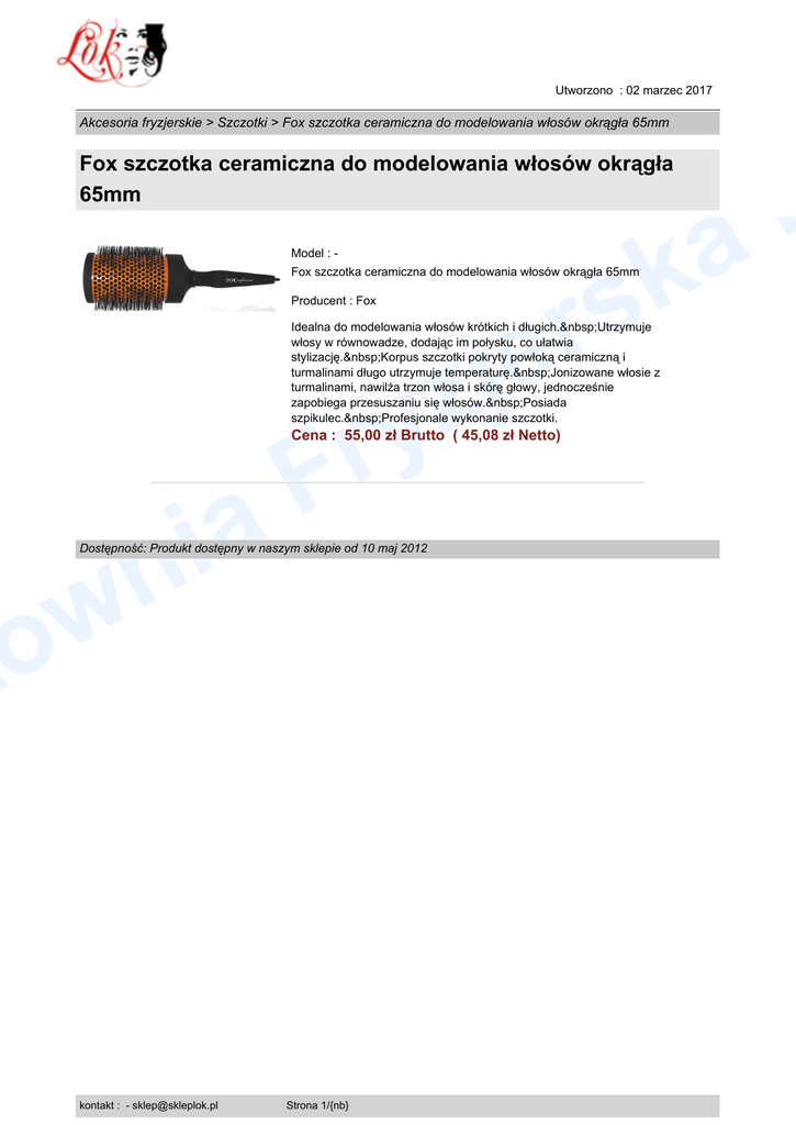 Utworzono : 02 marzec 2017 Akcesoria fryzjerskie > Szczotki > Fox szczotka ceramiczna do modelowania włosów okrągła 65mm L a Fox szczotka ceramiczna do modelowania włosów okrągła 65mm k s r Model : - Fox szczotka ceramiczna do modelowania włosów okrągła 65mm Producent : Fox e j z Idealna do modelowania włosów krótkich i długich. Utrzymuje włosy w równowadze, dodając im połysku, co ułatwia stylizację. Korpus szczotki pokryty powłoką ceramiczną i turmalinami długo utrzymuje temperaturę. Jonizowane włosie z turmalinami, nawilża trzon włosa i skórę głowy, jednocześnie zapobiega przesuszaniu się włosów. Posiada szpikulec. Profesjonale wykonanie szczotki. y r F Cena : 55,00 zł Brutto ( 45,08 zł Netto) a i n w to Dostępność: Produkt dostępny w naszym sklepie od 10 maj 2012 kontakt : - [email protected] Strona 1/{nb}