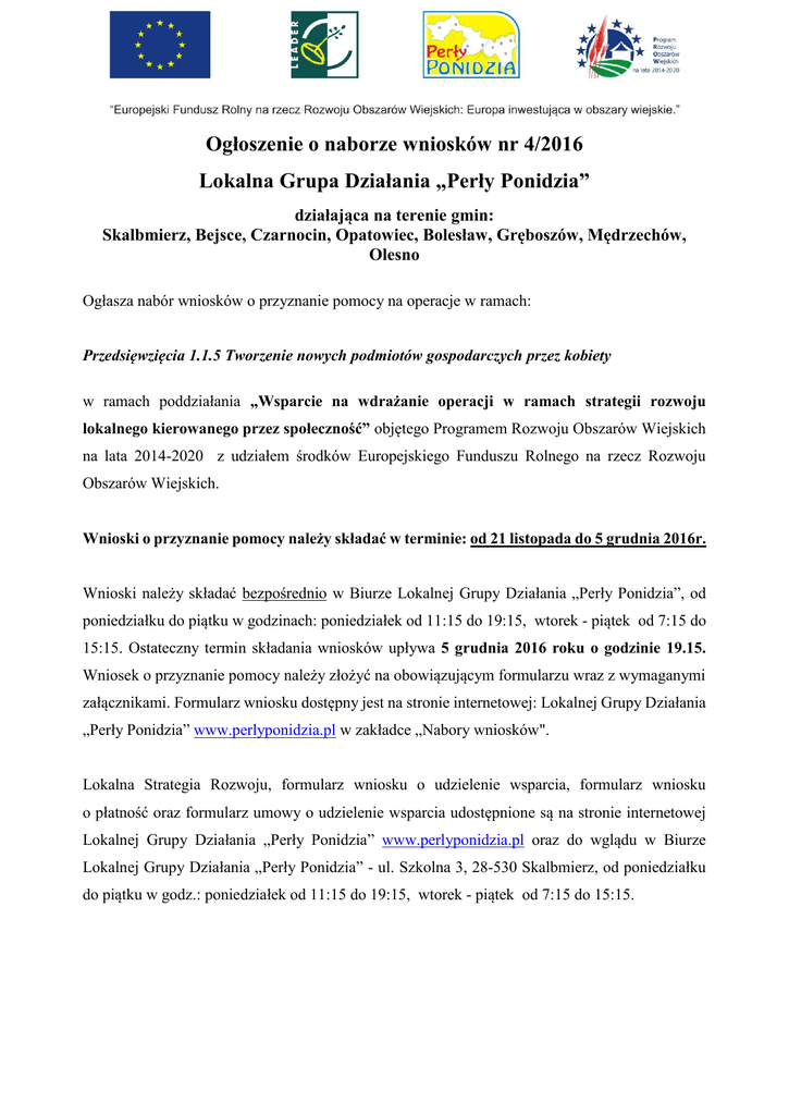 Ogłoszenie o naborze wniosków nr 4/2016 Lokalna Grupa Działania „Perły Ponidzia” działająca na terenie gmin: Skalbmierz, Bejsce, Czarnocin, Opatowiec, Bolesław, Gręboszów, Mędrzechów, Olesno Ogłasza nabór wniosków o przyznanie pomocy na operacje w ramach: Przedsięwzięcia 1.1.5 Tworzenie nowych podmiotów gospodarczych przez kobiety w ramach poddziałania „Wsparcie na wdrażanie operacji w ramach strategii rozwoju lokalnego kierowanego przez społeczność” objętego Programem Rozwoju Obszarów Wiejskich na lata 2014-2020 z udziałem środków Europejskiego Funduszu Rolnego na rzecz Rozwoju Obszarów Wiejskich. Wnioski o przyznanie pomocy należy składać w terminie: od 21 listopada do 5 grudnia 2016r. Wnioski należy składać bezpośrednio w Biurze Lokalnej Grupy Działania „Perły Ponidzia”, od poniedziałku do piątku w godzinach: poniedziałek od 11:15 do 19:15, wtorek - piątek od 7:15 do 15:15. Ostateczny termin składania wniosków upływa 5 grudnia 2016 roku o godzinie 19.15. Wniosek o przyznanie pomocy należy złożyć na obowiązującym formularzu wraz z wymaganymi załącznikami. Formularz wniosku dostępny jest na stronie internetowej: Lokalnej Grupy Działania „Perły Ponidzia” www.perlyponidzia.pl w zakładce „Nabory wniosków". Lokalna Strategia Rozwoju, formularz wniosku o udzielenie wsparcia, formularz wniosku o płatność oraz formularz umowy o udzielenie wsparcia udostępnione są na stronie internetowej Lokalnej Grupy Działania „Perły Ponidzia” www.perlyponidzia.pl oraz do wglądu w Biurze Lokalnej Grupy Działania „Perły Ponidzia” - ul. Szkolna 3, 28-530 Skalbmierz, od poniedziałku do piątku w godz.: poniedziałek od 11:15 do 19:15, wtorek - piątek od 7:15 do 15:15. Wysokość dostępnych środków na operacje w ramach naboru z przedsięwzięcia 1.1.5 Tworzenie nowych podmiotów gospodarczych przez kobiety wynosi 800 000 złotych. O wsparcie mogą się ubiegać osoby fizyczne – kobiety nieprowadzące działalności gospodarczej - spełniające warunki określone w Rozporządzeniu Ministra Rolnictwa i Rozwoju Wsi z dnia 24 września 2015 r. w sprawie szczegółowych warunków i trybu przyznawania pomocy finansowej w ramach poddziałania „Wsparcie na wdrażanie operacji w ramach strategii rozwoju lokalnego kierowanego przez społeczność” objętego Programem Rozwoju Obszarów Wiejskich na lata 2014 – 2020 (Dz. U. poz. 1570 ze zm.). Formą wsparcia jest ryczałt - premia. Wysokość pomocy na jedną operację wynosi 80 000 złotych. Zakres tematyczny operacji - w ramach naboru wsparciem objęte będą operacje w ramach zakresu rozwój przedsiębiorczości na obszarze wiejskim objętym strategią rozwoju lokalnego kierowanego przez społeczność przez podejmowanie działalności gospodarczej, w tym podnoszenie kompetencji osób realizujących operacje w tym zakresie. Kryteria wyboru operacji Cel Szczegółowy nr 1.1 Wsparcie rozwoju gospodarczego obszaru Przedsięwzięcie Tworzenie nowych podmiotów gospodarczych przez kobiety nr 1.1.5 Kryteria dla przedsięwzięcia Liczba punktów1 1 Udział procentowy wnioskowanej kwoty wsparcia w wielkości środków przeznaczonych na konkurs jest równy lub mniejszy od udziału procentowego wskaźnika produktu osiąganego przez operację w stosunku do wskaźnika zakładanego do osiągnięcia w ramach konkursu 0 lub 4 2 Udział procentowy wnioskowanej kwoty wsparcia w wielkości środków przeznaczonych na konkurs jest równy lub mniejszy od udziału procentowego osiąganego wskaźnika rezultatu (bezpośrednio wynikającego ze wskaźnika produktu) przez operację w stosunku do wskaźnika rezultatu zakładanego do osiągnięcia w ramach konkursu 0 lub 4 Lp. Definicja / wyjaśnienie kryterium (wnioskowana kwota wsparcia / środki na konkurs) x 100% ≤ (wielkość wskaźnika produktu operacji / wielkość wskaźnika dla konkursu) x 100% (wnioskowana kwota wsparcia / środki na konkurs) x 100% ≤ (wielkość wskaźnika rezultatu operacji / wielkość wskaźnika dla konkursu) x 100% 3 Operacja zakłada rozwiązania innowacyjne 0 lub 4 4 Operacja zakłada działania mające wpływ na ochronę środowiska i/lub przeciwdziałające zmianom klimatu 0 lub 3 5 6 W operacji przewidziano środki na działania informujące o przyznaniu wsparcia przez LGD w ramach LSR Wnioskodawca posiada kwalifikacje zgodne z zakresem planowanej operacji 0 lub 2 0 lub 2 7 Wnioskodawca podejmie działalność w branży kluczowej dla rozwoju obszaru LSR zgodnie z nr sekcji PKD wskazanym w LSR 0 lub 4 8 Wnioskodawca na dzień złożenia wniosku ma miejsce zamieszkania na obszarze LSR od co najmniej 12 miesięcy 0 lub 2 9 Operacja zakłada utworzenie więcej niż 1 miejsca pracy 0 lub 4 10 Wnioskodawca korzystał z doradztwa prowadzonego przez pracowników LGD dotyczącego danego Konkursu 0 lub 3 11 W budżecie operacji zaplanowano min. 50% środków na działania w miejscowości zamieszkałej przez nie więcej niż 5 000 mieszkańców (dane GUS wg stanu na dzień 31.12.2013 r.). 0 lub 4 Innowacyjność w skali co najmniej 1 gminy, z wykorzystaniem zasobów zdefiniowanych na obszarze. Innowacyjność może mieć charakter produktowy, procesowy, usługowy bądź technologiczny. Na podstawie wniosku o przyznanie pomocy, biznesplanu i oświadczenia Wnioskodawcy oraz przedstawionych dokumentów (np. źródła pisemne, literatura, raporty, analizy) Jako działania spełniające kryterium należy uznać projekty wykorzystujące odnawialne źródła energii, wpływające na zmniejszenie niskiej emisji lub działania edukacyjne w zakresie propagowania ochrony środowiska. Na podstawie wniosku o przyznanie pomocy, biznesplanu oraz przedstawionych dokumentów (np. źródła pisemne, literatura, raporty, analizy) Na podstawie wniosku o przyznanie pomocy i biznesplanu Na podstawie przedstawionych dokumentów Branże wskazane według sekcji PKD 2007 – Usługi związane z zakwaterowaniem i usługami gastronomicznymi (I