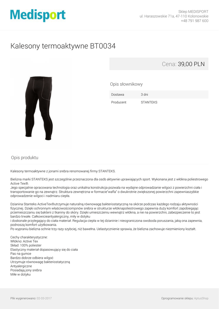 Sklep MEDISPORT ul. Haraszowskie 71a, 47-110 Kolonowskie +48 791 987 600 Kalesony termoaktywne BT0034 Cena: 39,00 PLN Opis słownikowy Dostawa 3 dni Producent STANTEKS Opis produktu Kalesony termoaktywne z jonami srebra renomowanej firmy STANTEKS. Bielizna marki STANTEKS jest szczególnie przeznaczona dla osób aktywnie uprawiających sport. Wykonana jest z włókna poliestrowego Active Tex®. Jego specjalnie opracowana technologia oraz unikalna konstrukcja pozwala na wydajne odprowadzanie wilgoci z powierzchni ciała i transportowanie go na zewnątrz. Struktura zewnętrzna w formacie"wafla" o dwukrotnie zwiększonej powierzchni zapewniaszybkie odprowadzenie wilgoci i nadmiaru ciepła. Dzianina Stanteks ActiveTex®utrzymuje naturalną równowagę bakteriostatyczną na skórze podczas każdego rodzaju aktywności fizycznej. Dzięki ochronnym właściwościomjonów srebra w strukturze włóknapoliestrowego zapewnia duży komfort zapobiegając przemieszczaniu się bakterii z tkaniny do skóry. Dzięki umieszczeniu wewnątrz włókna, a nie na powierzchni, zabezpieczenie to jest bardzo trwałe. Całkowicieantyalergiczny, miły w dotyku i doskonale przylegający do ciała materiał. Regulacja ciepła w tej dzianinie i nieograniczona swoboda poruszania, jaką ona zapewnia, podnoszą komfort użytkowania. Po wypraniu bielizna schnie trzy razy szybciej, niż bawełna. Uelastycznienie sprawia, że bielizna zachowuje niezmieniony kształt. Cechy charakterystyczne: Włókno: Active Tex Skład: 100% poliester Elastyczny materiał dopasowujący się do ciała Pas na gumce Bardzo dobrze odbiera wilgoć Utrzymuje równowagę bakteriostatyczną Antyalergiczne Posiadają jony srebra Miłe w dotyku Plik wygenerowano: 02-03-2017 Oprogramowanie sklepu: AptusShop Sklep MEDISPORT ul. Haraszowskie 71a, 47-110 Kolonowskie +48 791 987 600 Szybkoschnące Nie ograniczają ruchów Zalety Materiał 100% polyester Activ Tex® Atesty, certyfikaty, wyróżnienia: laureat konkursu "Najlepsze w Polsce", wrzesień 2009r. świadectwo jakości dzianiny, certyfikat na barwienie test antybakteryjny Dostępne rozmiary: S, M, XL, XXL Parametry Rozmiar S, M, XL, XXL Galeria Plik wygenerowano: 02-03-2017 Powered by TCPDF (www.tcpdf.org) Oprogramowanie sklepu: AptusShop