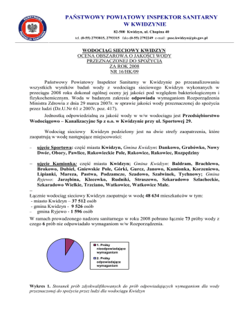 PAŃSTWOWY POWIATOWY INSPEKTOR SANITARNY W KWIDZYNIE 82-500 Kwidzyn, ul. Chopina 40 tel. (0-55) 2793815, 2793315 faks (0-55) 2792249 e-mail : [email protected] WODOCIĄG SIECIOWY KWIDZYN OCENA OBSZAROWA O JAKOŚCI WODY PRZEZNACZONEJ DO SPOśYCIA ZA ROK 2008 NR 16/HK/09 Państwowy Powiatowy Inspektor Sanitarny w Kwidzynie po przeanalizowaniu wszystkich wyników badań wody z wodociągu sieciowego Kwidzyn wykonanych w przeciągu 2008 roku dokonał ogólnej oceny jej jakości pod względem bakteriologicznym i fizykochemicznym. Woda w badanym zakresie odpowiada wymaganiom Rozporządzenia Ministra Zdrowia z dnia 29 marca 2007r. w sprawie jakości wody przeznaczonej do spoŜycia przez ludzi (Dz.U.Nr 61 z 2007r. poz. 417). Jednostką odpowiedzialną za jakość wody w w/w wodociągu jest Przedsiębiorstwo Wodociągowo – Kanalizacyjne Sp z o.o. w Kwidzynie przy ul. Sportowej 29. Wodociąg sieciowy Kwidzyn podzielony jest na dwie strefy zaopatrzenia, które zaopatrują w wodę następujące miejscowości: − ujęcie Sportowa: część miasta Kwidzyn, Gmina Kwidzyn: Dankowo, Grabówko, Nowy Dwór, Obory, Pawlice, Rakowieckie Pole, Rakowice, Rakowiec, Rozpędziny − ujęcie Kamionka: część miasta Kwidzyn; Gmina Kwidzyn: Baldram, Brachlewo, Brokowo, Dubiel, Gniewskie Pole, Górki, Gurcz, Janowo, Kamionka, Korzeniewo, Lipianki, Mareza, Pastwa, Podzamcze, Szadowo, Szałwinek, Tychnowy; Gmina Ryjewo: Jarzębina, Klecewko, Rudniki, Straszewo, Szkaradowo Szlacheckie, Szkaradowo Wielkie, Trzciano, Watkowice, Watkowice Małe. − Łącznie wodociąg sieciowy Kwidzyn zaopatruje w wodę 48 634 mieszkańców w tym: - miasto Kwidzyn – 37 512 osób - gmina Kwidzyn - 9 526 osób − gmina Ryjewo - 1 596 osób W ramach prowadzonego nadzoru sanitarnego w roku 2008 pobrano łącznie 73 próby wody z czego 6 prób nie odpowiadało wymaganiom w/w Rozporządzenia. 1. Próby nieodpowiadające wymaganiom 2. Próby odpowiadające wymaganiom Wykres 1. Stosunek prób zdyskwalifikowanych do prób odpowiadających wymaganiom dla wody przeznaczonej do spoŜycia przez ludzi dla wodociągu Kwidzyn PAŃSTWOWY POWIATOWY INSPEKTOR SANITARNY W KWIDZYNIE 82-500 Kwidzyn, ul. Chopina 40 tel. (0-55) 2793815, 2793315 faks (0-55) 2792249 e-mail : [email protected] UJĘCIE SPORTOWA Średnia w ciągu roku dobowa produkcja wody wynosi - 2 400 m3/dobę. Pobory prób wody przeprowadzano w następujących punktach poboru: Stałe punkty monitoringowe: − SUW Sportowa – woda podawana; - instalacja wodociągowa – Kwidzyn - ul. Polna, Salon „FIATA”; - instalacja wodociągowa – Zatorze Kwidzyn - Hotel „BEA”; - instalacja wodociągowa – Kwidzyn - ul. Hallera, Szpital - instalacja wodociągowa – Kwidzyn Gimnazjum nr.1 - instalacja wodociągowa – Kwidzyn - ul. Kościuszki, Przedszkole Integracyjne - instalacja wodociągowa – Nowy Dwór Szkoła - instalacja wodociągowa – zbiornik retencyjny w Rakowcu Jednorazowe punkty poboru wody: - instalacja wodociągowa – Kwidzyn ul. Reymonta 9 - instalacja wodociągowa - Kwidzyn ul. Kamienna 17/18 - instalacja wodociągowa – Kwidzyn ul. Kamienna 17/21 - instalacja wodociągowa - Kwidzyn ul. Kamienna 17/27 - instalacja wodociągowa - Kwidzyn Gimnazjum nr 1 -sala biologii II piętro - instalacja wodociągowa - Kwidzyn Gimnazjum nr 1 - piwnica zaplecze sanitarne dla dziewcząt Ze strefy zaopatrzenia ujęcia Sportowa w ramach prowadzonego nadzoru sanitarnego pobrano łącznie 34 próby wody z czego 4 nie odpowiadały wymaganiom. 1. Próby nieodpowiadające wymaganiom 2. Próby odpowiadające wymaganiom Wykres 1. Stosunek prób zdyskwalifikowanych do prób odpowiadających wymaganiom dla wody przeznaczonej do spoŜycia przez ludzi dla wodociągu sieciowego Kwidzyn – ujecie Sportowa Przekroczenia były krótkotrwałe i dotyczyły następujących parametrów: PAŃSTWOWY POWIATOWY INSPEKTOR SANITARNY W KWIDZYNIE 82-500 Kwidzyn, ul. Chopina 40 tel. (0-55) 2793815, 2793315 faks (0-55) 2792249 e-mail : [email protected] - mętność - od 1,60 do 7,1 NTU (wartość dopuszczalna – 1 NTU) - Ŝelazo – 0,765 mg/l (wartość dopuszczalna – 0,200 mg/l); - bor – 1,3 mg/l (wartość dopuszczalna – 1,0 mg/l); Wykaz parametrów nieodpowiadających wymaganiom Lp. Parametr Ogólna liczba pobranych prób w kierunku określonego parametru 1 2 Mętność śelazo 17 17 Liczba prób zdyskwalifikowanych Uwagi 2 1 Po przeprowadzeniu płukania sieci jakość wody została doprowadzona do zgodnej z wymaganiami 3 Bor 3 1 Dostosowano ilość wody pompowanych z poszczególnych studni tak, aby zawartość boru w wodzie uzdatnionej nie przekraczała dopuszczalnego stęŜenia UJĘCIE KAMIONKA Średnia w ciągu roku dobowa produkcja wody wynosi 4 919 m3/dobę Pobory prób wody przeprowadzano w następujących punktach poboru: Stałe punkty monitoringowe: - SUW Kamionka – woda podawana; - instalacja wodociągowa – Kwidzyn - ul. Kazimierza Wielkiego - przedszkole - instalacja wodociągowa – Kwidzyn - ul. Malborska - DPS - instalacja wodociągowa – Kwidzyn - ul. Mickiewicza – przedszkole - instalacja wodociągowa – zbiornik retencyjny ul. Piastowska - instalacja wodociągowa – Jarzębina - instalacja wodociągowa – Korzeniewo - Szkoła - instalacja wodociągowa – Brachlewo – Zielona Szkoła - instalacja wodociągowa – Watkowice DuŜe - instalacja wodociągowa – Rudniki - instalacja wodociągowa – Straszewo - Szkoła - instalacja wodociągowa –Gurcz - instalacja wodociągowa – Nowa Wieś − − Jednorazowe punkty poboru wody: instalacja wodociągowa – Gurcz p. Adamczyk instalacja wodociągowa – Kwidzyn ul. Bolesława Smiałego PAŃSTWOWY POWIATOWY INSPEKTOR SANITARNY W KWIDZYNIE 82-500 Kwidzyn, ul. Chopina 40 tel. (0-55) 2793815, 2793315 faks (0-55) 2792249 e-mail : [email protected] Ze strefy zaopatrzenia ujęcia Kamionka w ramach prowadzonego nadzoru sanitarnego pobrano łącznie 39 prób wody z czego 2 nie odpowiadały wymaganiom. 1. Próby nieodpowiadające wymaganiom 