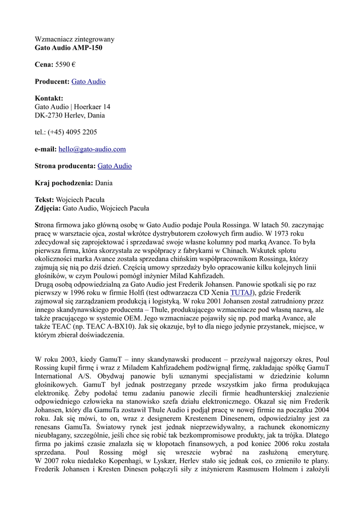 Wzmacniacz zintegrowany Gato Audio AMP-150 Cena: 5590 € Producent: Gato Audio Kontakt: Gato Audio | Hoerkaer 14 DK-2730 Herlev, Dania tel.: (+45) 4095 2205 e-mail: [email protected] Strona producenta: Gato Audio Kraj pochodzenia: Dania Tekst: Wojciech Pacuła Zdjęcia: Gato Audio, Wojciech Pacuła Strona firmowa jako główną osobę w Gato Audio podaje Poula Rossinga. W latach 50. zaczynając pracę w warsztacie ojca, został wkrótce dystrybutorem czołowych firm audio. W 1973 roku zdecydował się zaprojektować i sprzedawać swoje własne kolumny pod marką Avance. To była pierwsza firma, która skorzystała ze współpracy z fabrykami w Chinach. Wskutek splotu okoliczności marka Avance została sprzedana chińskim współpracownikom Rossinga, którzy zajmują się nią po dziś dzień. Częścią umowy sprzedaży było opracowanie kilku kolejnych linii głośników, w czym Poulowi pomógł inżynier Milad Kahfizadeh. Drugą osobą odpowiedzialną za Gato Audio jest Frederik Johansen. Panowie spotkali się po raz pierwszy w 1996 roku w firmie Holfi (test odtwarzacza CD Xenia TUTAJ), gdzie Frederik zajmował się zarządzaniem produkcją i logistyką. W roku 2001 Johansen został zatrudniony przez innego skandynawskiego producenta – Thule, produkującego wzmacniacze pod własną nazwą, ale także pracującego w systemie OEM. Jego wzmacniacze pojawiły się np. pod marką Avance, ale także TEAC (np. TEAC A-BX10). Jak się okazuje, był to dla niego jedynie przystanek, miejsce, w którym zbierał doświadczenia. W roku 2003, kiedy GamuT – inny skandynawski producent – przeżywał najgorszy okres, Poul Rossing kupił firmę i wraz z Miladem Kahfizadehem podźwignął firmę, zakładając spółkę GamuT International A/S. Obydwaj panowie byli uznanymi specjalistami w dziedzinie kolumn głośnikowych. GamuT był jednak postrzegany przede wszystkim jako firma produkująca elektronikę. Żeby podołać temu zadaniu panowie zlecili firmie headhunterskiej znalezienie odpowiedniego człowieka na stanowisko szefa działu elektronicznego. Okazał się nim Frederik Johansen, który dla GamuTa zostawił Thule Audio i podjął pracę w nowej firmie na początku 2004 roku. Jak się mówi, to on, wraz z designerem Krestenem Dinesenem, odpowiedzialny jest za renesans GamuTa. Światowy rynek jest jednak nieprzewidywalny, a rachunek ekonomiczny nieubłagany, szczególnie, jeśli chce się robić tak bezkompromisowe produkty, jak ta trójka. Dlatego firma po jakimś czasie znalazła się w kłopotach finansowych, a pod koniec 2006 roku została sprzedana. Poul Rossing mógł się wreszcie wybrać na zasłużoną emeryturę. W 2007 roku niedaleko Kopenhagi, w Lyskær, Herlev stało się jednak coś, co zmieniło te plany. Frederik Johansen i Kresten Dinesen połączyli siły z inżynierem Rasmusem Holmem i założyli zupełnie nową firmę Gato Audio, a w 2009 Poul został jej współwłaścicielem i dyrektorem generalnym. Proszę zwrócić uwagę na to, że w zespole znaleźli się weterani skandynawskiej sceny audio – przede wszystkim inżynierowie, ale także designer. Wystarczy rzut oka na testowany wzmacniacz AMP-150 , żeby wiedzieć, że miał on duży udział w efekcie końcowym i że firma nie liczyła się zbytnio z kosztami. Miał po prostu powstać wzmacniacz, który świetnie gra i który świetnie wygląda. „Mission Accomplished”! Dodajmy, że za kolumny GA odpowiedzialny jest dobry znajomy Frederika z czasów GamuTa Milad Kahfizadeh, który po opuszczeniu tej firmy przez jakiś czas pracował jako szef działu aplikacji i inżynier firmy Tymphany (Vifa, Peerless and Scan-Speak), skąd trafił do Gato Audio. Testowany wzmacniacz INT-150 to cudowne dziecko Frederika Johansena. Wygląda po prostu obłędnie – zaoblone krawędzie, drewniany, wcale nie obciachowy dodatek, mlecznobiały wyświetlacz i znakomity pilot – to tak w skrócie. Pomimo niewielkiej obudowy jego moc jest nadzwyczaj wysoka – to 150 W przy 8 Ω i 250 W przy 4 Ω. Wzmacniacz ma nietypowe wskaźniki opisujące wejścia, dopiero na tylnej ściance są one wytłumaczone. Jest nieźle wyposażony, bo ma wyjścia z przedwzmacniacza RCA i XLR, takież wejścia, a jedno z wejść można zamienić na tryb „unity gain” i wykorzystać wzmacniacz w systemie kina domowego. Warto także zwrócić uwagę na jedną, niezwykle przydatną funkcję, nazwaną „heat”. Chodzi w niej o to, aby jak najszybciej doprowadzić tranzystory końcowe do ich właściwej temperatury. To wstępne wygrzewanie zabiera zwykle 2 godziny, po którym to czasie stabilizują się prądy i napięcia, a zniekształcenia ustalają na założonym poziomie. Żeby to maksymalnie przyspieszyć, po naciśnięciu odpowiedniego guzika wzmacniacz przepuszcza przez tranzystory końcowe duży prąd, który je szybko nagrzewa. Cała procedura trwa nie dwie godziny, a 10-15 minut. Raj dla audiofila, czyli typu obsesyjnokompulsywnego… ODSŁUCH Podczas odsłuchów korzystałem z następujących płyt: • • • • • • • • • • • Depeche Mode, Hole To Feed/Fragile Tension, Mute Records, CDBONG42, MS CD. Donald Byrd, The Cat Walk, Blue Note/Audio Wave, AWMXR-0009, XRCD24. Jan Bokszczanin, Komeda – Inspirations, Zakłady Płytowe, ZP 140770-09, gold-CD. Miles Davis, Seven Steps To Heaven, Columbia/Analogue Productions, CAPJ 8851 SA, SACD/CD. Norah Jones, …Featuring, Blue Note, 09868 2, CD. Suzanne Vega, Close-Up, Vol 1. Love Songs, Amanuensis Productions/Cooking Vinyl, COOKCD521, CD. Stereo Sound Reference Record. Jazz&Vocal, Stereo Sound, SSRR4, SACD/CD. Laurie Anderson, Homeland, Nonesuch, 524055-2, CD+DVD; recenzja TUTAJ. Savage, Tonight, Extravaganza Publishing Srl/Klub80, CD001, 25th Anniversary Limited Edition, CD; recenzja TUTAJ. Cassandra Wilson, Silver Pony, Blue Note, 29752, CD. Yoko Ono, Yes, I‘m A Witch, Astralwerks, ASW79287, CCD; recenzja TUTAJ. Japońskie wersje płyt dostępne na CD Japan. INT-150 to wzmacniacz bez