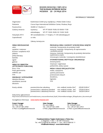 ROOMS MOSCOW / MIFS 2014 THE RUSSIAN INTERIOR SHOW MOSKWA 20 - 24 MAJA 2014 INFORMACJE TARGOWE Organizator Koelnmesse GmbH przy współpracy z Media Globe Crokus Położenie Crocus Expo International Exhibition Center, Moskwa, Rosja Powierzchnia 34.000 m2, Pawilon 3 Godziny otwarcia wystawcy WT-PT 09.00-19.00; SO 09.00-17.00 odwiedzający WT-PT 10.00-18.00; SO 10.00-16.00 Statystyka 2013 367 przedsiębiorstw z 11 krajów, 21.120 odwiedzających Częstotliwość co roku Zakresy tematyczne MEBLE MIESZKANIOWE salon sypialnia i materace kuchnia i urządzenia AGD jadalnia pokój dziecięcy łazienka ogród gabinet PRODUKCJA MEBLI I ELEMENTY WYKOŃCZENIA WNĘTRZ materiały i komponenty do produkcji mebli maszyny, materiały i komponenty do tapicerowania i produkcji pościeli maszyny, materiały i komponenty do produkcji elementów wykończenia wnętrz innowacyjne materiały i rozwiązania oświetleniowe STOWARZYSZENIA, INSTYTUCJE I ORGANIZACJE stowarzyszenia instytucje i organizacje politechniki, szkoły wyższe MEBLE DO OBIEKTÓW UŻYTECZNOŚCI PUBLICZNEJ biuro i inne hotel, gastronomia wellness, spa inne MEDIA I USŁUGI SPECJALISTYCZNE media, czasopisma systemy planowania przetwarzanie danych doradztwo, logistyka inne DEKORACJE I WYPOSAŻENIE tekstylia domowe oświetlenie, kominki akcesoria Koszty udziału powierzchnia bez zabudowy powierzchnia z zabudową Standard powierzchnia z zabudową Premium min. wielkość stoiska 24m2 min. wielkość stoiska 9m2 min. wielkość stoiska 12m2 220,00 EUR/m2 270,00 EUR/m2 320,00 EUR/m2 Dokumenty zgłoszeniowe http://www.roomsmoscow.com/media/rooms_moscow/download_6/pdf_54/anmeldeunterlagen_28/application_documents.pdf Szczegółowe informacje www.roomswww.rooms-moscow.com Project Manager Mr. Marc Zöllig Tel.: +49 221 821 2932 E-Mail: [email protected] Sales Manager Ms. Julia Degner Tel.: +49 221 821 2290 E-Mail: [email protected] Sales Manager Mr. Wilhelm Jülich Tel.: +49 221 821 2912 E-Mail: [email protected] Przedstawicielstwo Targów Koelnmesse w Polsce Sp.j. ul. Bagatela 11 lok. 7 · 00-585 Warszawa Tel. +48 22 848 80 00, 848 80 11 · Fax: +48 22 848 90 11 [email protected] · www.koelnmesse.pl