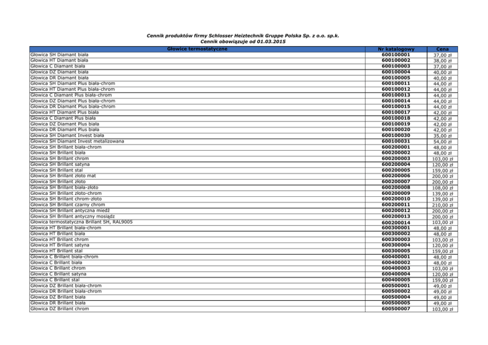 Cennik produktów firmy Schlosser Heiztechnik Gruppe Polska Sp. z o.o. sp.k. Cennik obowiązuje od 01.03.2015 Głowice termostatyczne Głowica Głowica Głowica Głowica Głowica Głowica Głowica Głowica Głowica Głowica Głowica Głowica Głowica Głowica Głowica Głowica Głowica Głowica Głowica Głowica Głowica Głowica Głowica Głowica Głowica Głowica Głowica Głowica Głowica Głowica Głowica Głowica Głowica Głowica Głowica Głowica Głowica Głowica Głowica Głowica Głowica Głowica Głowica Głowica Głowica SH Diamant biała HT Diamant biała C Diamant biała DZ Diamant biała DR Diamant biała SH Diamant Plus biała-chrom HT Diamant Plus biała-chrom C Diamant Plus biała-chrom DZ Diamant Plus biała-chrom DR Diamant Plus biała-chrom HT Diamant Plus biała C Diamant Plus biała DZ Diamant Plus biała DR Diamant Plus biała SH Diamant Invest biała SH Diamant Invest metalizowana SH Brillant biała-chrom SH Brillant biała SH Brillant chrom SH Brillant satyna SH Brillant stal SH Brillant złoto mat SH Brillant złoto SH Brillant biała-złoto SH Brillant złoto-chrom SH Brillant chrom-złoto SH Brillant czarny chrom SH Brillant antyczna miedź SH Brillant antyczny mosiądz termostatyczna Brillant SH, RAL9005 HT Brillant biała-chrom HT Brillant biała HT Brillant chrom HT Brillant satyna HT Brillant stal C Brillant biała-chrom C Brillant biała C Brillant chrom C Brillant satyna C Brillant stal DZ Brillant biała-chrom DR Brillant biała-chrom DZ Brillant biała DR Brillant biała DZ Brillant chrom Nr katalogowy 600100001 600100002 600100003 600100004 600100005 600100011 600100012 600100013 600100014 600100015 600100017 600100018 600100019 600100020 600100030 600100031 600200001 600200002 600200003 600200004 600200005 600200006 600200007 600200008 600200009 600200010 600200011 600200012 600200013 600200014 600300001 600300002 600300003 600300004 600300005 600400001 600400002 600400003 600400004 600400005 600500001 600500002 600500004 600500005 600500007 Cena 37,00 zł 38,00 zł 37,00 zł 40,00 zł 40,00 zł 44,00 zł 44,00 zł 44,00 zł 44,00 zł 44,00 zł 42,00 zł 42,00 zł 42,00 zł 42,00 zł 35,00 zł 54,00 zł 48,00 zł 48,00 zł 103,00 zł 120,00 zł 159,00 zł 200,00 zł 200,00 zł 108,00 zł 139,00 zł 139,00 zł 210,00 zł 200,00 zł 200,00 zł 103,00 zł 48,00 zł 48,00 zł 103,00 zł 120,00 zł 159,00 zł 48,00 zł 48,00 zł 103,00 zł 120,00 zł 159,00 zł 49,00 zł 49,00 zł 49,00 zł 49,00 zł 103,00 zł Głowica Głowica Głowica Głowica Głowica Głowica Głowica Głowica Głowica Głowica Głowica Głowica Głowica Głowica Głowica DR Brillant chrom DZ Brillant satyna DR Brillant satyna DZ Brillant stal DR Brillant stal SH Brillant Plus biała SH Brillant Plus biała-chrom SH Brillant Plus chrom SH /seria limitowana / elektroniczna programowalna SH elektroniczna programowalna DZ termostatyczna Mini Brillant M30x1,5 Biała-Chrom termostatyczna Mini Brillant M30x1,5 Biała termostatyczna Mini Diamant M30x1,5 Biała termostatyczna Mini Brillant M30x1,5 RAL9005 Zawory termostatyczne 1/2x1/2 aksjalny 1/2x1/2 prosty 1/2x1/2 kątowy 1/2x1/2 osiowo prawy 1/2x1/2 osiowo lewy 1/2xM22x1,5 Aksjalny 1/2xM22x1,5 prosty 1/2xM22x1,5 kątowy 1/2xM22x1,5 osiowo prawy 1/2xM22x1,5 osiowo lewy 1/2x1/2 z nastawą skokową prosty 1/2x1/2 z nastawą skokową kątowy Zawór Zawór Zawór Zawór Zawór Zawór Zawór Zawór Zawór Zawór Zawór Zawór termostatyczny termostatyczny termostatyczny termostatyczny termostatyczny termostatyczny termostatyczny termostatyczny termostatyczny termostatyczny termostatyczny termostatyczny DN15 DN15 DN15 DN15 DN15 DN15 DN15 DN15 DN15 DN15 DN15 DN15 Zawór Zawór Zawór Zawór Zawór Zawór Zawór Zawór powrotny powrotny powrotny powrotny powrotny powrotny powrotny powrotny 3/8x3/8 kątowy 1/2x1/2 kątowy 3/8x3/8 prosty 1/2x1/2 prosty 1/2xM22x1,5 kątowy 1/2xM22x1,5 kątowy 1/2x15mm kątowy do wlutowania 1/2x15mm prosty do wlutowania Zawór Zawór Zawór Zawór Zawór Zawór Zawór Zawór grzejnikowy grzejnikowy grzejnikowy grzejnikowy grzejnikowy grzejnikowy grzejnikowy grzejnikowy Zawory powrotne DN10 DN15 DN10 DN15 DN15 DN15 DN15 DN15 z z z z z z z z pokrętłem pokrętłem pokrętłem pokrętłem pokrętłem pokrętłem pokrętłem pokrętłem gładkim gładkim gładkim gładkim gładkim gładkim gładkim gładkim DN10 DN15 DN10 DN15 DN15 DN15 DN15 DN15 Zawory grzejnikowe z pokrętłem ręcznym 3/8x3/8 kątowy 1/2x1/2 kątowy 3/8x3/8 prosty 1/2x1/2 prosty 1/2xM22x1,5 kątowy 1/2xM22x1,5 prosty 1/2x15mm kątowy do wlutowania 1/2x15mm prosty do wlutowania 600500008 600500009 600500010 600500011 600500012 600600005 600600006 600600009 600600010 601100001 601100004 601100030 601100031 601100033 601100039 103,00 zł 120,00 zł 120,00 zł 159,00 zł 159,00 zł 46,00 zł 46,00 zł 99,00 zł 31,00 zł 180,00 zł 180,00 zł 53,50 zł 53,50 zł 39,50 zł 137,00 zł Nr katalogowy 601200003 601200004 601200005 601200006 601200007 601200008 601200009 601200010 601200011 601200012 601200014 601200015 Cena 42,90 zł 38,80 zł 38,80 zł 42,90 zł 42,90 zł 42,90 zł 38,80 zł 38,80 zł 41,90 zł 41,90 zł 38,80 zł 38,80 zł Nr katalogowy 601300001 601300002 601300003 601300004 601300006 601300008 601300012 601300014 Cena 17,50 zł 17,50 zł 17,50 zł 17,50 zł 17,50 zł 17,50 zł 17,50 zł 17,50 zł Nr katalogowy 601400001 601400002 601400003 601400004 601400006 601400008 601400012 601400014 Cena 28,60 zł 28,60 zł 28,60 zł 28,60 zł 28,60 zł 28,60 zł 28,60 zł 28,60 zł Zawór Zawór Zawór Zawór Zawór Zawór Zawór Zawór grzejnikowy grzejnikowy grzejnikowy grzejnikowy grzejnikowy grzejnikowy grzejnikowy grzejnikowy Armatura Armatura Armatura Armatura Armatura Armatura z z z z z z z z pokrętłem pokrętłem pokrętłem pokrętłem pokrętłem pokrętłem pokrętłem pokrętłem przyłączeniowa przyłączeniowa przyłączeniowa przyłączeniowa przyłączeniowa przyłączeniowa DN10 DN15 DN10 DN15 DN15 DN15 DN15 DN15 3/4x3/4 3/4x3/4